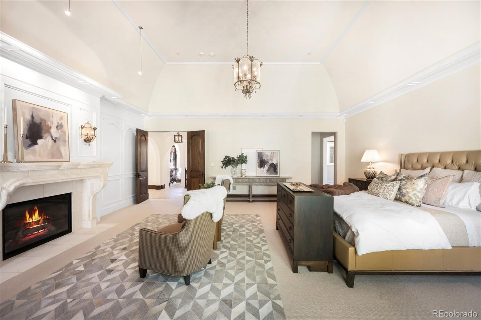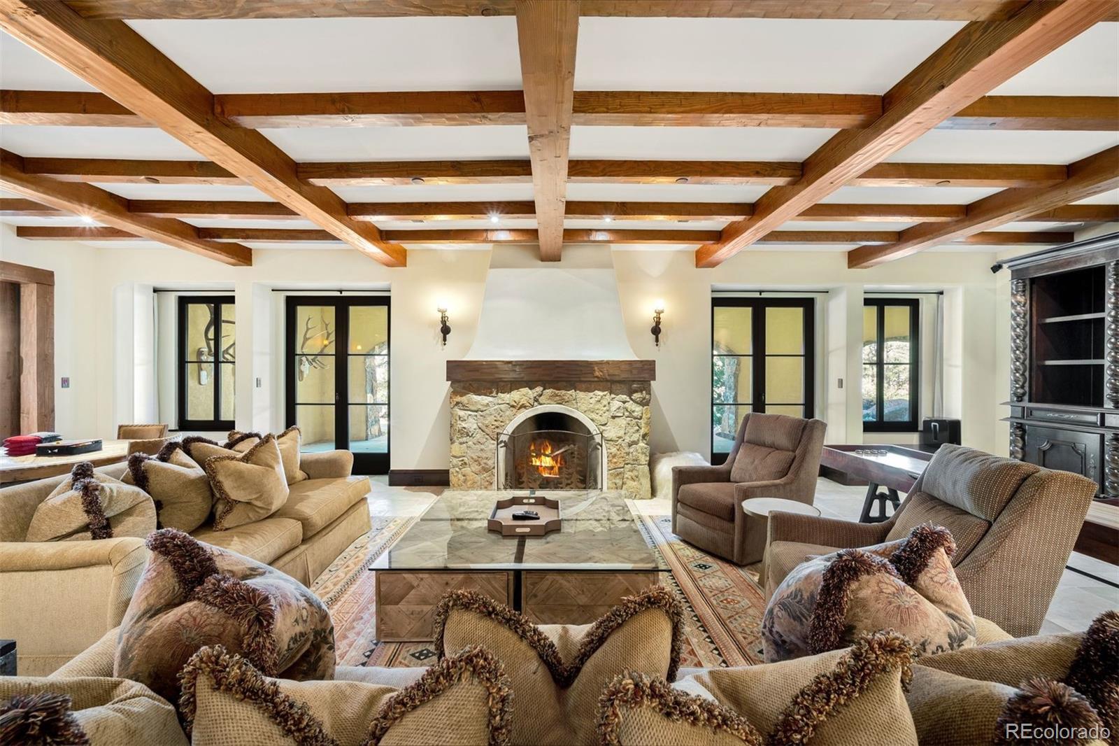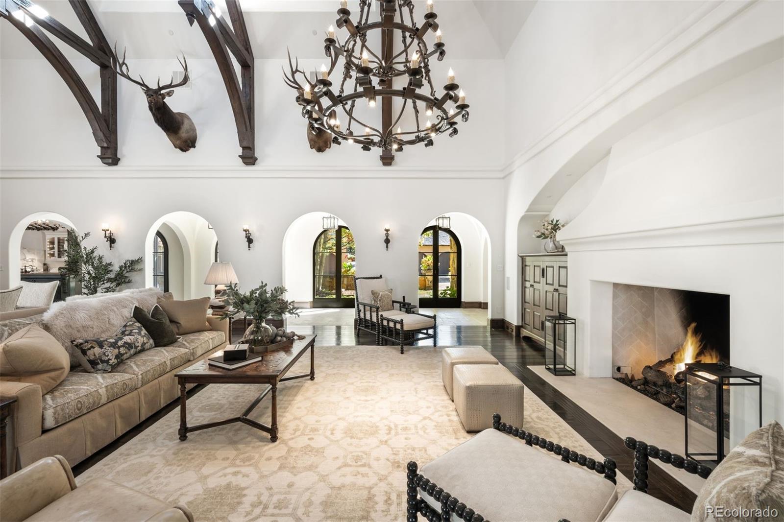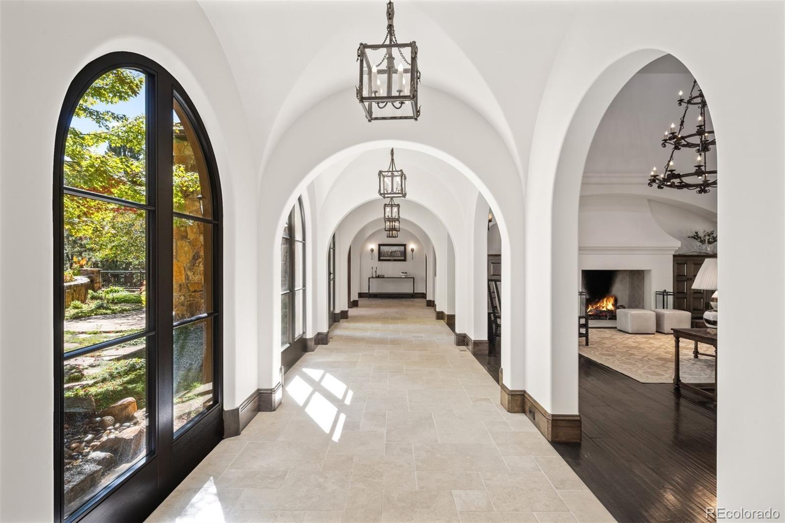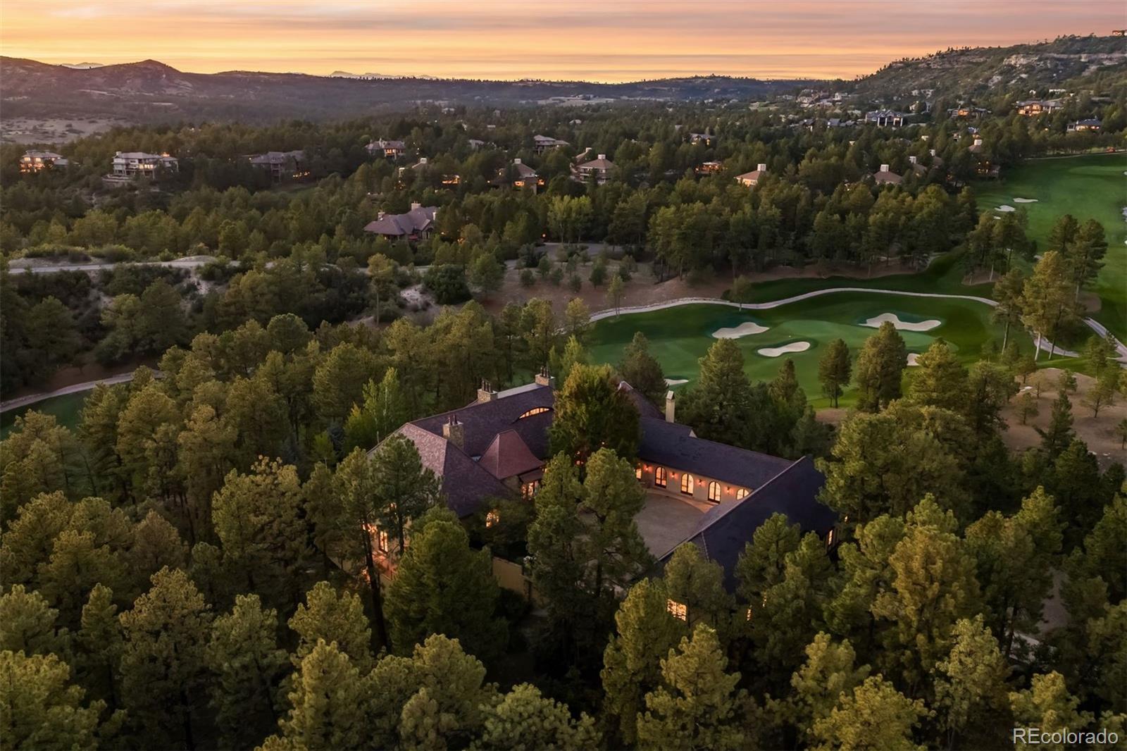 Perched along the 8th green of the exclusive Castle Pines Golf Course, One Elk Pointe embodies timeless sophistication andEuropean-inspired living. A graceful stone bridge and porte-cochère lead you to this elegant estate, where every detail hasbeen curated for those who appreciate craftsmanship, comfort, and quiet grandeur. Inside, sunlight spills across soaringceilings, exposed beams, and hand-laid tile floors. Walls of glass frame sweeping golf course and mountain vistas, creating a seamless connection between indoor elegance and outdoor serenity. At the heart of the home, an exceptional chef’s kitchen delights with dual islands, a farmhouse sink, and top-tier appliances from Sub-Zero, Wolf, La Cornue, and Thermador. A hidden refrigerator, butler’s pantry, and wine area enhance the home’s effortless luxury, while a cozy hearthdining room invites intimate gatherings beneath cathedral ceilings. The formal living and dining rooms span 36 feet, anchored by twin limestone fireplaces and opening to an expansive upper deck where a stone fireplace and treetop views offer an enchanting backdrop for evening soirées. The main-floor primary suite defines refined tranquility—featuring a limestone fireplace, spa-inspired bath, dual vanities, soaking tub, and two custom closets. Two exquisite offices and a marble-topped mudroom blend practicality with polish. The lower level is designed for leisure and connection, offering a full bar, spacious entertaining area, gym with steam shower, and three en-suite bedrooms. Outdoors, multiple terraces invite alfresco living—a see-through fireplace, built-in grill, fire pit, and sunken hot tub all set against the dramatic beautyof Castle Pines. A rare harmony of European elegance and Colorado majesty, One Elk Pointe is more than a residence—it’sa lifestyle without compromise.