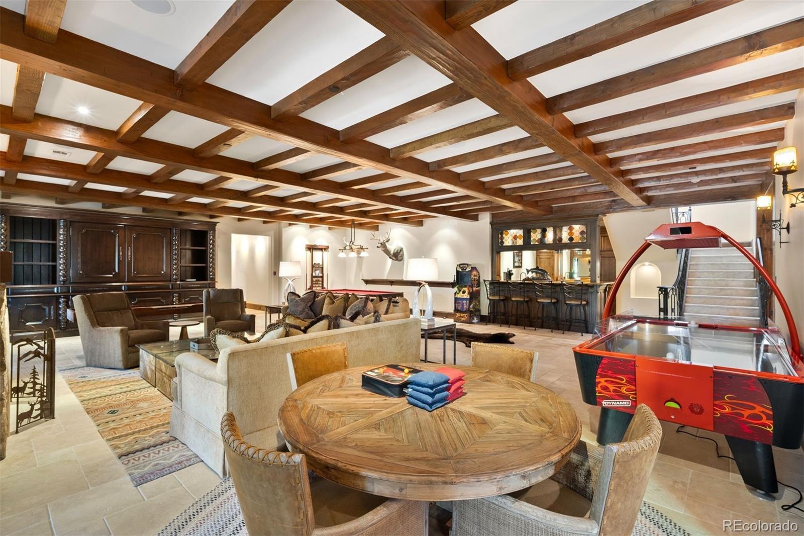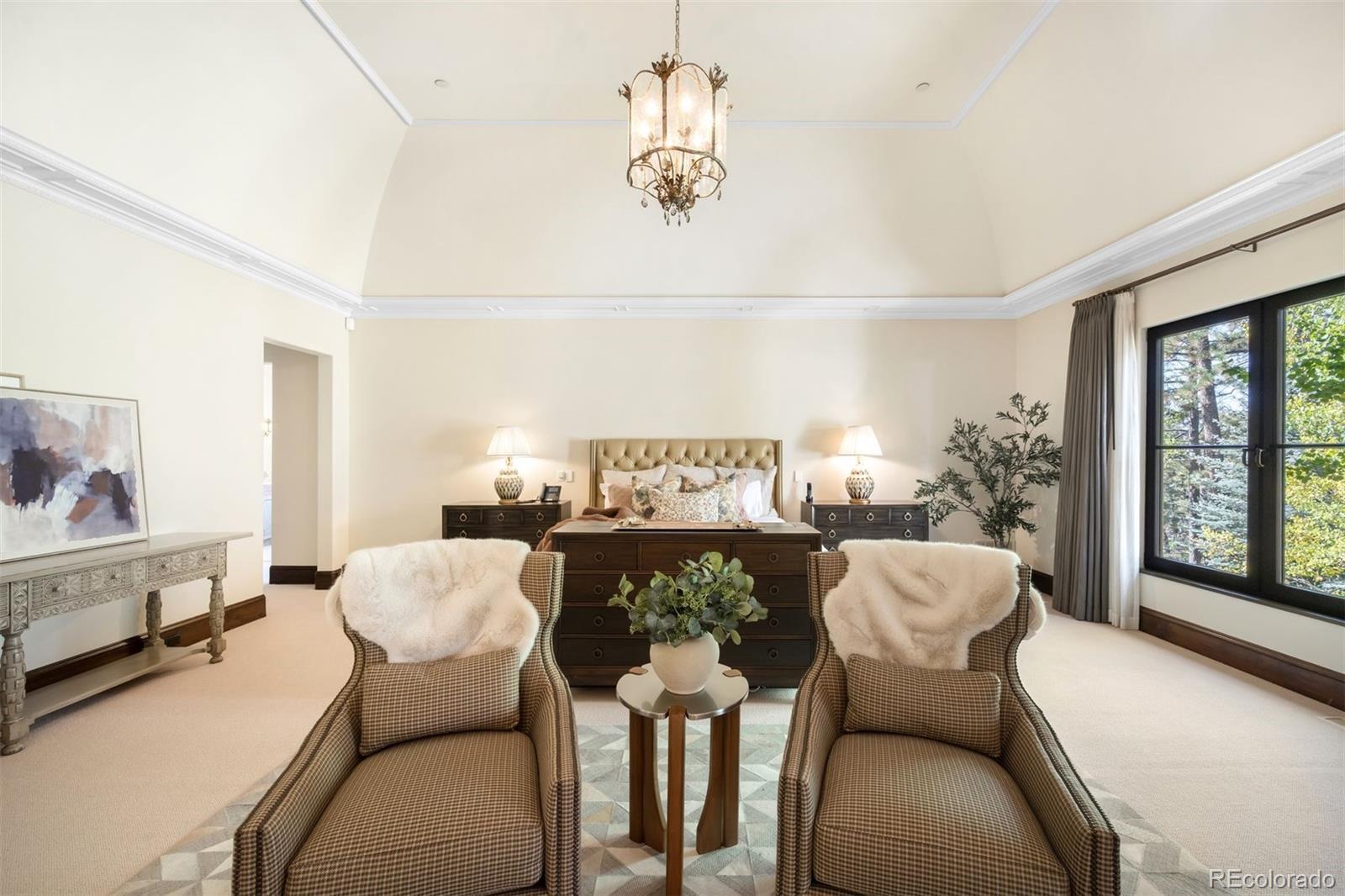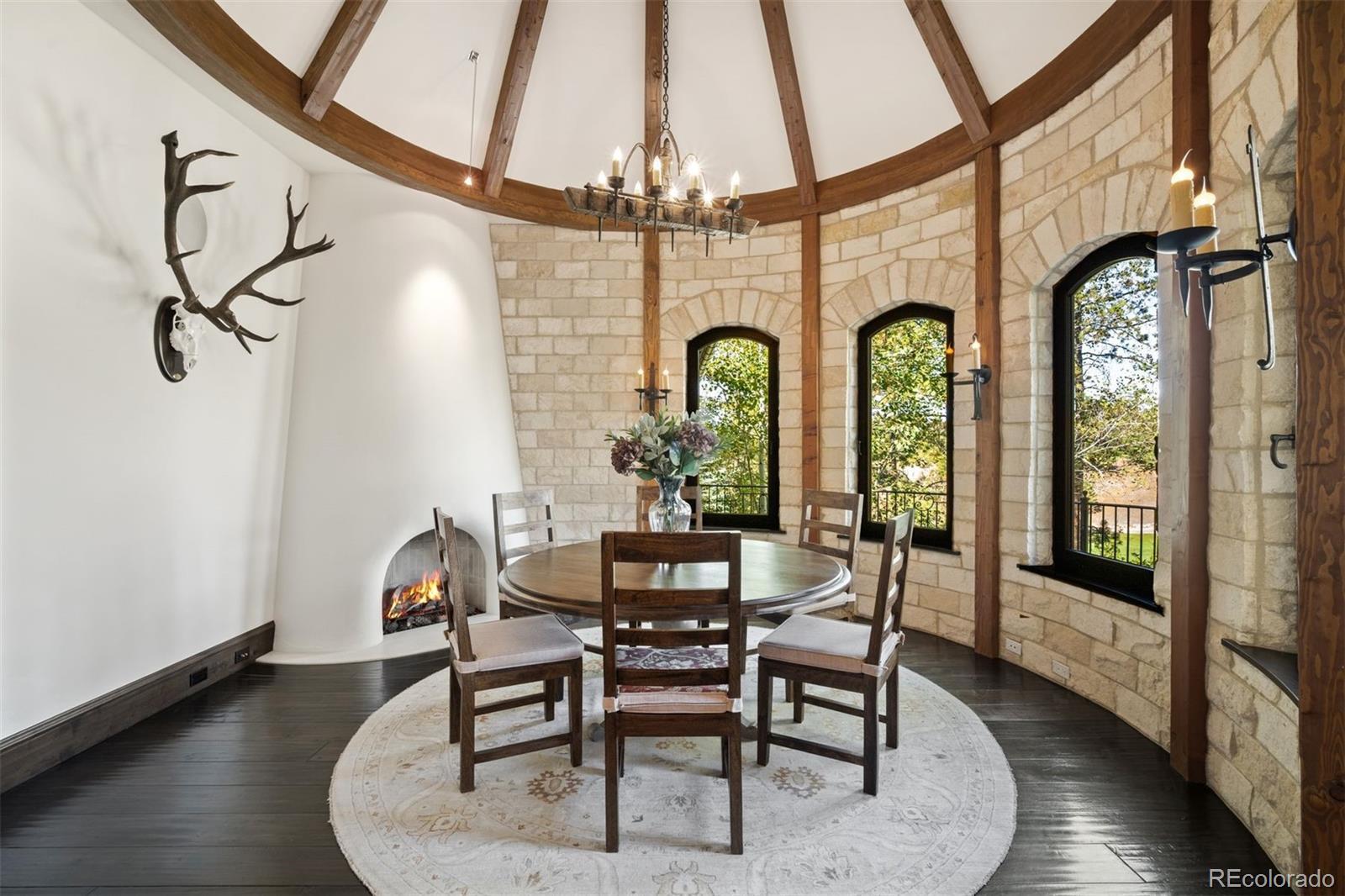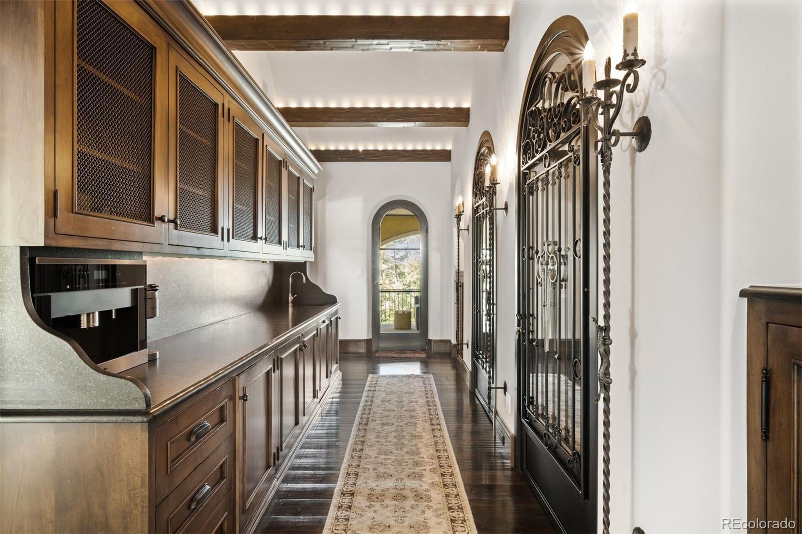 Perched along the 8th green of the exclusive Castle Pines Golf Course, One Elk Pointe embodies timeless sophistication andEuropean-inspired living. A graceful stone bridge and porte-cochère lead you to this elegant estate, where every detail hasbeen curated for those who appreciate craftsmanship, comfort, and quiet grandeur. Inside, sunlight spills across soaringceilings, exposed beams, and hand-laid tile floors. Walls of glass frame sweeping golf course and mountain vistas, creating a seamless connection between indoor elegance and outdoor serenity. At the heart of the home, an exceptional chef’s kitchen delights with dual islands, a farmhouse sink, and top-tier appliances from Sub-Zero, Wolf, La Cornue, and Thermador. A hidden refrigerator, butler’s pantry, and wine area enhance the home’s effortless luxury, while a cozy hearthdining room invites intimate gatherings beneath cathedral ceilings. The formal living and dining rooms span 36 feet, anchored by twin limestone fireplaces and opening to an expansive upper deck where a stone fireplace and treetop views offer an enchanting backdrop for evening soirées. The main-floor primary suite defines refined tranquility—featuring a limestone fireplace, spa-inspired bath, dual vanities, soaking tub, and two custom closets. Two exquisite offices and a marble-topped mudroom blend practicality with polish. The lower level is designed for leisure and connection, offering a full bar, spacious entertaining area, gym with steam shower, and three en-suite bedrooms. Outdoors, multiple terraces invite alfresco living—a see-through fireplace, built-in grill, fire pit, and sunken hot tub all set against the dramatic beautyof Castle Pines. A rare harmony of European elegance and Colorado majesty, One Elk Pointe is more than a residence—it’sa lifestyle without compromise.