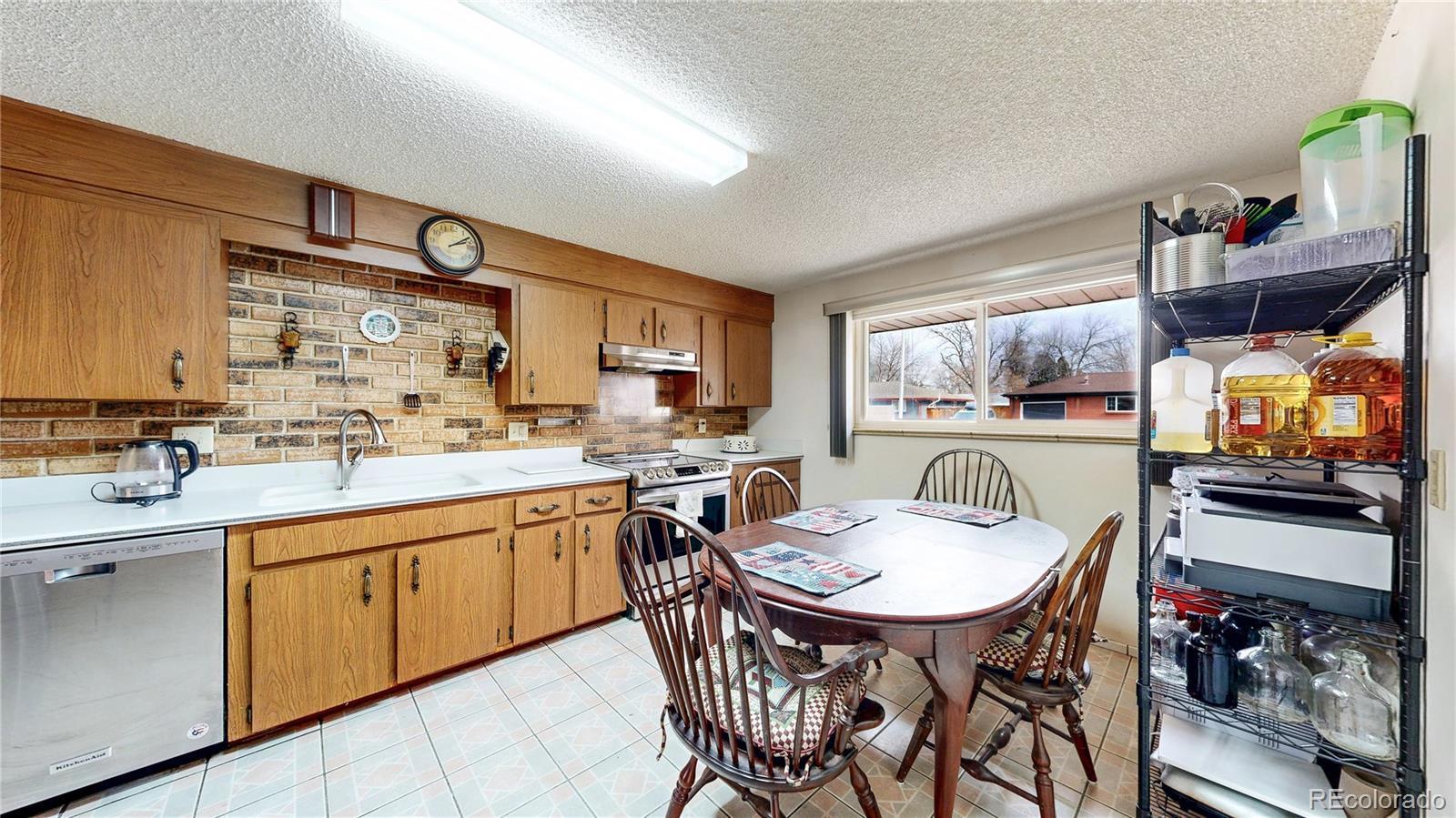 Classic brick ranch style home in the highly desired Koldeway neighborhood. A stroll through this 4-bed, 2-bath 2,000+ SF home reveals hardwood floors, newer windows throughout, open floor plan, functional kitchen with stainless appliances, Corian countertop, lots of cabinet storage, eat-in-kitchen space. Main floor also features two spacious bedrooms with natural light, ceiling fans, end of the hall linen closet, 3/4 bath and granite countertop sink. Downstairs offers a finished basement with 2 more non-conforming bedrooms and a 1/2 bath that is plumbed to be a 3/4 with shower. The mechanical/ laundry room provides newer HVAC, water heater, included with washer and dryer and plenty of storage. This home has good bones with a variety of newer upgrades from the AC, newer roof, newer oversized carport, plus 1 car attached garage, large fully fenced backyard, fenced front with sprinkler in front and back, plus 3 small side gardens. Close to the incredible Ralston central park, Ralston creek trails, recreation, schools, shopping, dining and transportation. A home in need of a little love with lots of potential in a wonderful and quiet community.