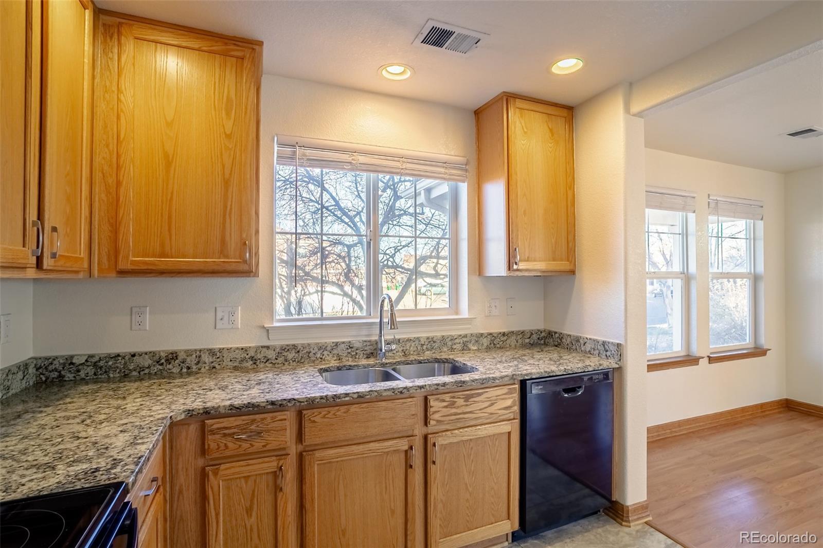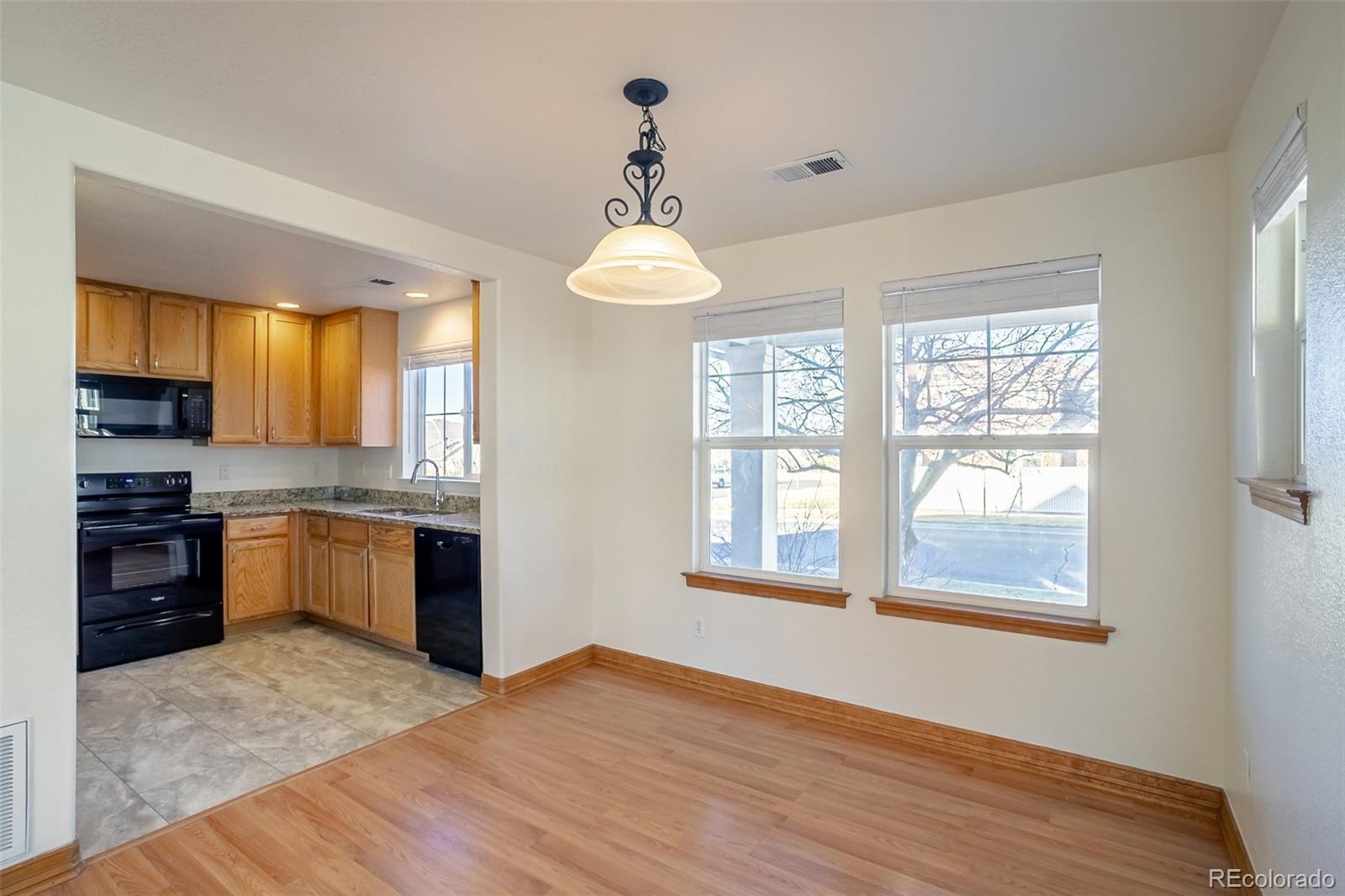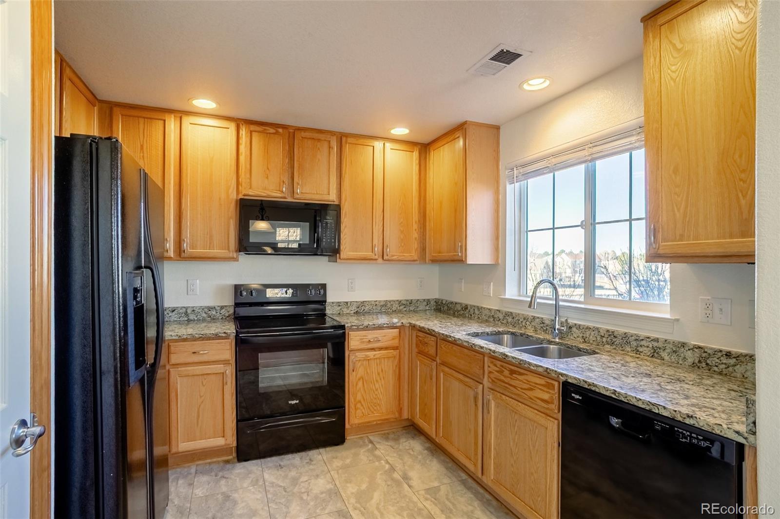 Beautiful unit in sought after Somerset Village! Professionally managed development with beautiful Panorama Park across the side street providing green spaces, a playground, bbq grills, a pool and tennis courts. The townhome is an end unit on a corner lot. First floor has attractive, easy-living, easy-cleaning laminate and luxury vinyl plank flooring. Open floorplan with great natural light. Matching, faux wood blinds on all windows throughout the unit. Kitchen has granite countertops, black appliances, an abundance of cabinets, contemporary silver cabinet pulls, and a pantry. Dishwasher and oven/range are brand new. All bedrooms are upstairs for communal family living. Primary suite is slightly separated from the other bedrooms, offers a good-sized walk-in closet, an ensuite bath with double sinks, and a glassed shower. Two secondary bedrooms are spacious and share a sizeable, full bath. An upstairs laundry provides brand new Whirlpool, full size washer and dryer that stay. Hot water heater is 15 months old. Attached two car garage with exterior manual pad to operate the garage door. Garage opens to a concrete alley maintained by the HOA. There is a small, private patio that is fully fenced, sprinklered and accessed from the main floor den. The patio has a gate to the back alley, so dog walking or jogging has direct access to Panorama Park 1/4 block away. Close to Anschutz Medical Center, Buckley Air Force Base, DTC, Town Center at Aurora and Aurora Sports Park. Within walking distance, but visually protected from Safeway and Starbucks. Call the listing agent for special financing. Choose from a top ranked lender that charges a total closing package of $1,697 or a strong lender that will give you 1% of the loan value to use to pay closing costs or reduce your interest rate. Either way - YOU WIN. It does make a difference who your lender is. HOA INCLUDES ROOF REPLACEMENT! UNHEARD OF THESE DAYS!