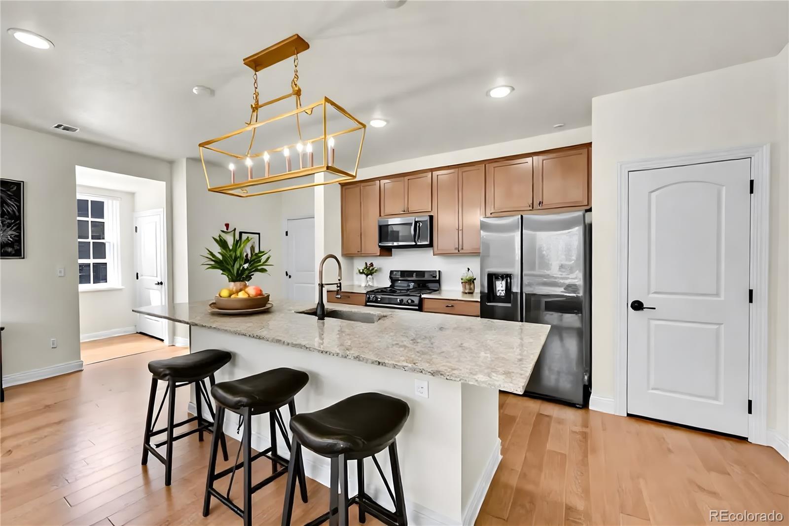 Welcome to Buffalo Run! A stunning corner end unit townhome offering refined, low maintenance luxury in a prime location. Built in 2021 and beautifully upgraded throughout, this 3-bedroom, 2.5-bath home feels brand new and is thoughtfully designed for both everyday living and entertaining. The open-concept main level is warm and inviting, featuring a gourmet chef’s kitchen with quartz countertops, custom cabinetry, soft-close drawers, sleek black stainless-steel appliances, a gas range with griddle, and an oversized island perfect for gathering and dining. Sunlight fills the space, creating an airy, modern feel throughout. The expansive primary suite is a true retreat, complete with a spa-inspired en suite bathroom showcasing dual quartz vanities and an oversized, elegantly tiled walk-in shower. Additional highlights include an oversized 2+ car garage that is insulated and drywalled — offering exceptional storage and convenience. No more parking outside in the snow. Ideally situated in a highly desirable neighborhood, you can walk to Buffalo Run Golf Course and nearby trails, enjoy quick access to Prairie Center shopping and dining (under 10 minutes), reach Denver International Airport in less than 15 minutes, and be downtown Denver in about 25 minutes. With its prime location and low-maintenance design, this home also presents exceptional potential as a short-term or long-term rental, making it a smart investment opportunity with strong and consistent demand. This is a rare opportunity to own a nearly new, beautifully upgraded home in one of the area’s most convenient and sought-after communities.