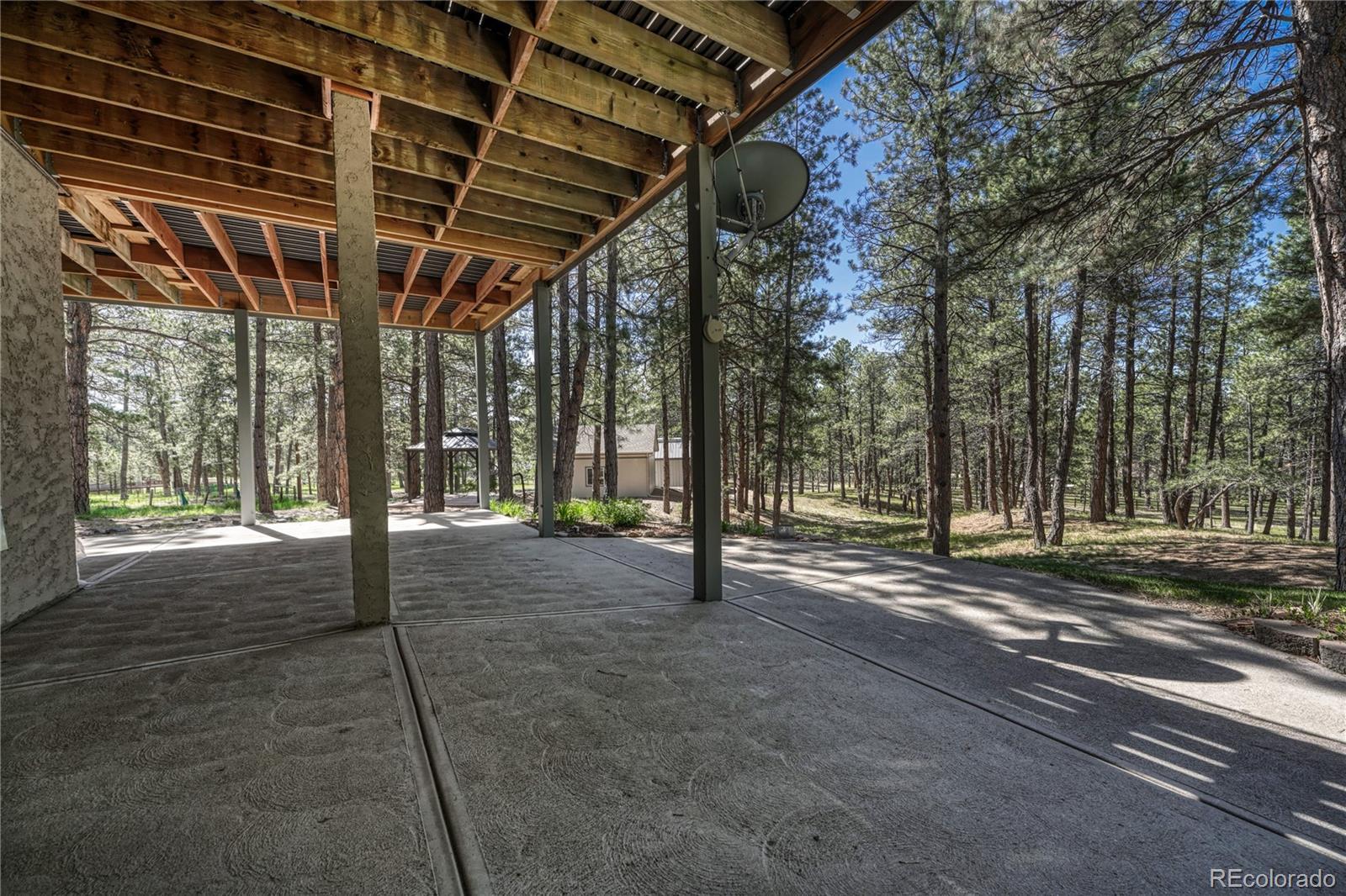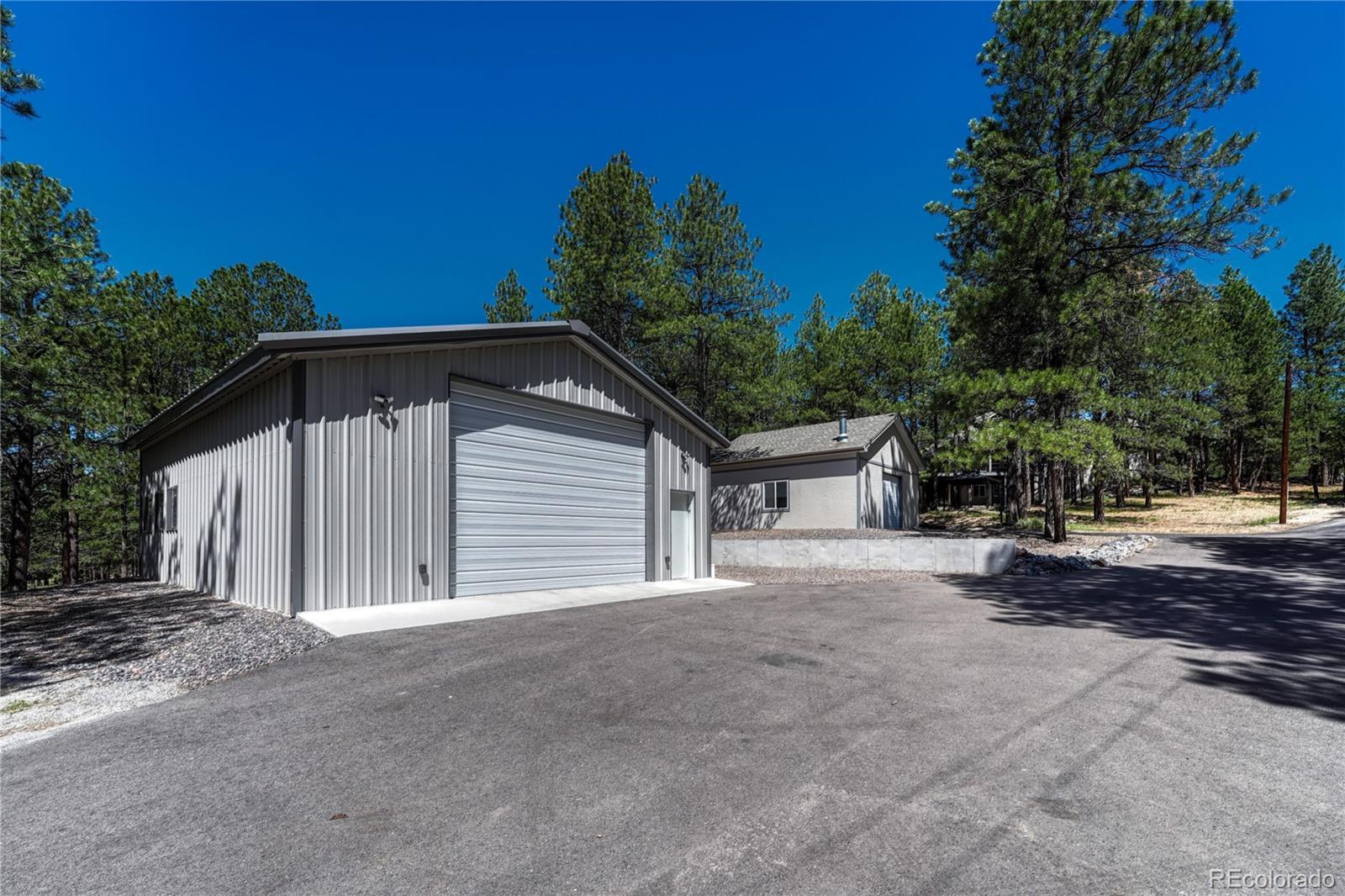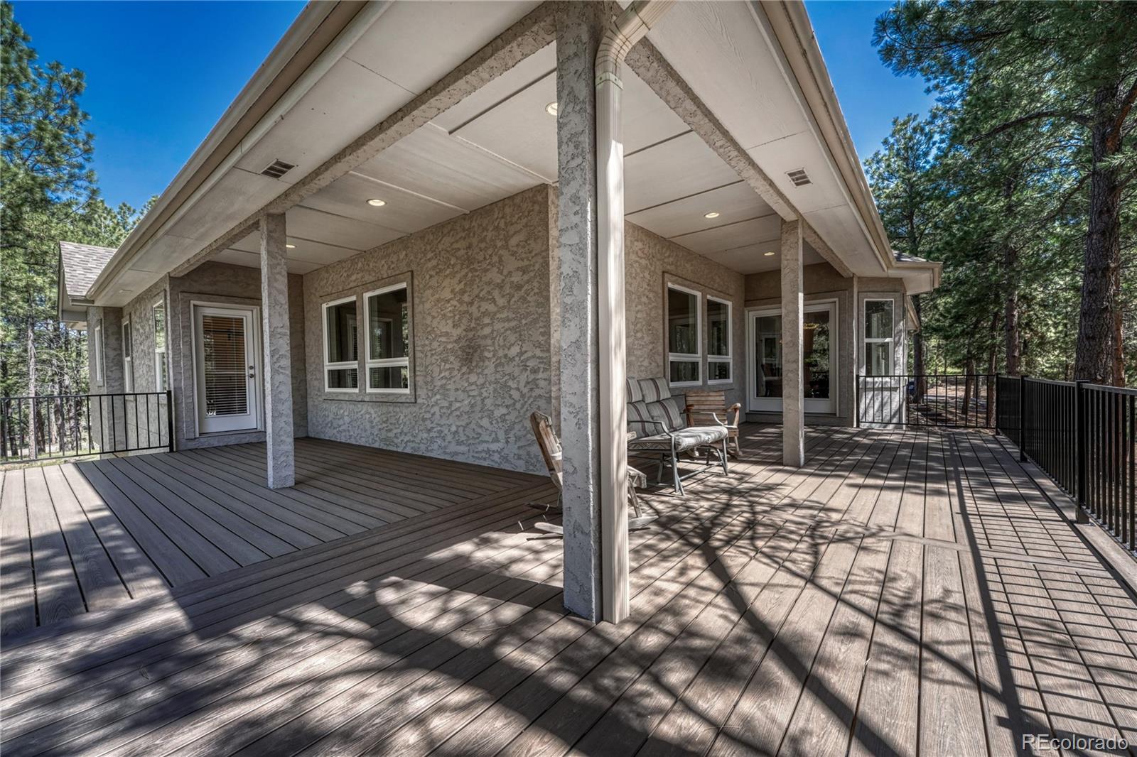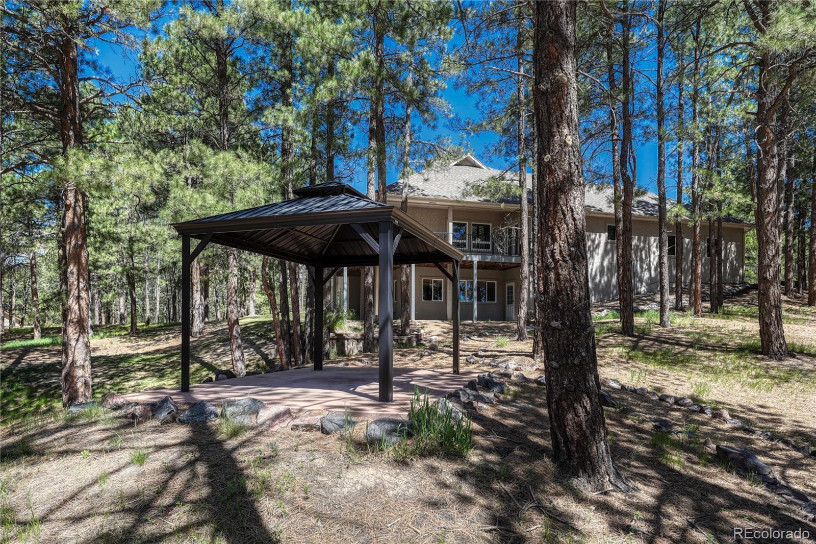 ***$100k PRICE DECREASE*** One story home with many recent upgrades throughout including rustic Brazilian Cherry hardwoods, travertine floors & kitchen back splash, slab granite counter tops, stained glass lighting fixtures, gas fireplace with a remarkable floor to ceiling surround, & 12' ceilings. Main level has 3 bedrooms, 3 bathrooms, formal dining area, gourmet kitchen, breakfast nook, sizable laundry room, and an impressive grand entrance/main living area. Large wrap around covered composite deck, finished walkout basement, and gazebo. Other items include 2 fully finished work shops/garages with cement floors, heat, electricity, lighting, insulation, & RV door, attached 3 vehicle garage plus additional parking on the lot. Primary suite has a 5 piece bathroom, walk-in closet, dual sink vanity, and walkout door to the deck. Basement has a carpeted 2nd living area, multi-purpose room with LVP flooring with many uses(workout room, craft room), bonus area perfect for a wine cellar, bedroom, bathroom, and plenty of storage. Two detached garages are fully finished with insulation, sheet rock, paint, concrete floors, garage door openers, storage cabinets, motion activated security lights, pellet heat stoves, individual electric sub panels, entrance doors, and have their own asphalt driveway. Other items include security system, computerized water purification system/softener, two newer water heaters (2020), furnace & A/C systems (2022), and recently replaced kitchen appliances. Largest garage was recently finished in 2024 and includes a 12' door, steel siding, and steel roof. Private, Quiet lot has lots of Ponderosa Pines and is minutes from downtown Elizabeth near CR 21 & Hwy 86.