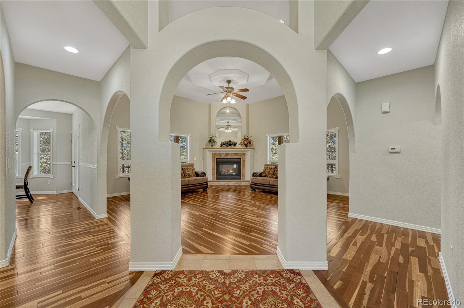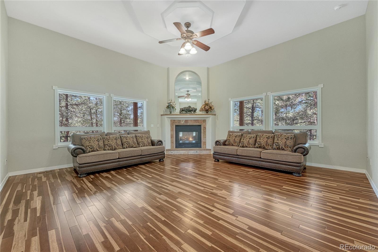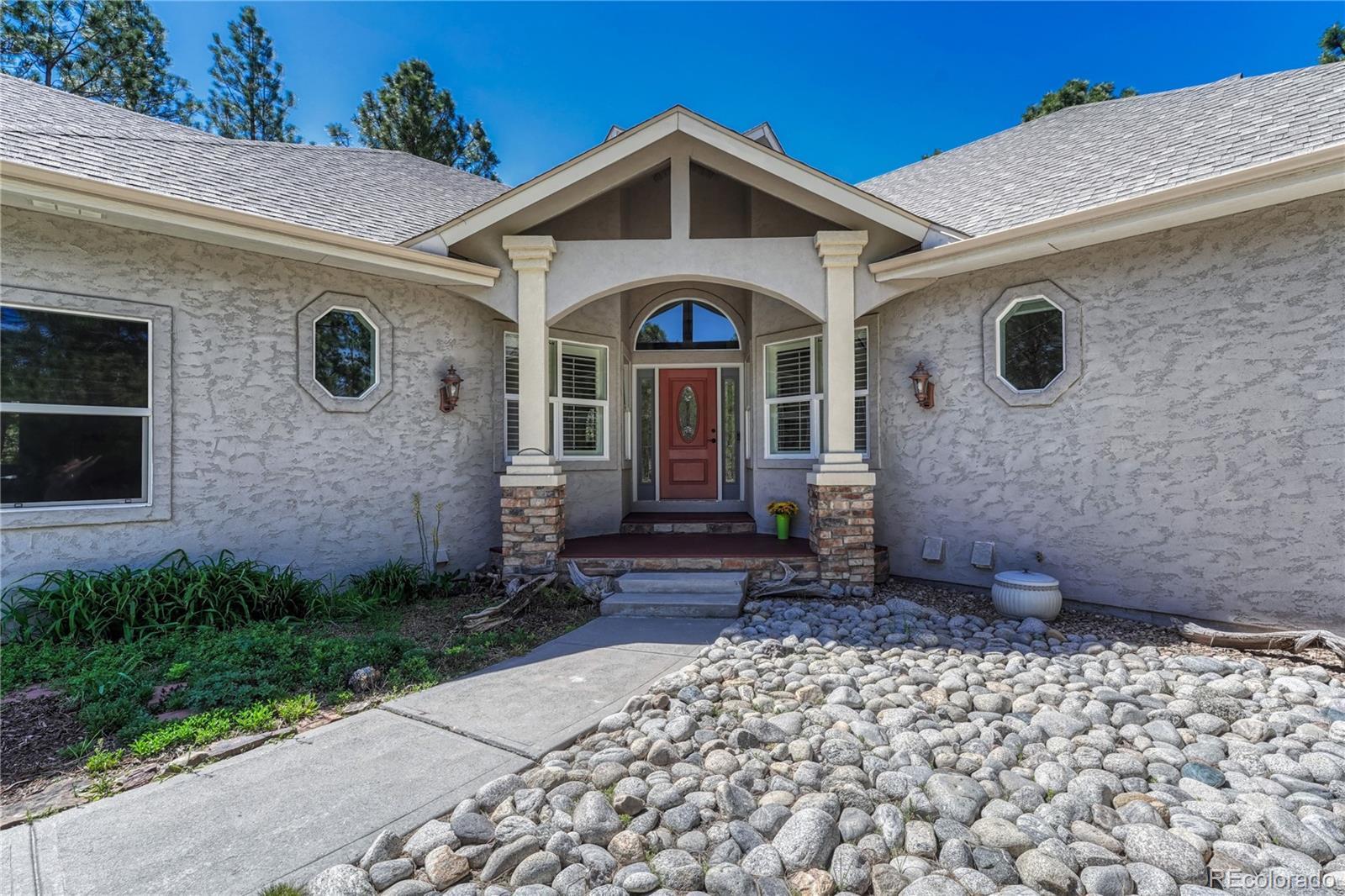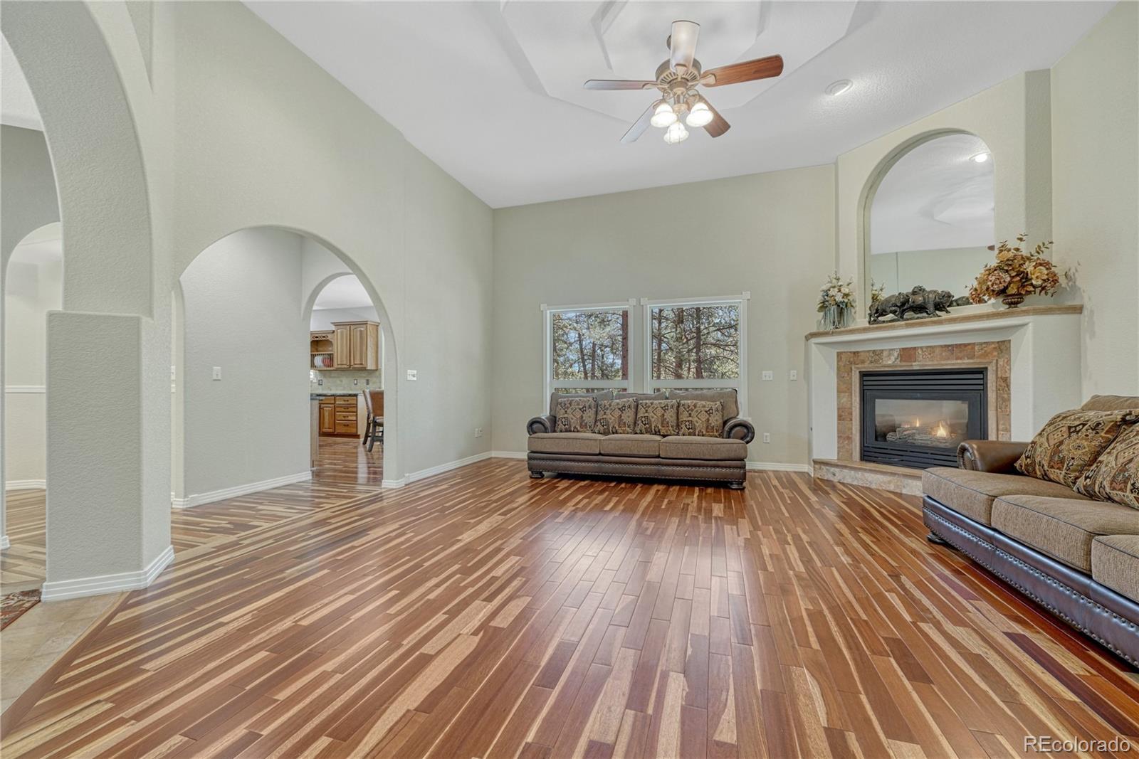 ***$100k PRICE DECREASE*** One story home with many recent upgrades throughout including rustic Brazilian Cherry hardwoods, travertine floors & kitchen back splash, slab granite counter tops, stained glass lighting fixtures, gas fireplace with a remarkable floor to ceiling surround, & 12' ceilings. Main level has 3 bedrooms, 3 bathrooms, formal dining area, gourmet kitchen, breakfast nook, sizable laundry room, and an impressive grand entrance/main living area. Large wrap around covered composite deck, finished walkout basement, and gazebo. Other items include 2 fully finished work shops/garages with cement floors, heat, electricity, lighting, insulation, & RV door, attached 3 vehicle garage plus additional parking on the lot. Primary suite has a 5 piece bathroom, walk-in closet, dual sink vanity, and walkout door to the deck. Basement has a carpeted 2nd living area, multi-purpose room with LVP flooring with many uses(workout room, craft room), bonus area perfect for a wine cellar, bedroom, bathroom, and plenty of storage. Two detached garages are fully finished with insulation, sheet rock, paint, concrete floors, garage door openers, storage cabinets, motion activated security lights, pellet heat stoves, individual electric sub panels, entrance doors, and have their own asphalt driveway. Other items include security system, computerized water purification system/softener, two newer water heaters (2020), furnace & A/C systems (2022), and recently replaced kitchen appliances. Largest garage was recently finished in 2024 and includes a 12' door, steel siding, and steel roof. Private, Quiet lot has lots of Ponderosa Pines and is minutes from downtown Elizabeth near CR 21 & Hwy 86.