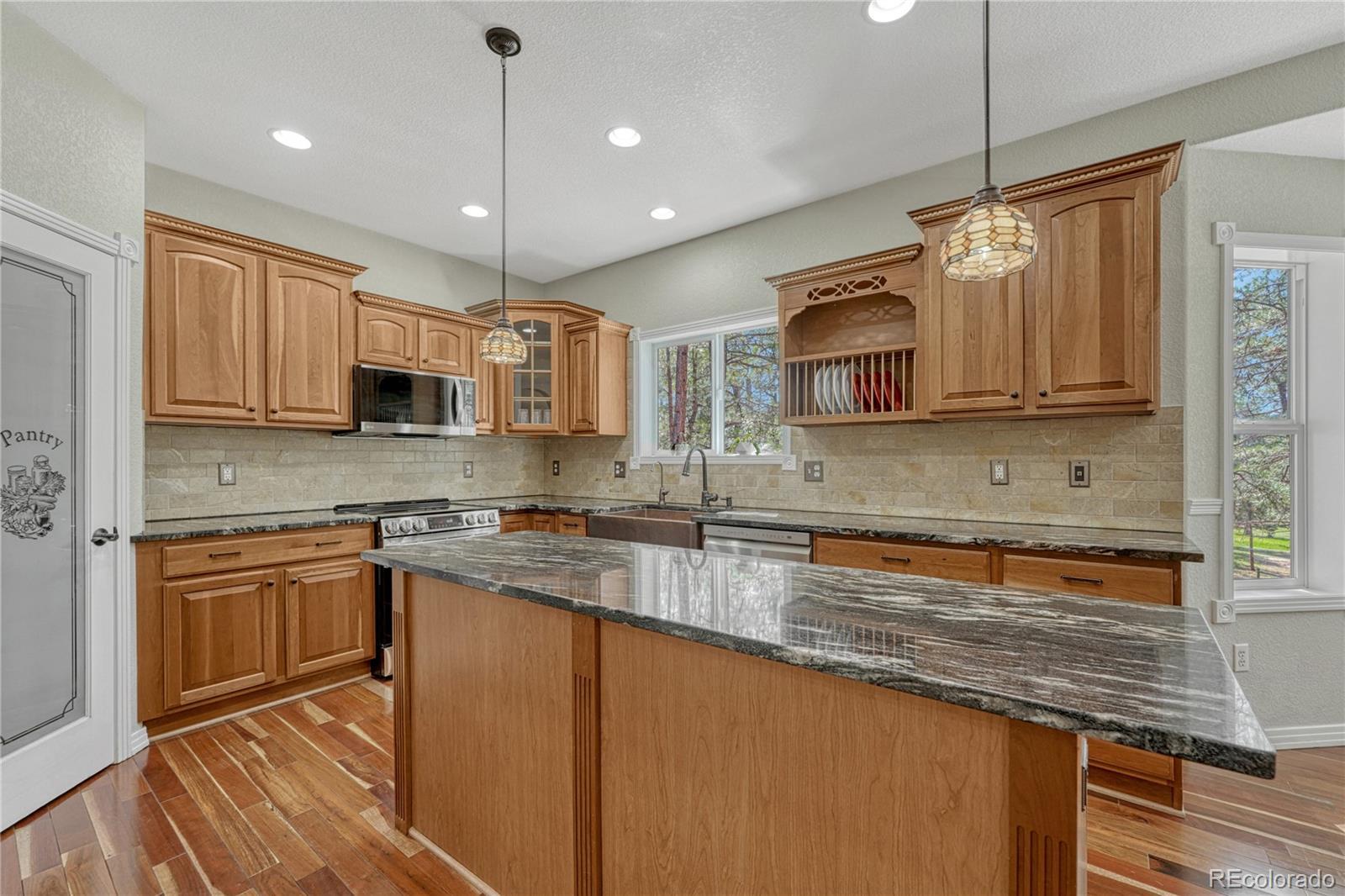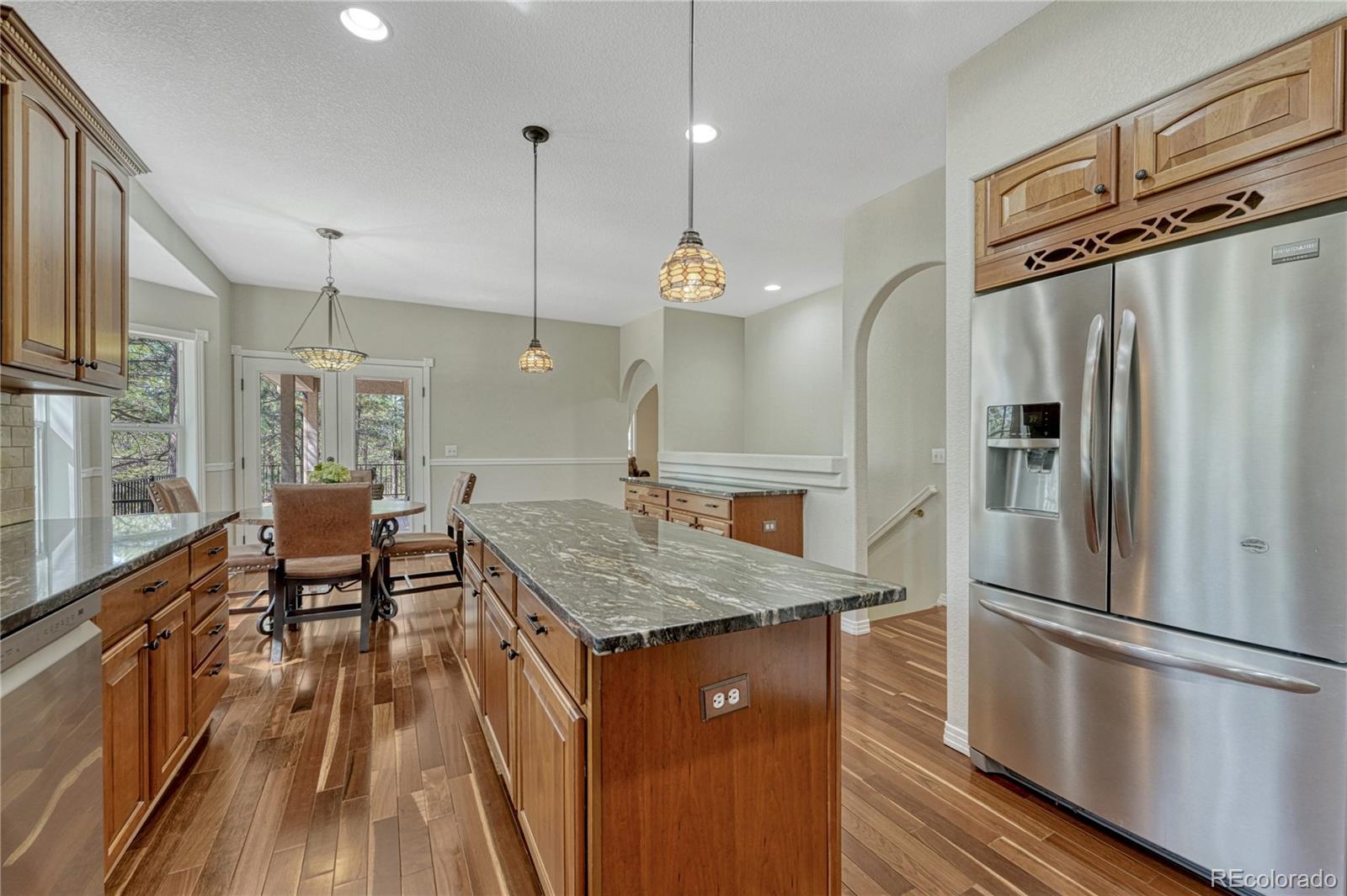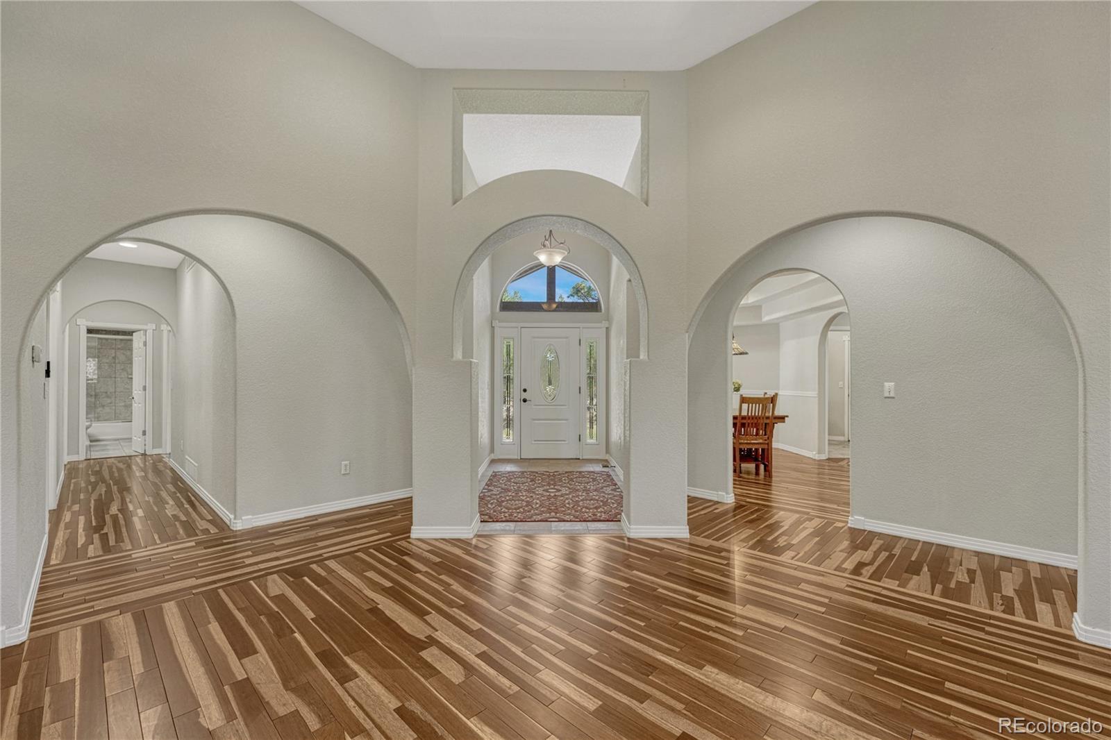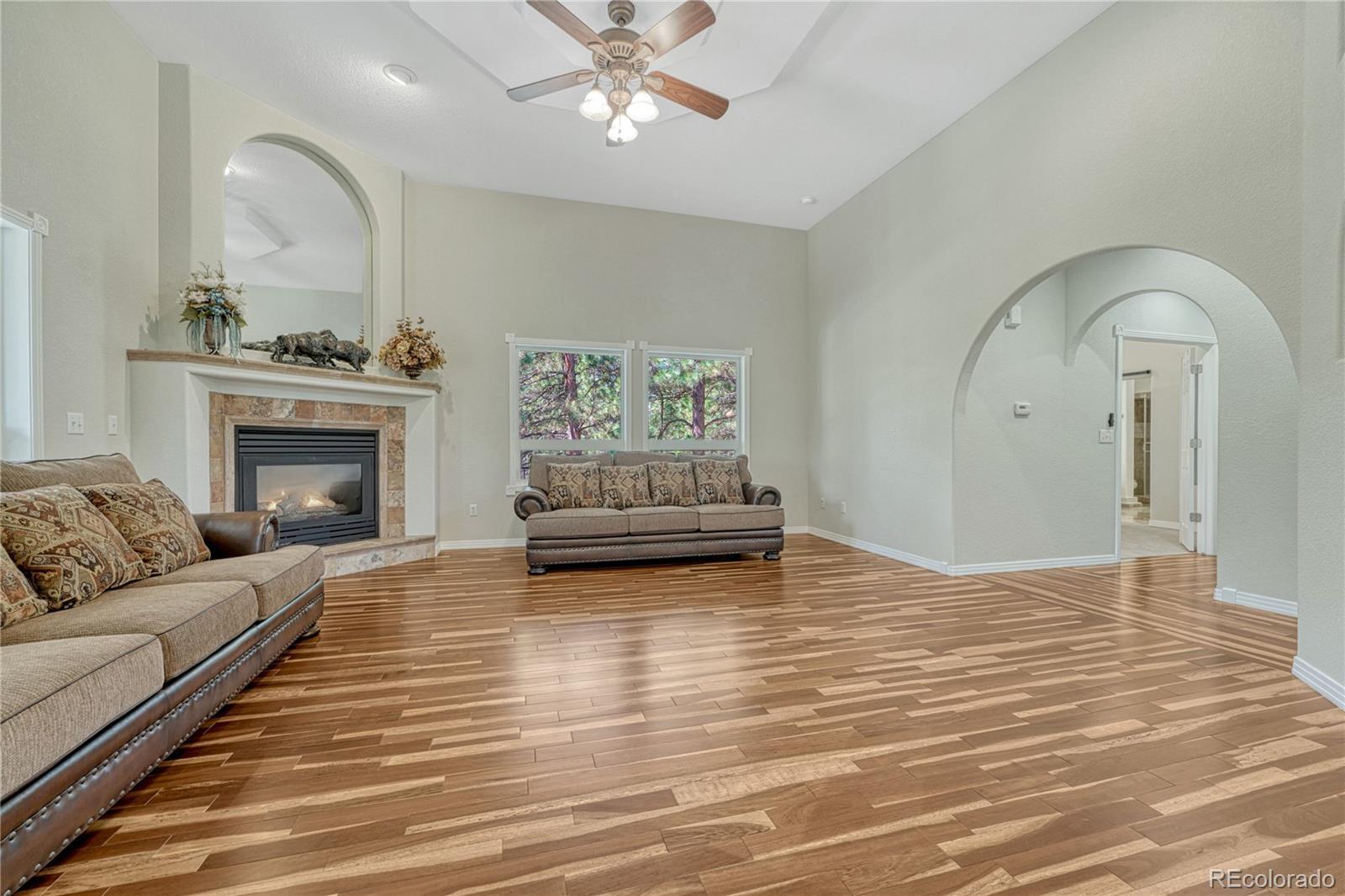 ***$100k PRICE DECREASE*** One story home with many recent upgrades throughout including rustic Brazilian Cherry hardwoods, travertine floors & kitchen back splash, slab granite counter tops, stained glass lighting fixtures, gas fireplace with a remarkable floor to ceiling surround, & 12' ceilings. Main level has 3 bedrooms, 3 bathrooms, formal dining area, gourmet kitchen, breakfast nook, sizable laundry room, and an impressive grand entrance/main living area. Large wrap around covered composite deck, finished walkout basement, and gazebo. Other items include 2 fully finished work shops/garages with cement floors, heat, electricity, lighting, insulation, & RV door, attached 3 vehicle garage plus additional parking on the lot. Primary suite has a 5 piece bathroom, walk-in closet, dual sink vanity, and walkout door to the deck. Basement has a carpeted 2nd living area, multi-purpose room with LVP flooring with many uses(workout room, craft room), bonus area perfect for a wine cellar, bedroom, bathroom, and plenty of storage. Two detached garages are fully finished with insulation, sheet rock, paint, concrete floors, garage door openers, storage cabinets, motion activated security lights, pellet heat stoves, individual electric sub panels, entrance doors, and have their own asphalt driveway. Other items include security system, computerized water purification system/softener, two newer water heaters (2020), furnace & A/C systems (2022), and recently replaced kitchen appliances. Largest garage was recently finished in 2024 and includes a 12' door, steel siding, and steel roof. Private, Quiet lot has lots of Ponderosa Pines and is minutes from downtown Elizabeth near CR 21 & Hwy 86.