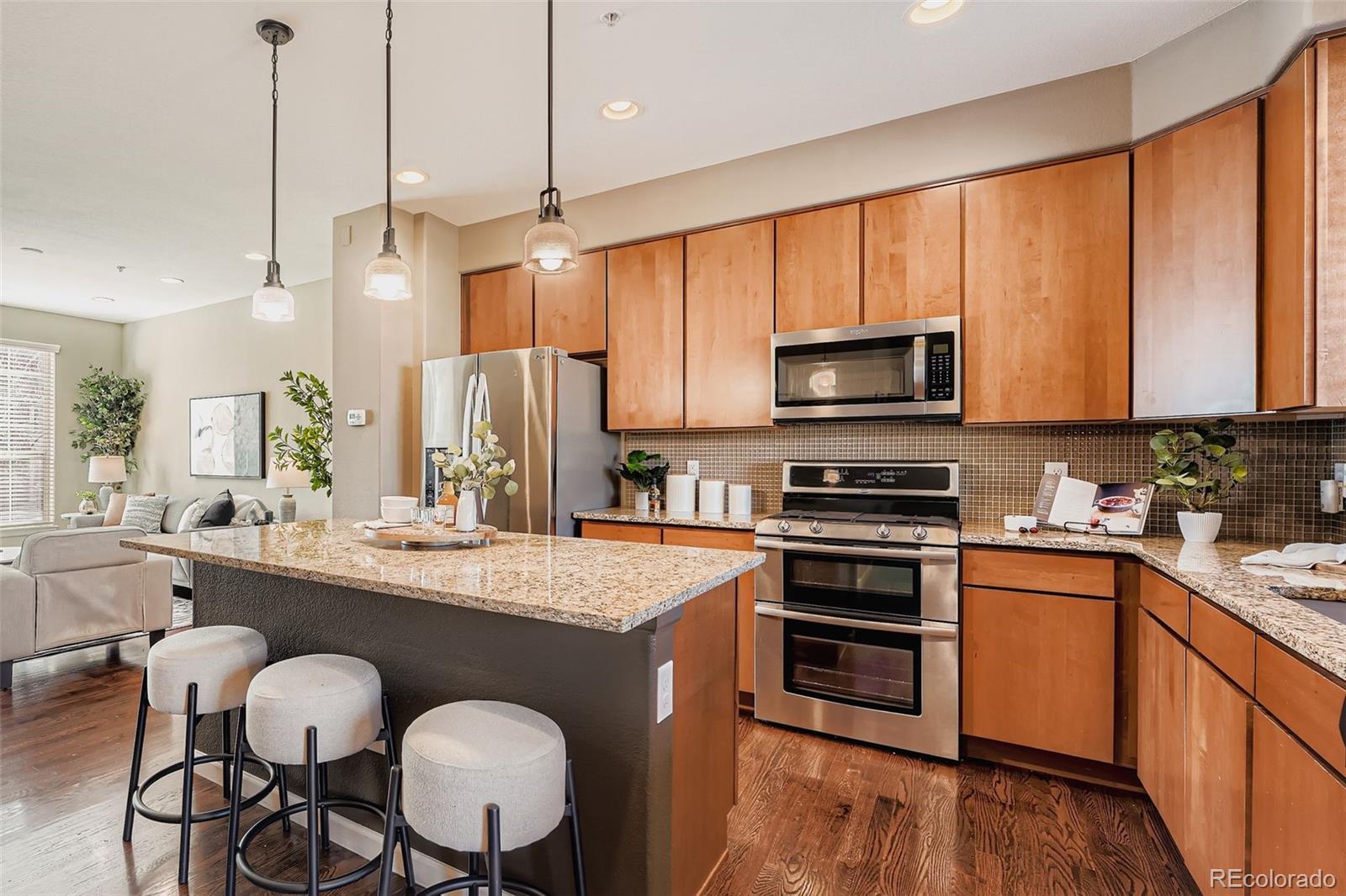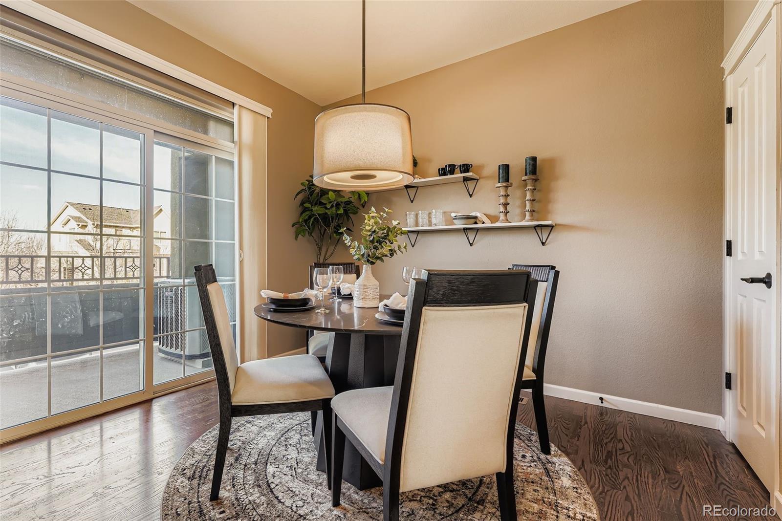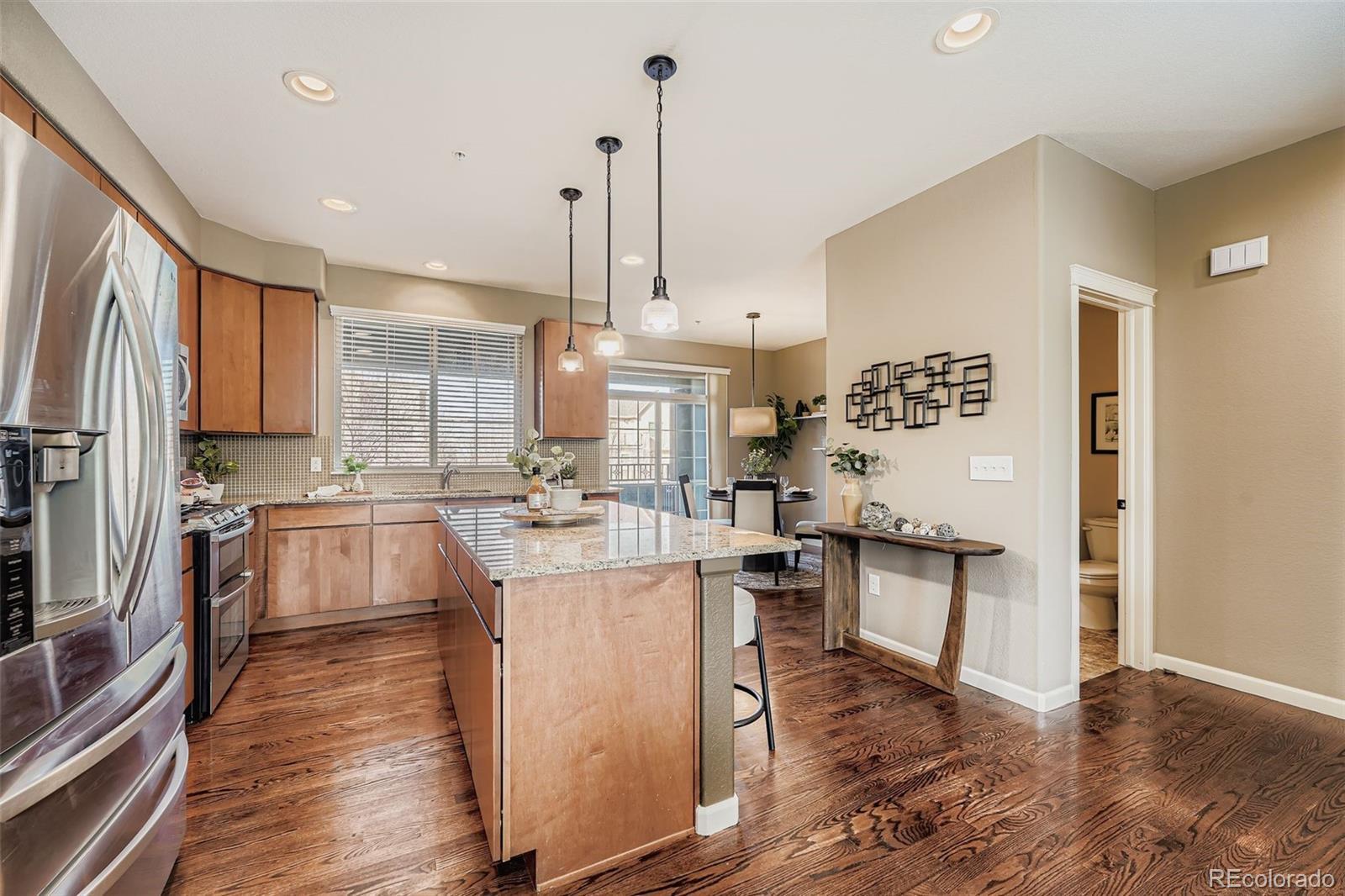 This freshly painted townhome in Highlands Ranch Town Center offers a bright, open layout, designer lighting, and low-maintenance living in a highly walkable location. The main level features a spacious living room with a gas fireplace and large windows, along with a beautifully updated kitchen that includes granite countertops, a glass tile backsplash, stainless steel appliances with a gas range, upgraded lighting, and ample cabinetry. The dining area includes a pantry and opens to a covered deck with a gas line and outdoor dining set included. The upper level includes a large primary bedroom with an en-suite bath, upgraded double-sink quartz vanity, walk-in closet, and a private balcony. Two additional bedrooms, a full bathroom, and a conveniently located laundry closet with washer and dryer included complete the space. The unfinished basement provides flexible room for storage, an office, home gym, or future expansion. Additional features include a 2-car attached garage and three outdoor living spaces. Located steps from Town Center shops, restaurants, Civic Green Park, trails, and access to Highlands Ranch’s four recreation centers with pools. A fantastic opportunity in a very desirable community.