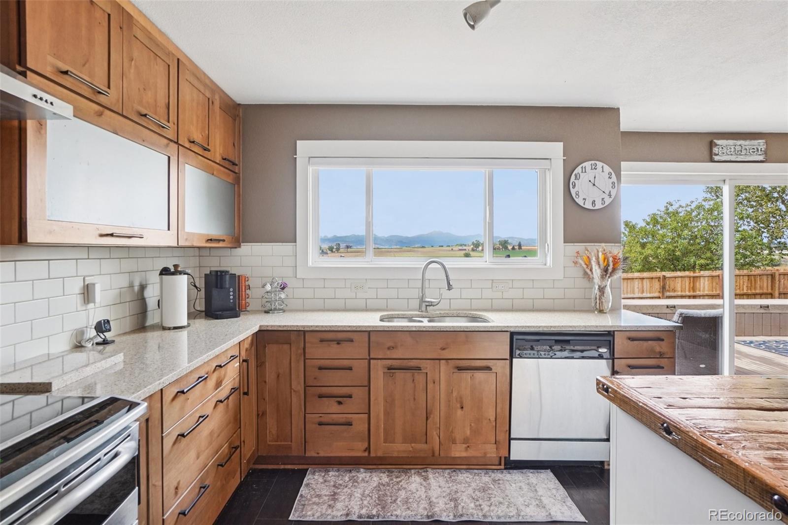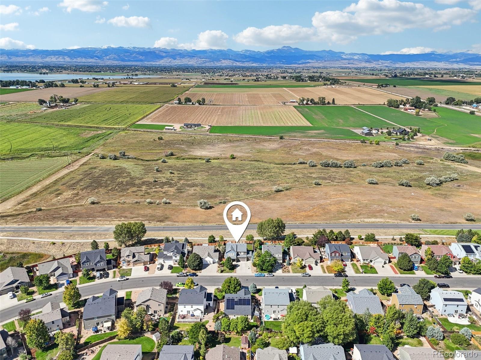 Discover this beautifully updated 5-bedroom, 4-bathroom two-story home with a fully finished basement and 3,604 sq. ft. of versatile living space. Set on a landscaped 6,969 sq. ft. lot, it blends modern comfort with rustic charm and sweeping Rocky Mountain views. The open-concept main level features a flowing kitchen, dining, and living area. West-facing windows and an oversized sliding glass door fill the space with sunlight, highlighting a gas fireplace accented with reclaimed wood from an 1800s train car—a striking focal point. The kitchen island echoes this reclaimed wood, adding warmth and character. Upstairs, spacious bedrooms include a serene primary suite, all with spacious closets. Three remodeled bathrooms showcase new vanities, fixtures, and Calacatta porcelain tile. Updated flooring throughout complements the barnwood feature wall, blending light and dark tones for a modern yet rustic feel. The finished basement adds a bedroom, full bath, and walk-in closet—perfect for guests, a recreation room, or multigenerational living. Outside, a large deck, swing-bed gazebo, and lush landscaping create inviting spaces to relax and entertain. The 3-car garage and extended driveway accommodate up to six vehicles. Located in a welcoming neighborhood with top-rated schools and minimal HOA fees, this home combines small-town tranquility with city convenience. Enjoy breathtaking mountain sunsets from your backyard. Bonus: Take advantage of a rare 5.125% assumable mortgage, offering a below-market financing opportunity!