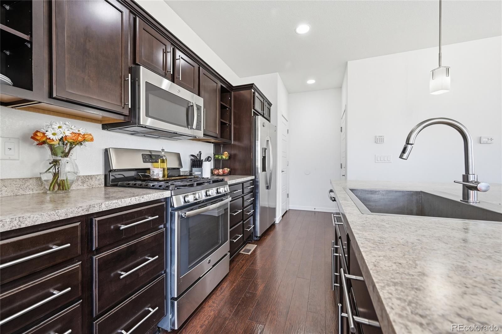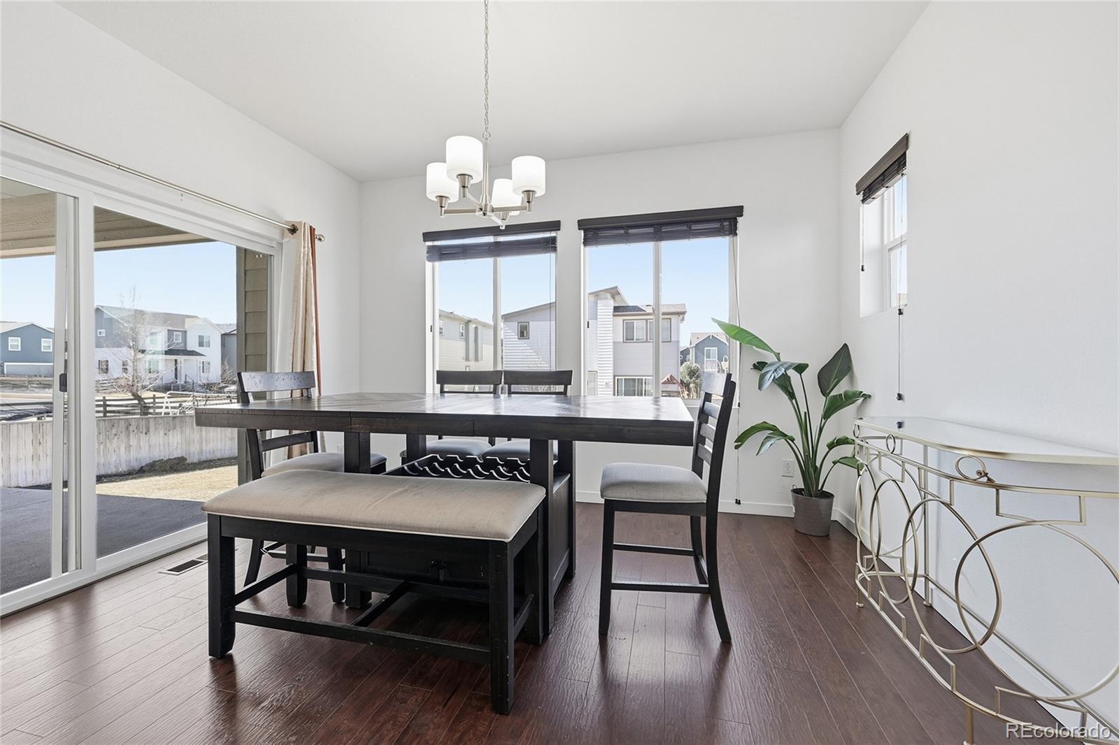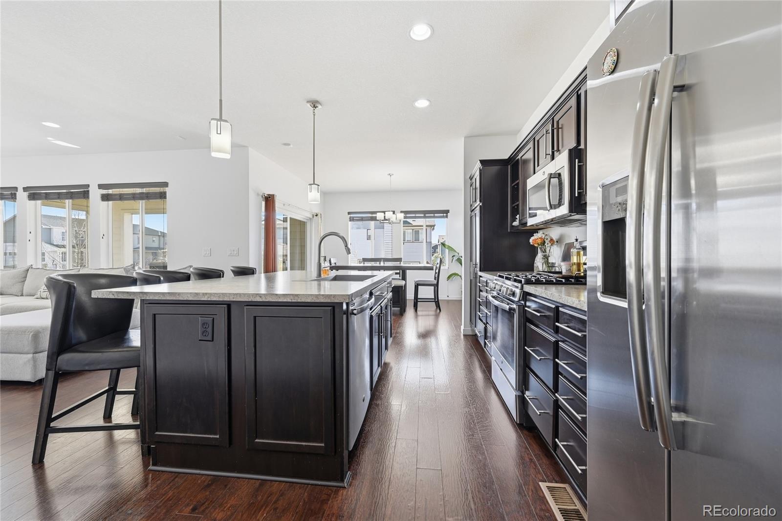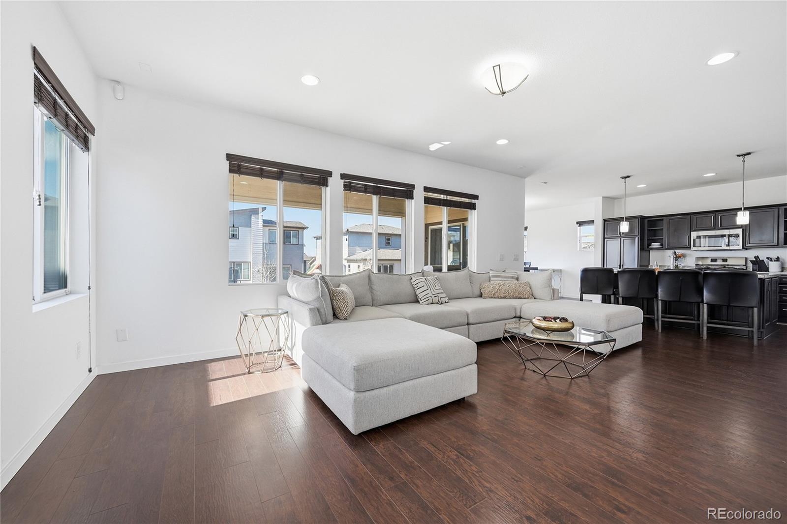 Curious what life feels like when modern style meets quick access to Denver? Set in the enviable Reunion community, this 4-bedroom, 3-bath, two-story home welcomes you with rich wood-style LVP flooring, wide sunlit windows, recessed lights, and clean neutral baseboards that tie its open layout together beautifully! The living and dining areas flow naturally into a striking kitchen featuring dark-toned cabinetry, luminous countertops, stainless steel appliances, and a pendant-lit island ready for coffee or conversations. A main-level bedroom paired with a full bath offers flexibility for guests or as a productive remote office. Upstairs, your carpeted primary suite becomes a calming retreat with its dual sinks and a generous walk-in closet designed to keep everything organized. Outside, a covered patio invites relaxed weekend BBQs or boisterous evening gatherings while the gently sloped yard catches the warm Colorado sun. An unfinished basement, an attached 2-car garage, a laundry nook, and proximity to Reunion Park, the Rec Center, local shopping, and E-470 provide additional convenience. Come explore the possibilities waiting here!
