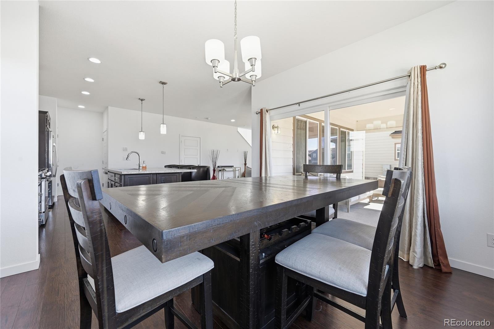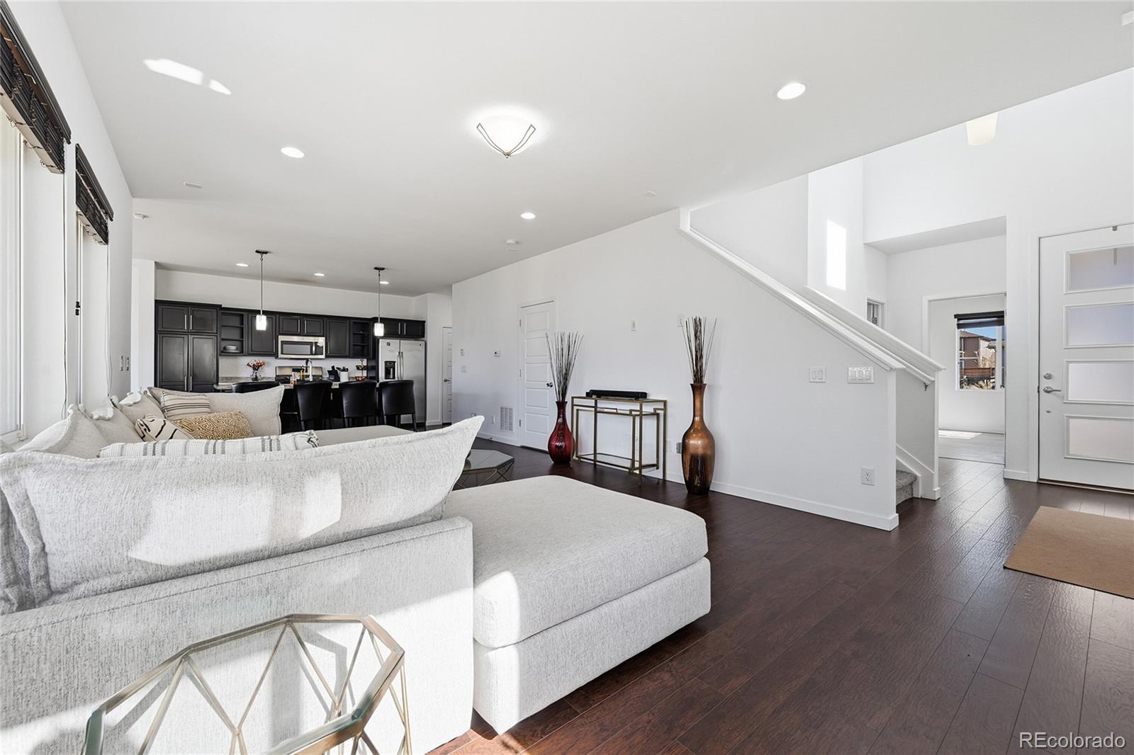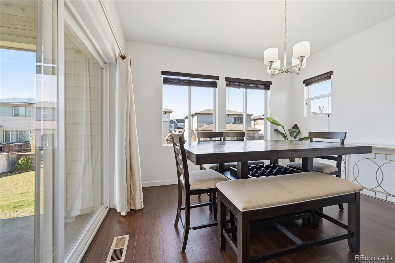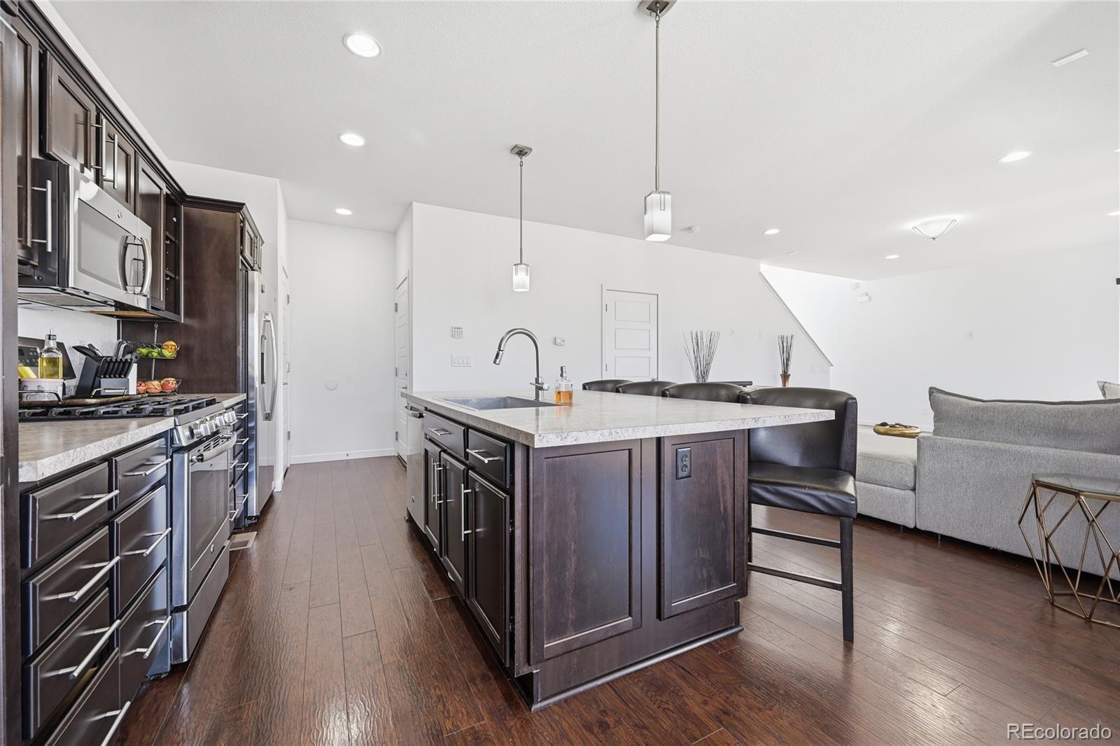 Curious what life feels like when modern style meets quick access to Denver? Set in the enviable Reunion community, this 4-bedroom, 3-bath, two-story home welcomes you with rich wood-style LVP flooring, wide sunlit windows, recessed lights, and clean neutral baseboards that tie its open layout together beautifully! The living and dining areas flow naturally into a striking kitchen featuring dark-toned cabinetry, luminous countertops, stainless steel appliances, and a pendant-lit island ready for coffee or conversations. A main-level bedroom paired with a full bath offers flexibility for guests or as a productive remote office. Upstairs, your carpeted primary suite becomes a calming retreat with its dual sinks and a generous walk-in closet designed to keep everything organized. Outside, a covered patio invites relaxed weekend BBQs or boisterous evening gatherings while the gently sloped yard catches the warm Colorado sun. An unfinished basement, an attached 2-car garage, a laundry nook, and proximity to Reunion Park, the Rec Center, local shopping, and E-470 provide additional convenience. Come explore the possibilities waiting here!