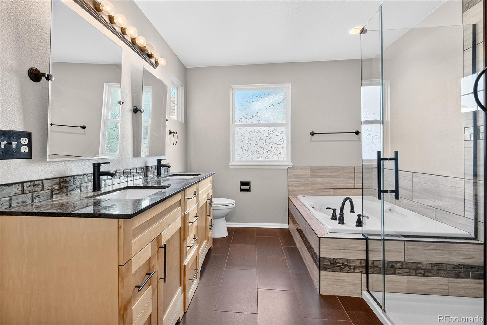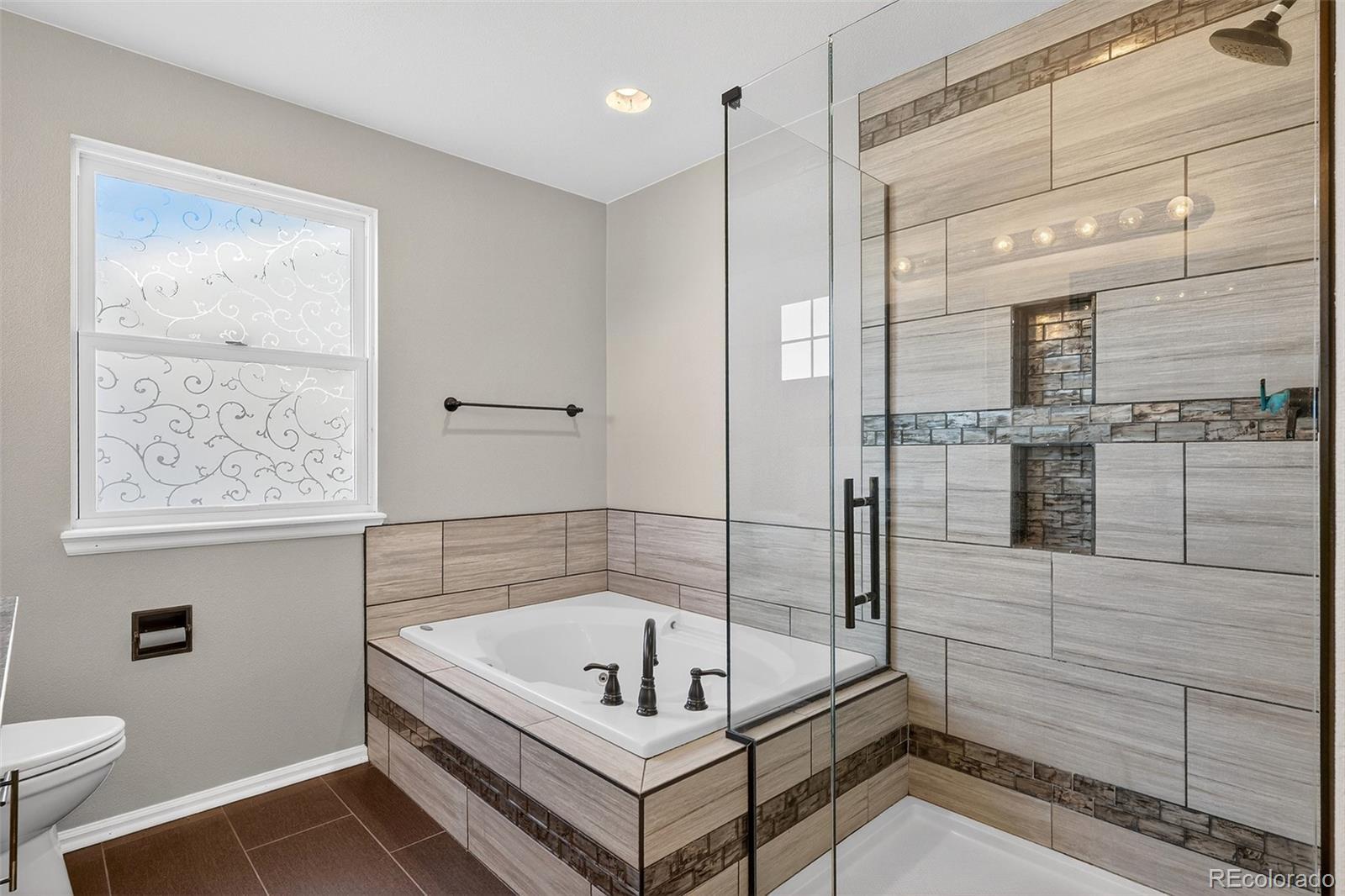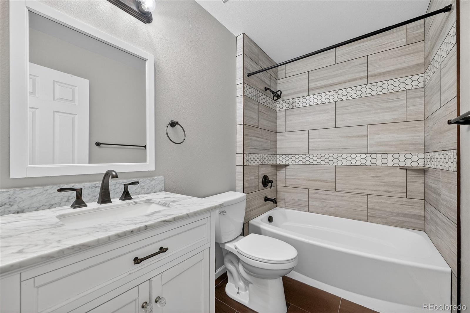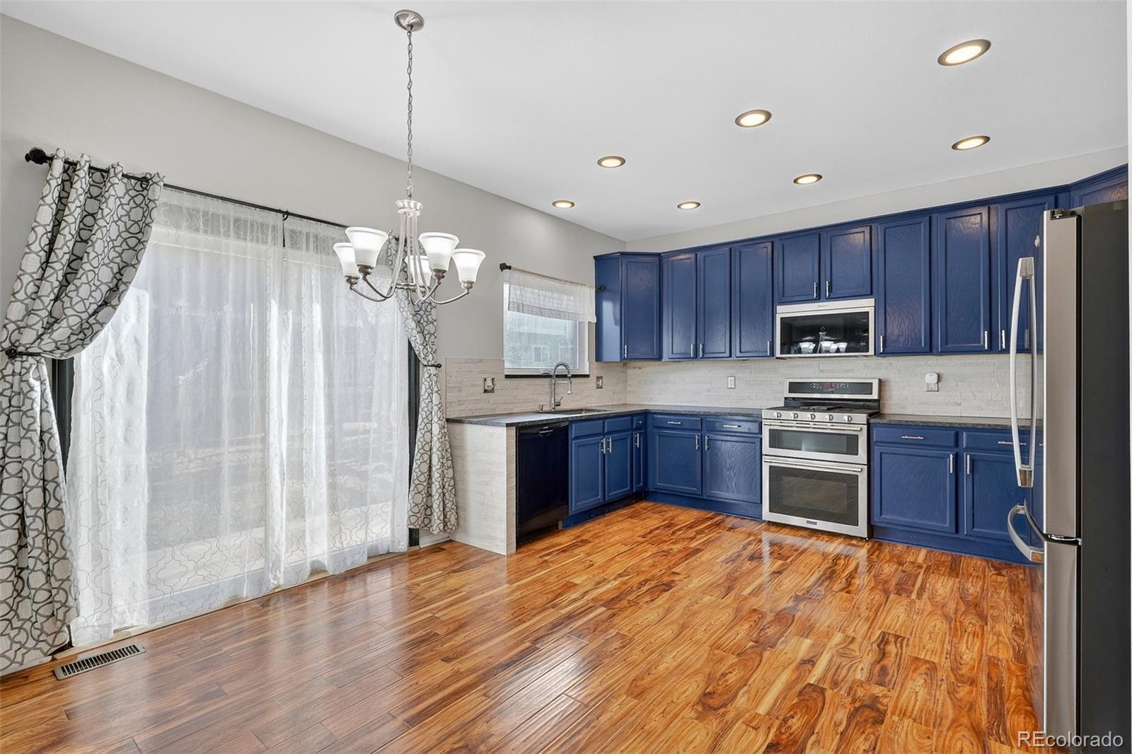 Elegant 4-bedroom, 4-bath home in Aurora located in the highly sought-after Cherry Creek School District. This move-in-ready home features engineered hardwood floors throughout the main level. The updated kitchen offers custom-painted cabinets and brand-new refrigerator, newer appliances, opening seamlessly to the great room with dramatic fireplace. The spacious expanded primary suite includes a gas fireplace, spa-like en suite bath with double vanity, soaking tub, separate shower, and walk-in closet. Same level dual bedrooms w/ own private bathroom. Basement upgraded with 3/4 bath and bonus room. Enjoy outdoor living on the tiled back porch with fenced yard access. Located in The Farm Community with open space and a playground just half a block away, and only 15 minutes to Cherry Creek State Park and Southlands Mall. Schedule your private tour today!