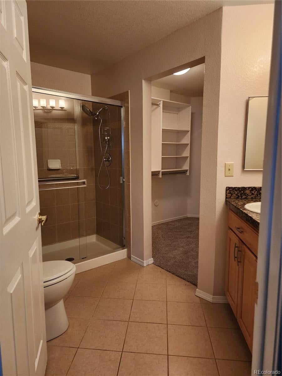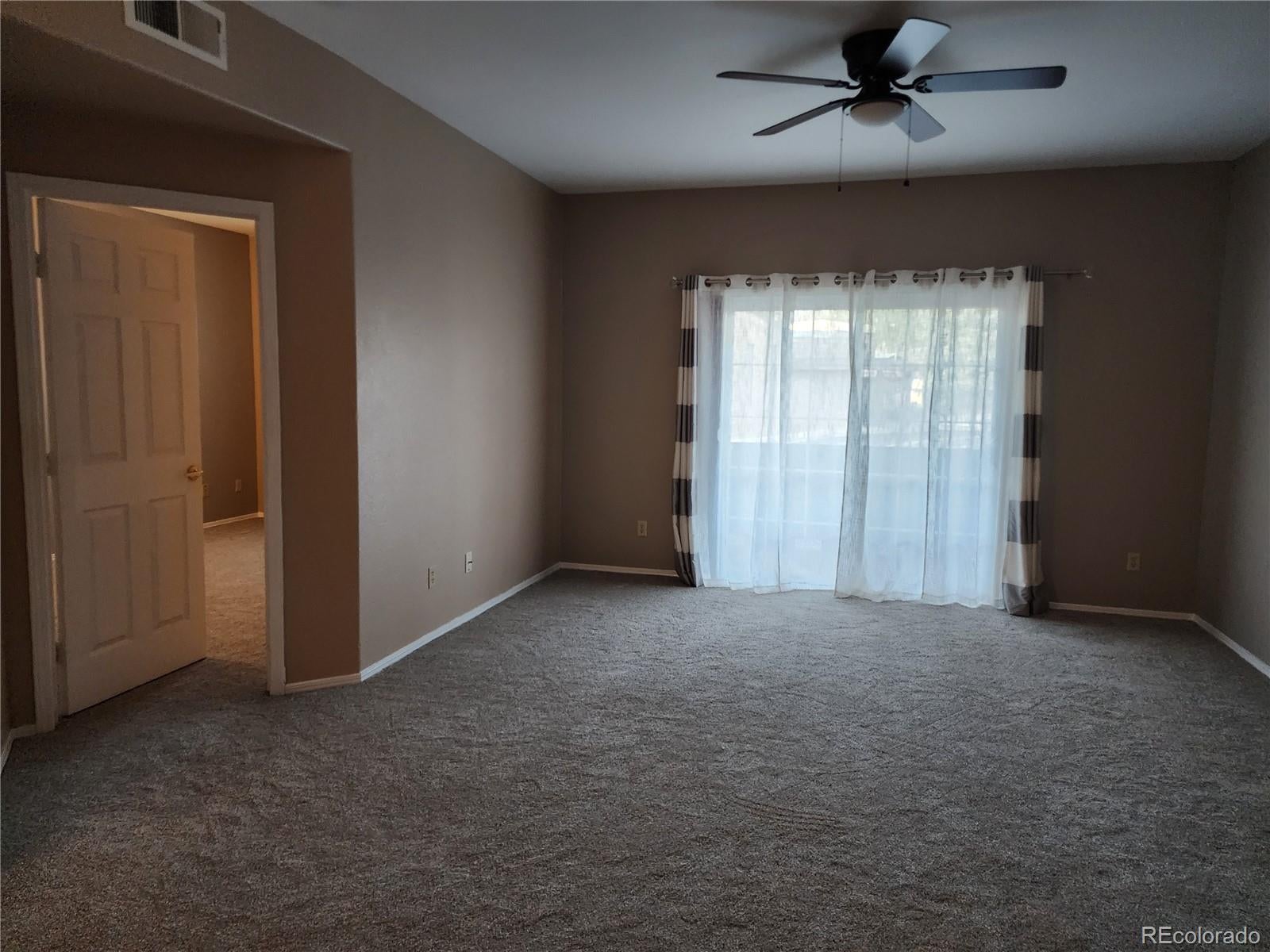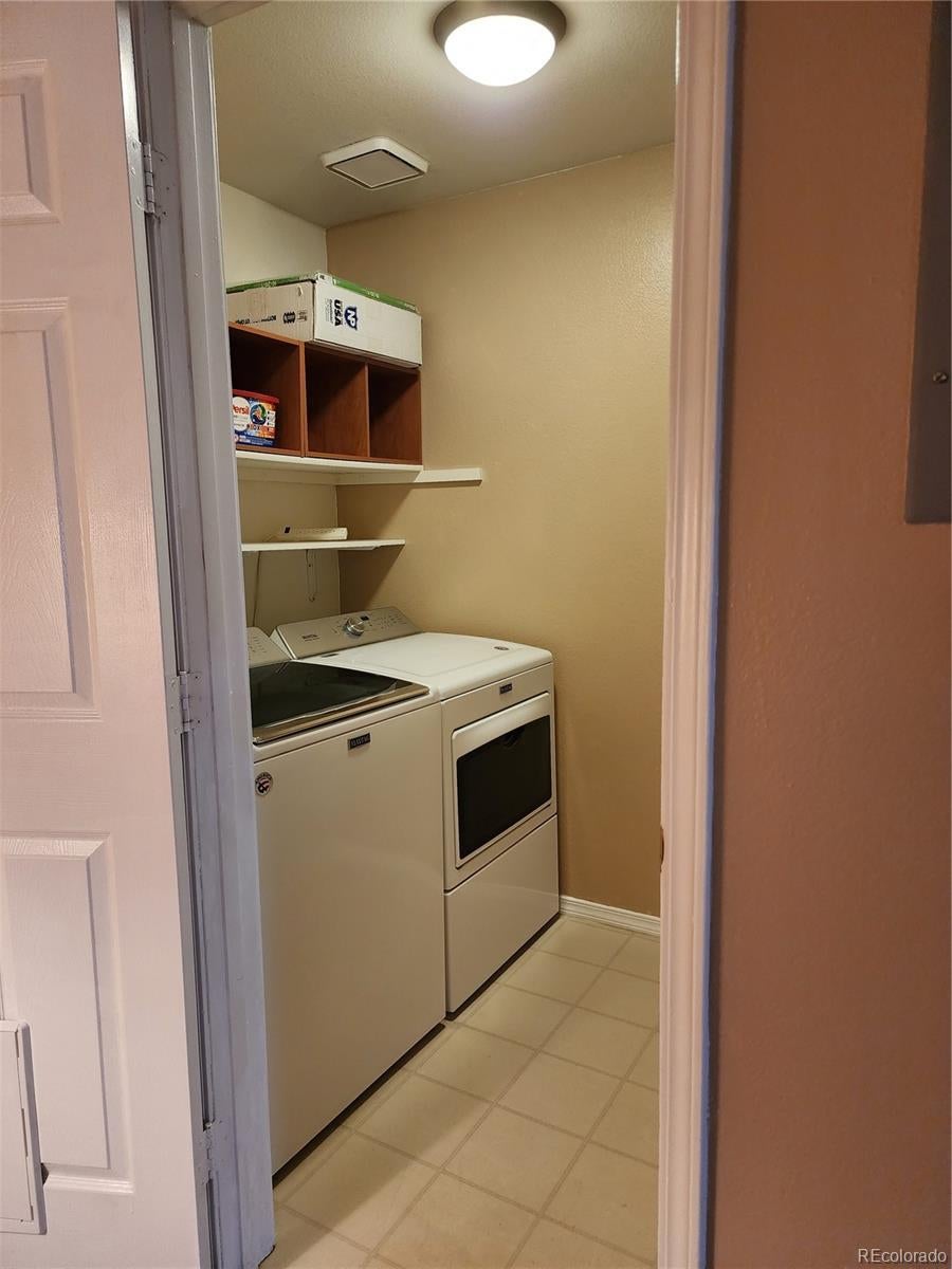 Outstanding location to I-25, light rail station just blocks away. This is a great main floor unit with secure attached 1 car garage, plus an additional 1 car reserved parking spot. Great for those wanting separation between rooms. Master bedroom is located at one side of the condo with attached walk-in closet and private bath. Then the additional guest bedroom with its own walk-in closet for a possible roommate, kids, guest visiting or that work from home office space is located on the other side of the unit. Allowing for privacy in both rooms. There is an additional full guest bathroom and laundry room next to the guest bedroom. Included is a nice large capacity washer and clothes dryer. Kitchen has stainless steel appliances and new disposal in the stainless sink. Tasteful blinds and curtains that are included. And many of the current light bulbs have all been replaced with LED bulbs. When summer rolls around, simply walk across the street to the club house and enjoy the pool. Or if you prefer, simply enjoy the outside patio attached to the unit. This is an outstanding location with easy access to everything. New paint, brand new 64-ounce carpet and new pad in the unit. Everything you'll need as a first-time homeowner or someone looking to downsize will be found in this unique unit. Enjoy the mail center just across the street. Or simply do the round about as you come home at the end of the day for ease of access to your mail. Perfect location, great 2-bedroom unit with attached garage. Come and make this your home. This unit is agent owned and all upgrades were top. Cabinets in garage are only being temporarily housed for a different unit. Once removed, garage will be fully painted. Once painted, photos will follow.