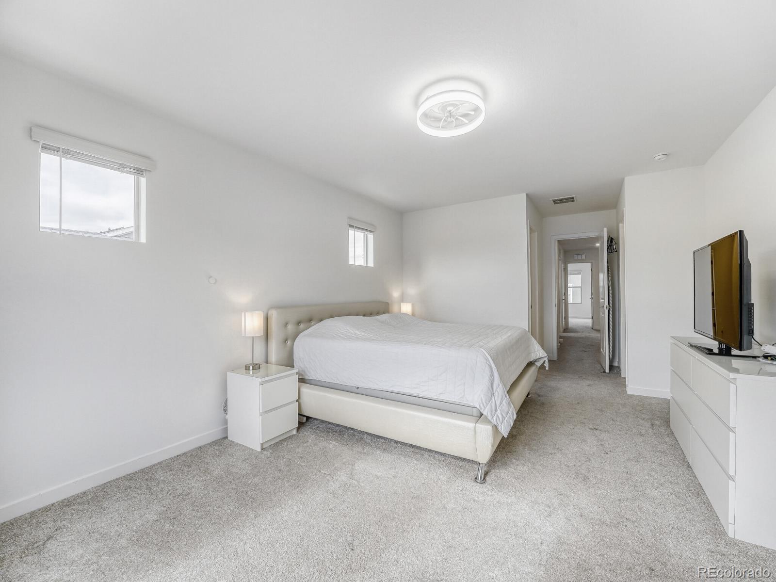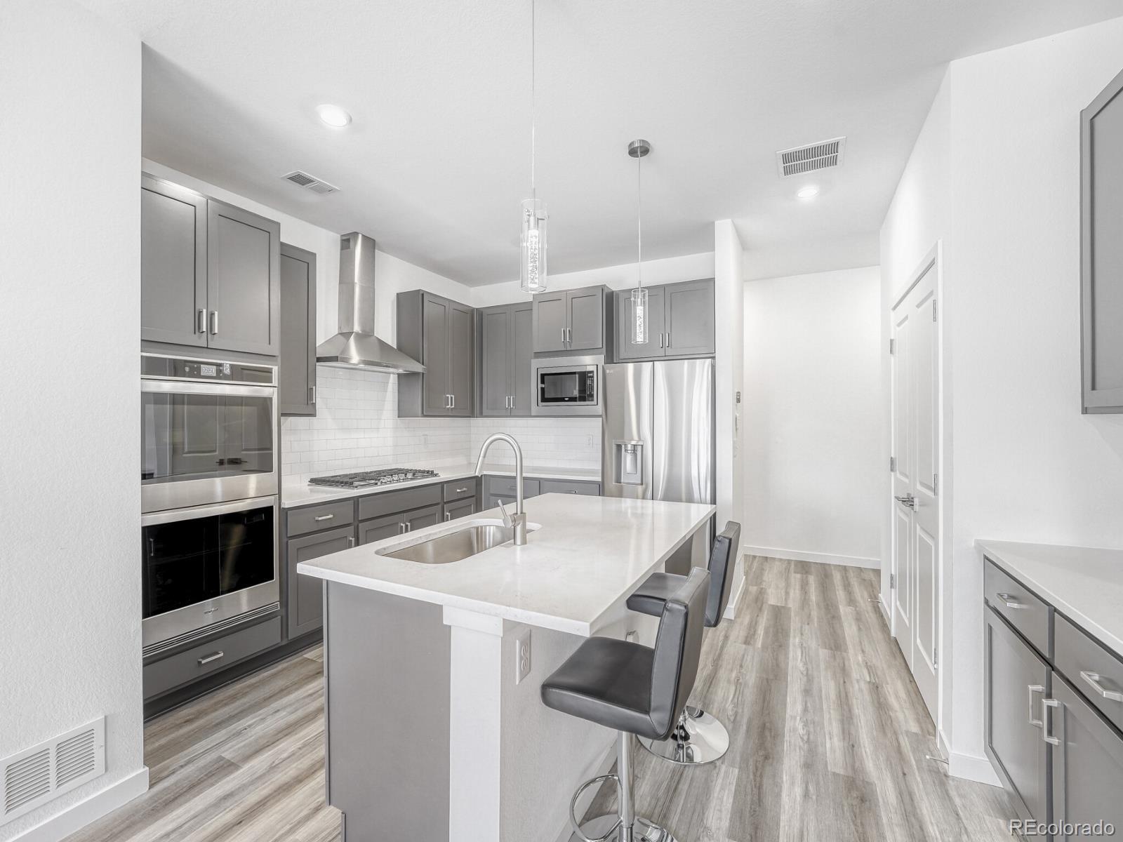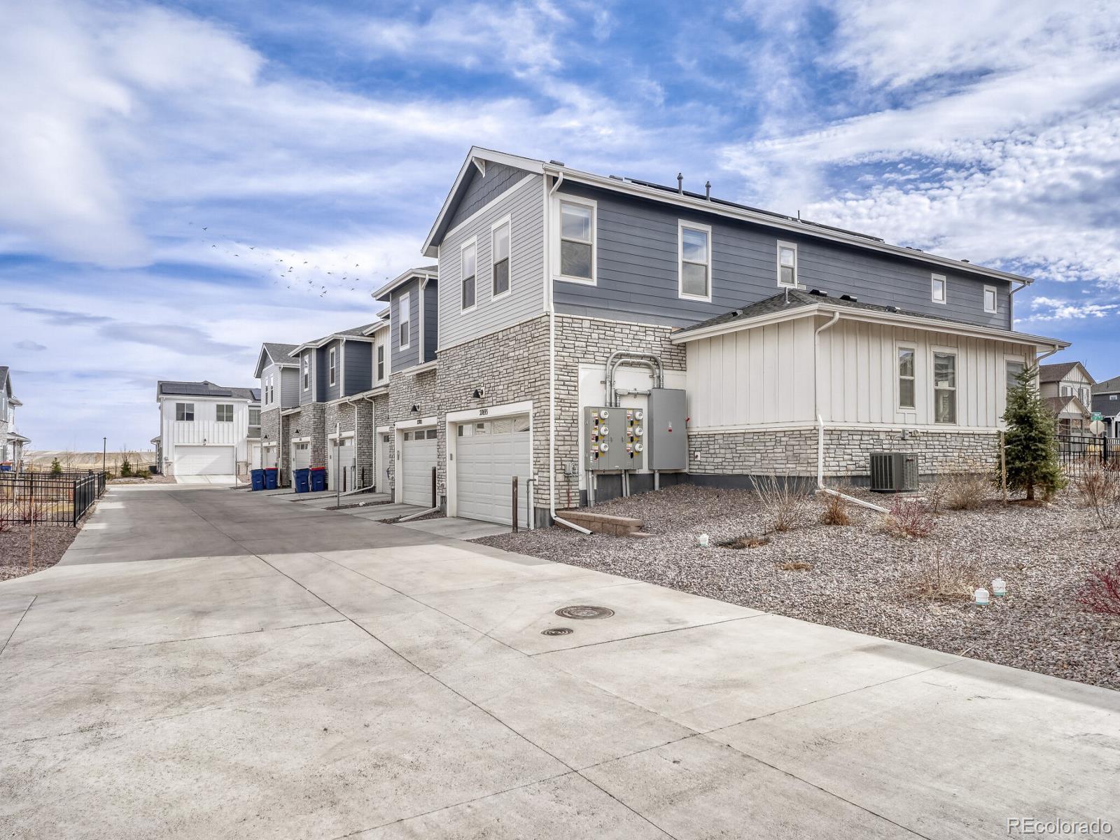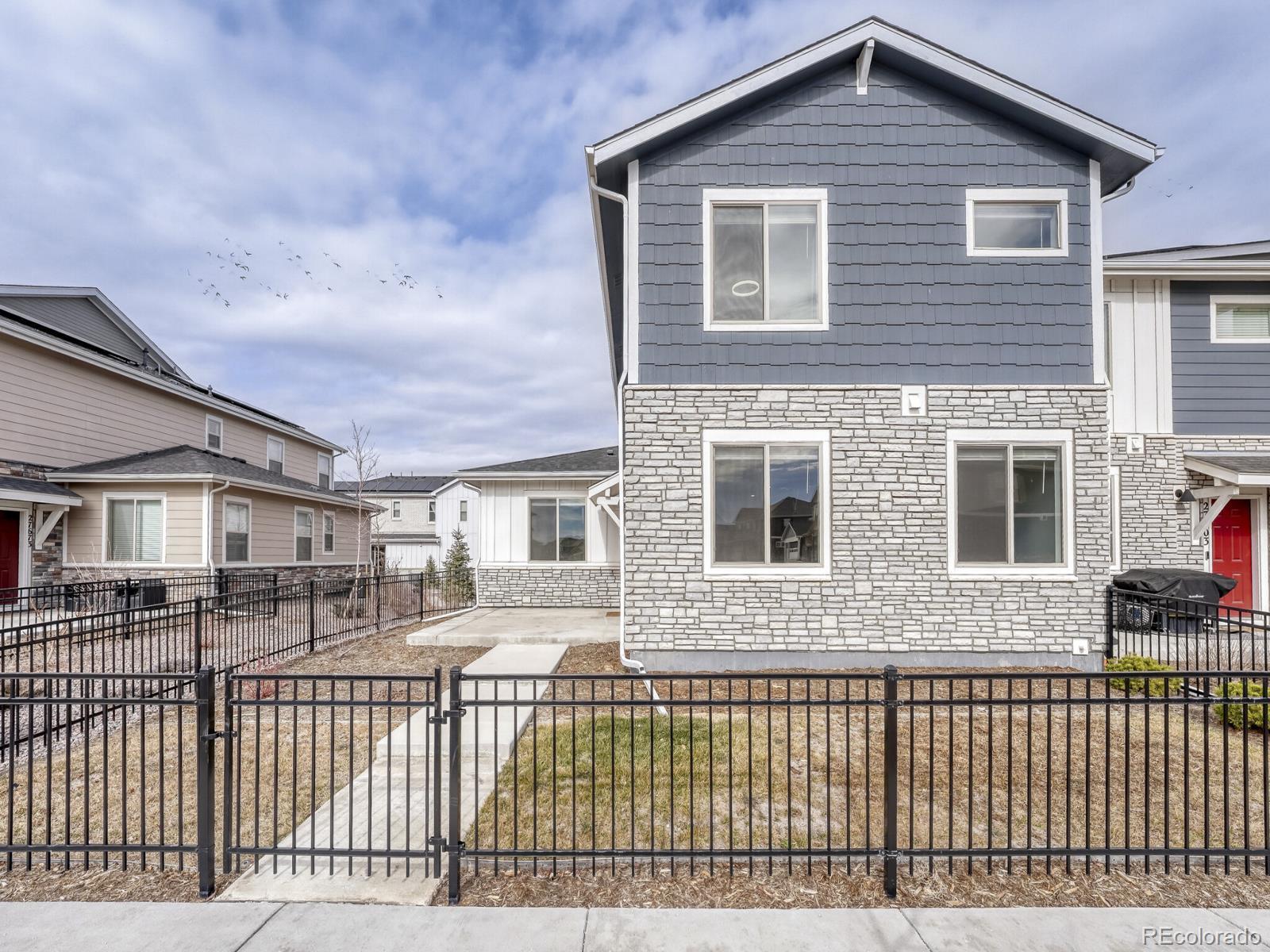 Welcome home to this beautifully upgraded end-unit townhome featuring a fenced yard and large front patio, perfect for relaxing or entertaining. The HOA maintains the yard and handles snow removal, offering truly low-maintenance living. Inside, you’ll find an open-concept main floor with abundant natural light and stylish upgrades throughout. The kitchen beautifully appointed with quartz countertops, an island, coffee bar, stainless steel appliances, gas stove, double oven, and pantry. The inviting layout flows seamlessly into the living and flex space. A convenient ½ bath completes the main level. The main-floor primary suite offers privacy and comfort with a large walk-in closet and en suite bath featuring dual sinks and an oversized shower. Upstairs, enjoy a spacious second primary suite with two generous walk-in closets and a luxurious 5-piece bath including a large soaking tub. Two additional bedrooms, a full secondary bath, and upstairs laundry room (washer and dryer included) provide flexible living space. Additional highlights include: 2-car attached garage with EV charging outlet, Upgraded garage door opener with video capability, Owned solar panels, and a Tankless water heater. Located just minutes from DIA, this home also offers access to incredible community amenities including a pool and hot tub, clubhouse, fitness center, park, trails and a PK-8 school right outside your door. Move-in ready, energy-efficient, and packed with upgrades, this is Colorado low-maintenance living at its finest! *Property is also available for rent, contact Listing Agent if interested*