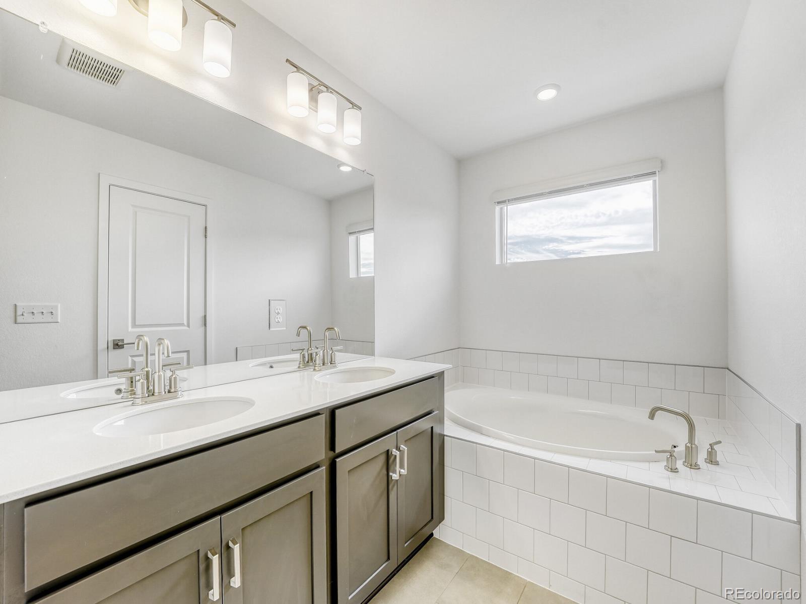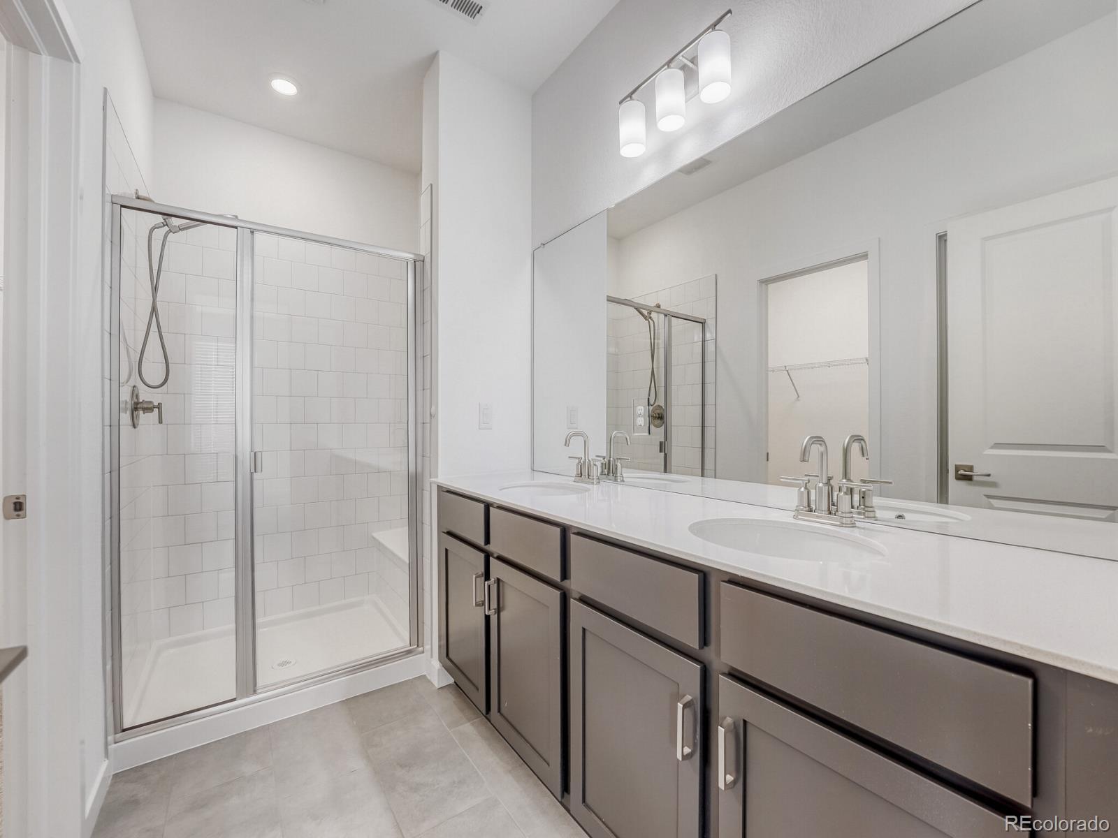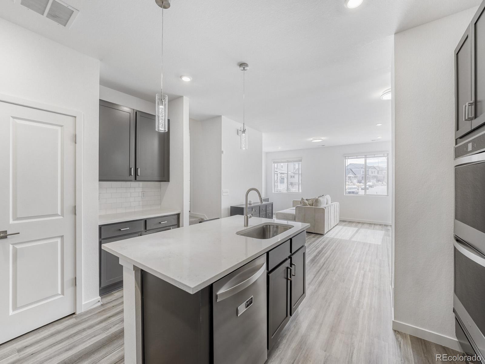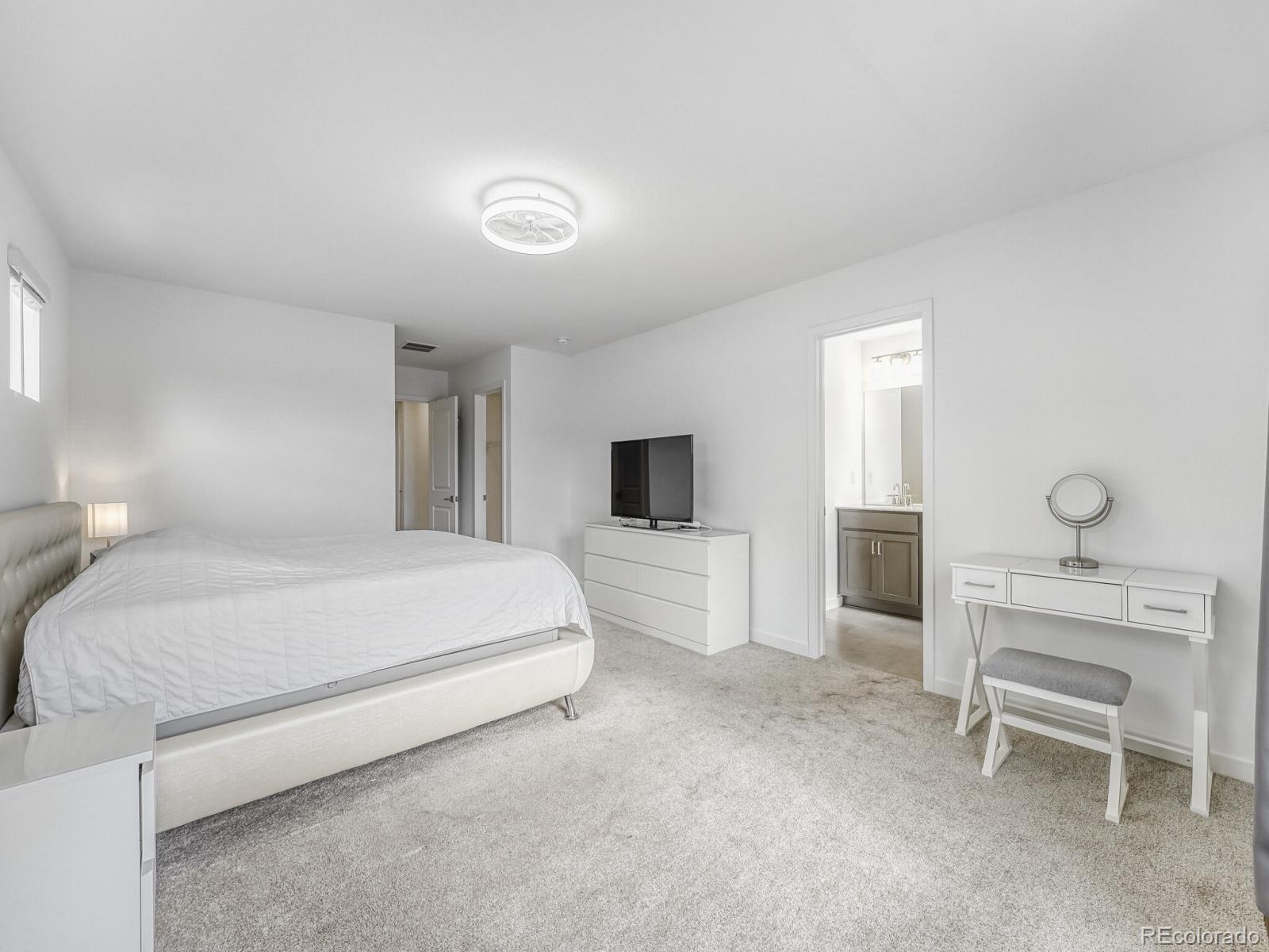 Welcome home to this beautifully upgraded end-unit townhome featuring a fenced yard and large front patio, perfect for relaxing or entertaining. The HOA maintains the yard and handles snow removal, offering truly low-maintenance living. Inside, you’ll find an open-concept main floor with abundant natural light and stylish upgrades throughout. The kitchen beautifully appointed with quartz countertops, an island, coffee bar, stainless steel appliances, gas stove, double oven, and pantry. The inviting layout flows seamlessly into the living and flex space. A convenient ½ bath completes the main level. The main-floor primary suite offers privacy and comfort with a large walk-in closet and en suite bath featuring dual sinks and an oversized shower. Upstairs, enjoy a spacious second primary suite with two generous walk-in closets and a luxurious 5-piece bath including a large soaking tub. Two additional bedrooms, a full secondary bath, and upstairs laundry room (washer and dryer included) provide flexible living space. Additional highlights include: 2-car attached garage with EV charging outlet, Upgraded garage door opener with video capability, Owned solar panels, and a Tankless water heater. Located just minutes from DIA, this home also offers access to incredible community amenities including a pool and hot tub, clubhouse, fitness center, park, trails and a PK-8 school right outside your door. Move-in ready, energy-efficient, and packed with upgrades, this is Colorado low-maintenance living at its finest! *Property is also available for rent, contact Listing Agent if interested*