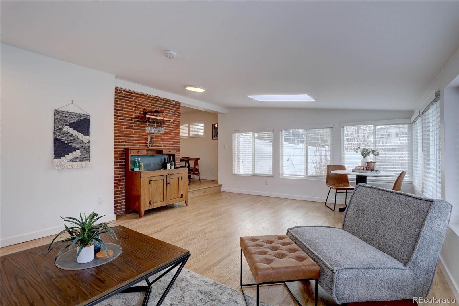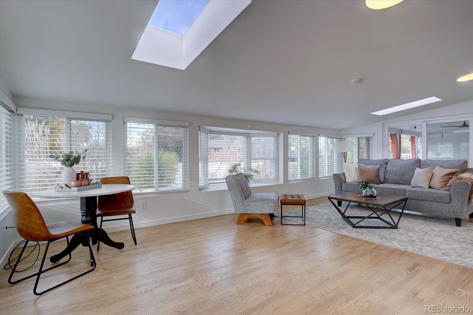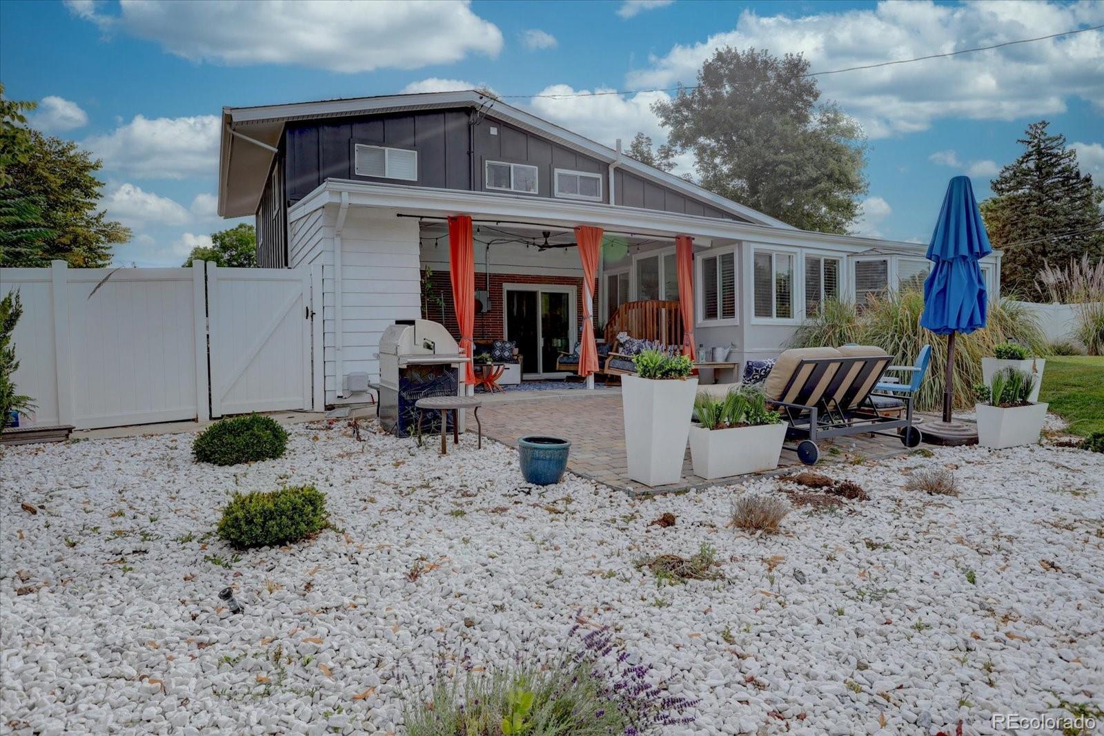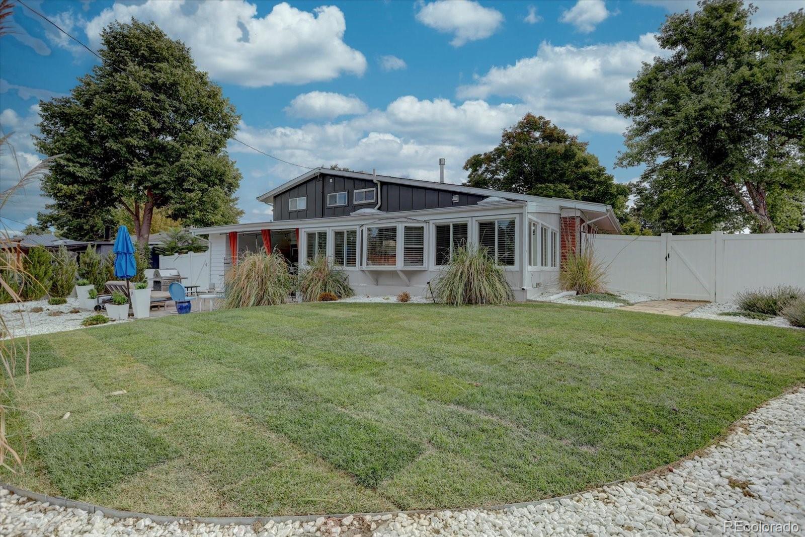 Mid-century modern lovers, this is the one. Tucked on a large corner lot in Cherrywood Village, this fully renovated 1963 tri-level blends iconic period architecture with thoughtful, high-end updates throughout. The main level opens into an airy great room under a dramatic vaulted, beamed ceiling, anchored by a gas fireplace and connected to a true showpiece kitchen — sleek finishes, modern appliances, and an easy flow for entertaining. As you enter from the garage, a wonderful mudroom/flex space awaits with built-in cabinets, a wine fridge, and the perfect spot to drop keys and bags at the end of the day or use as a bar area for guests. The bright enclosed sunroom extends the living space out to a private, fully fenced backyard with patio and mature apple trees. The upper level features a beautifully finished primary suite with its own stunning bath, plus two additional bedrooms (1 nonconforming) and an updated full bath. The finished lower level adds a rec room, additional bedroom, and another renovated bath for guests—with plenty of egress windows to give the lower level an open, light and bright feel. Central air plus evaporative cooling, updated baths and flooring, modern lighting, and clean lines carry the mid-century vibe throughout while making the home feel fresh and livable today. An attached garage plus an oversized flat driveway offers extra parking for an adventure vehicle or camper. All of this in Littleton Public Schools, near parks and trails. Consider every box checked.
