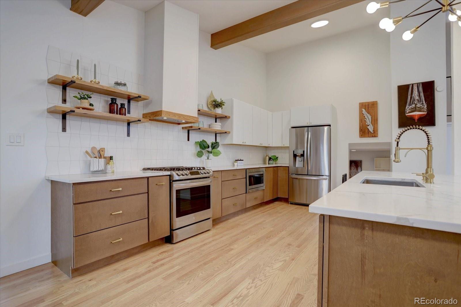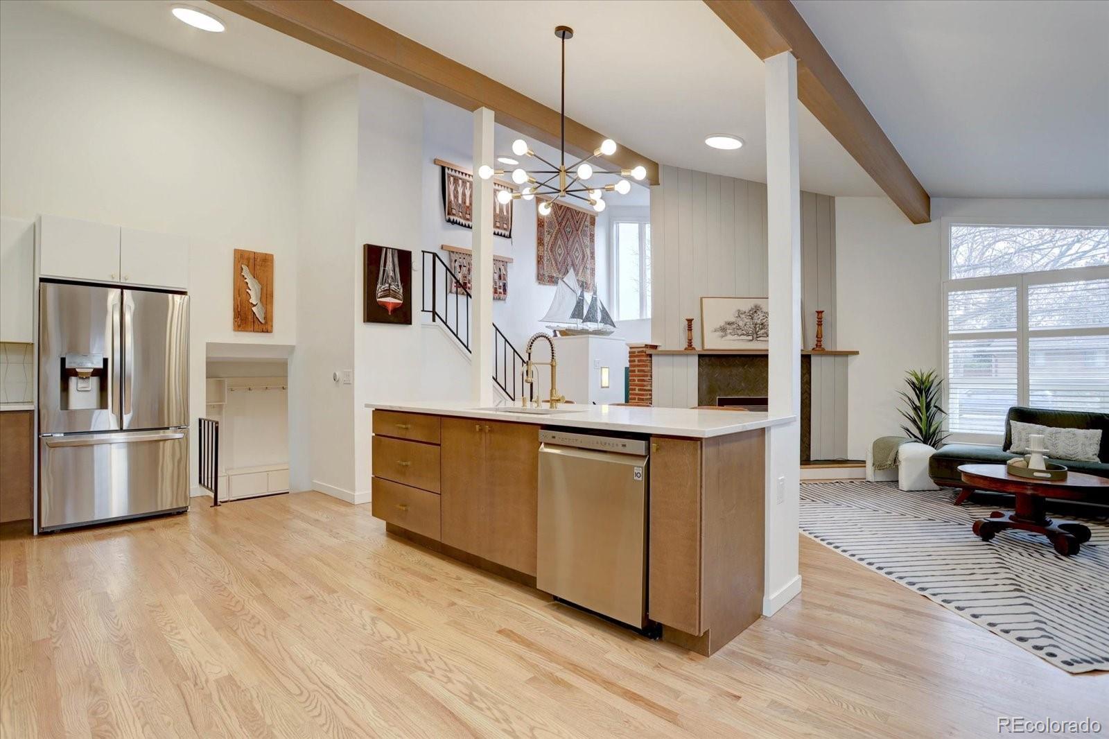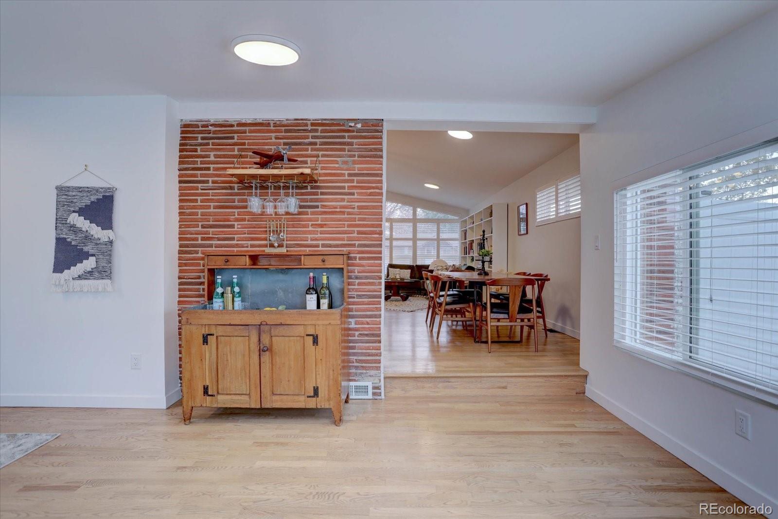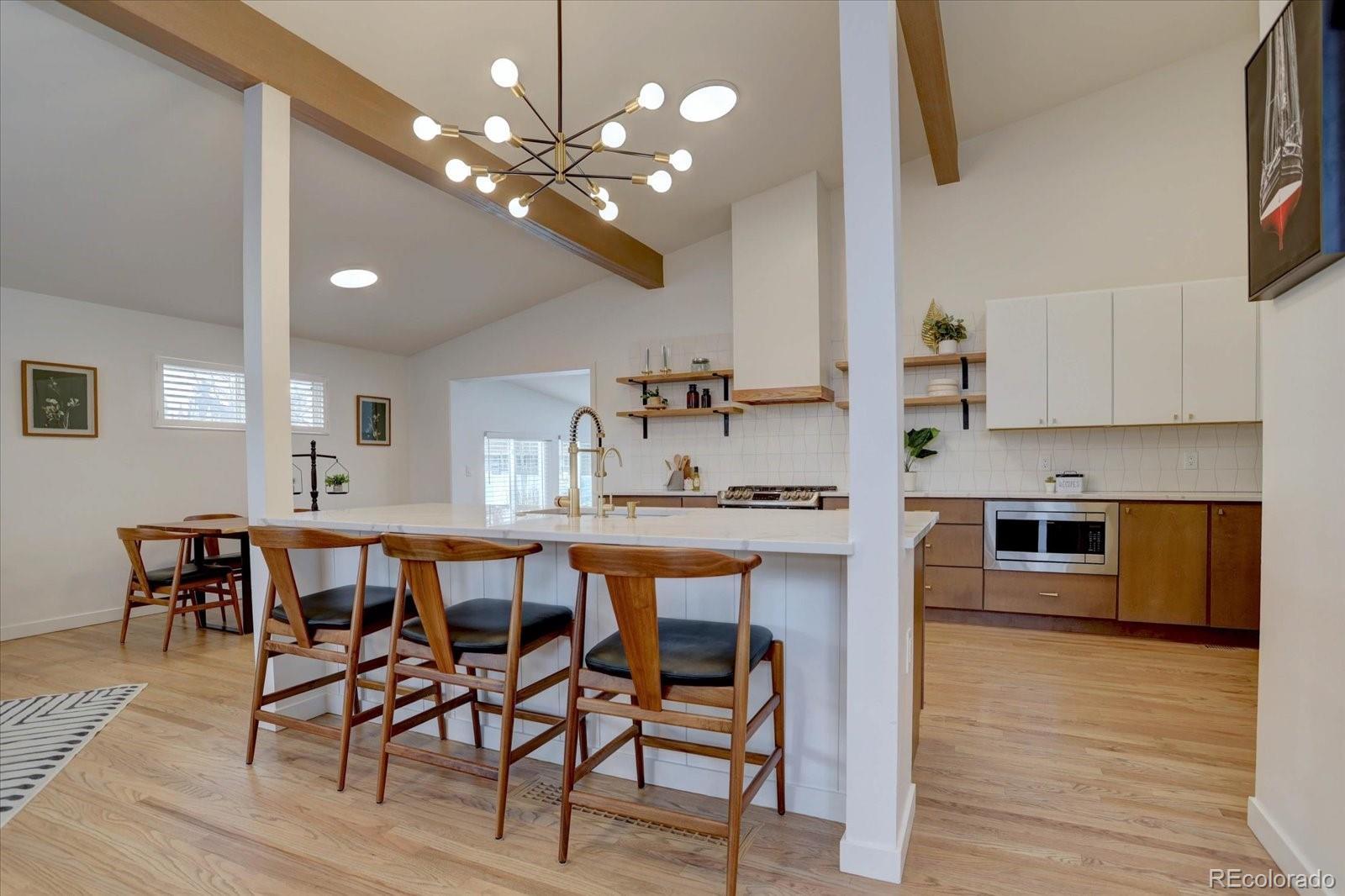 Mid-century modern lovers, this is the one. Tucked on a large corner lot in Cherrywood Village, this fully renovated 1963 tri-level blends iconic period architecture with thoughtful, high-end updates throughout. The main level opens into an airy great room under a dramatic vaulted, beamed ceiling, anchored by a gas fireplace and connected to a true showpiece kitchen — sleek finishes, modern appliances, and an easy flow for entertaining. As you enter from the garage, a wonderful mudroom/flex space awaits with built-in cabinets, a wine fridge, and the perfect spot to drop keys and bags at the end of the day or use as a bar area for guests. The bright enclosed sunroom extends the living space out to a private, fully fenced backyard with patio and mature apple trees. The upper level features a beautifully finished primary suite with its own stunning bath, plus two additional bedrooms (1 nonconforming) and an updated full bath. The finished lower level adds a rec room, additional bedroom, and another renovated bath for guests—with plenty of egress windows to give the lower level an open, light and bright feel. Central air plus evaporative cooling, updated baths and flooring, modern lighting, and clean lines carry the mid-century vibe throughout while making the home feel fresh and livable today. An attached garage plus an oversized flat driveway offers extra parking for an adventure vehicle or camper. All of this in Littleton Public Schools, near parks and trails. Consider every box checked.