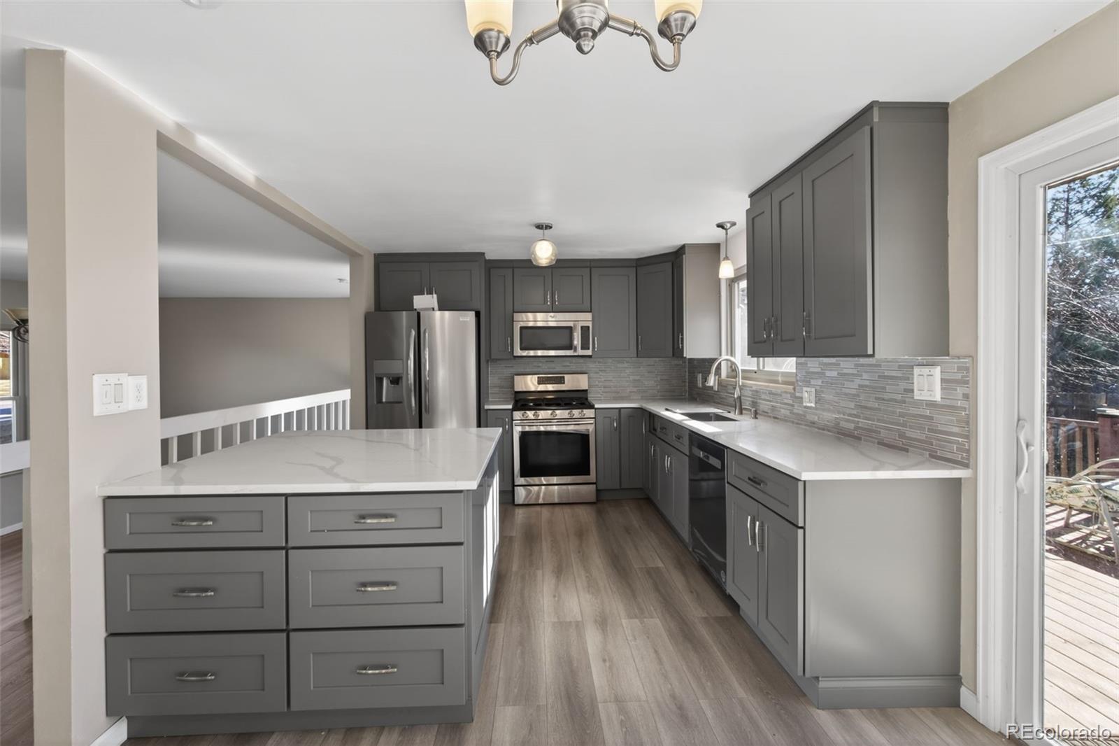Welcome to this beautifully updated 5-bedroom home in the Palos Verdes neighborhood of Centennial. Sitting on nearly a quarter acre in the Cherry Creek School District, it offers both comfort and convenience. Inside, you’ll find fresh paint, new laminate flooring, and a fully upgraded kitchen with new cabinets, a modern sink, quality appliances, and plenty of clean style. The family room feels warm and inviting with its new gas fireplace, and the spacious sunroom is filled with natural light and can be enjoyed all year round. The master bathroom has been completely remodeled, and the home has newer siding, a newer furnace, and a newer hot water heater. The backyard is private and ready for gatherings on the deck, while the partially finished basement and attached garage add even more flexibility. With parks, trails, shopping, and major routes nearby, this home is move-in ready and made for everyday living. Schedule our private showing today!