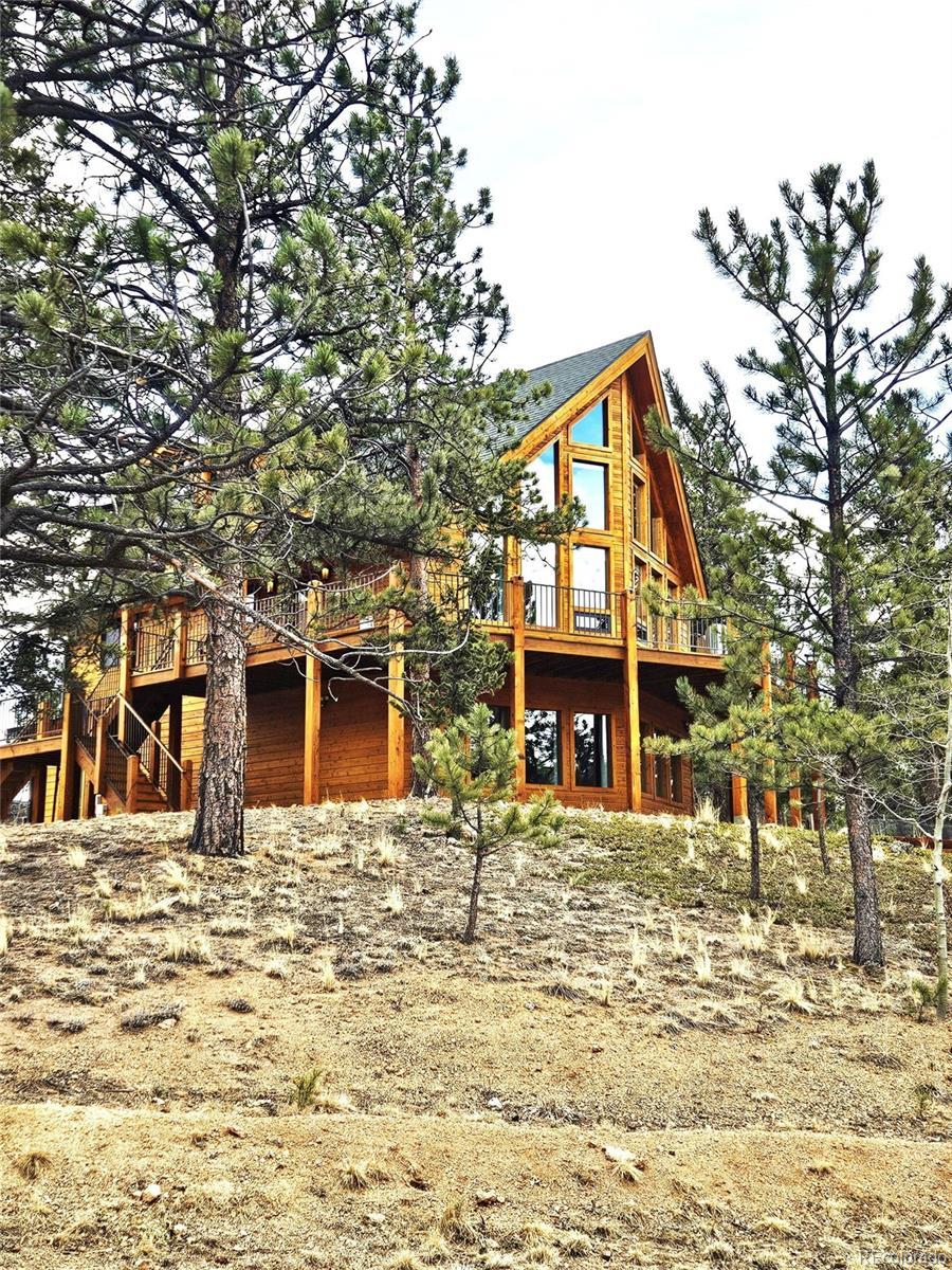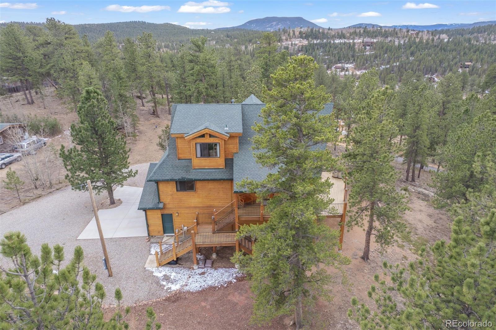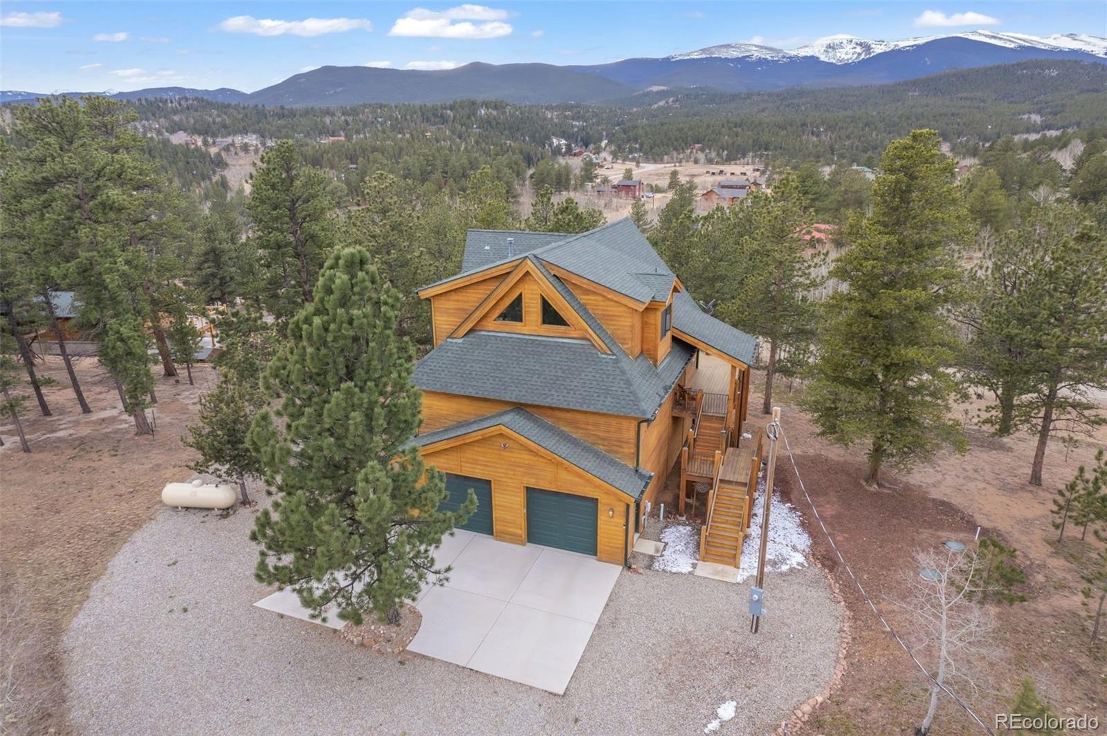 Welcome to this stunning custom mountain chalet, nestled in a breathtaking valley with spectacular 180* views of the Rocky Mountains. The striking exterior showcases elegant cedar siding. A 180-degree wraparound redwood deck features low-profile, no-maintenance railings. It’s perfect for enjoying crisp mountain air or hosting friends under a starlit sky. Step inside on the second floor to discover meticulous upgrades throughout. The bright, open-plan living area has soaring ceilings. A wall of windows floods the space with natural light. The windows offer seamless views above the tree line to the southwest, highlighting the surrounding wilderness. The inviting living room features hickory floors and a gas fireplace, creating an ideal spot to relax, watch sunsets, and enjoy the changing seasons. A beautiful gourmet kitchen flows effortlessly into the dining area. The dining space opens directly onto the redwood deck, making it perfect for entertaining. On the main floor, you’ll find two oversized secondary bedrooms, one with a four-piece ensuite bath for added comfort and privacy. Upstairs, the primary suite is a serene retreat with a loft sitting area and mountain views. The spa-like bath features a soaking tub, walk-in shower, dual vanities, and a heated towel rack for relaxation. The fully finished, above-grade walk-out lower level provides a spacious, flexible area. It is ideal for a home office, recreation room, den, or craft space. A three-quarter bath and two walk-in closets complete this versatile level. The oversized two-car garage offers ample storage for vehicles and gear. Ideal for ATV/UTV riding, horseback riding, hunting, and hiking. Access Mount Evans/Blue Sky Wilderness Trails and Meridian Trailhead. Just 60 minutes from Denver and Red Rocks. Both Breckenridge Ski Area and Denver International Airport are 90 minutes away. Don’t miss the chance to experience this serene mountain retreat.
