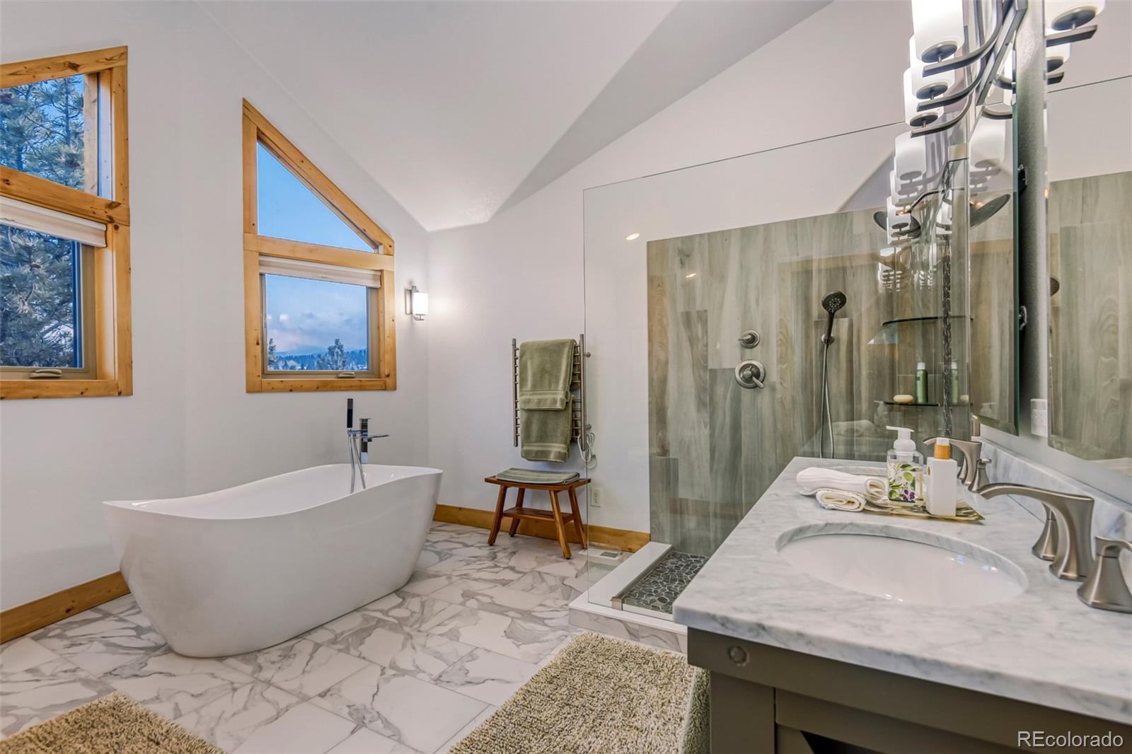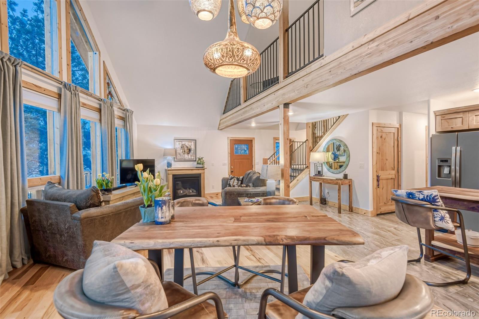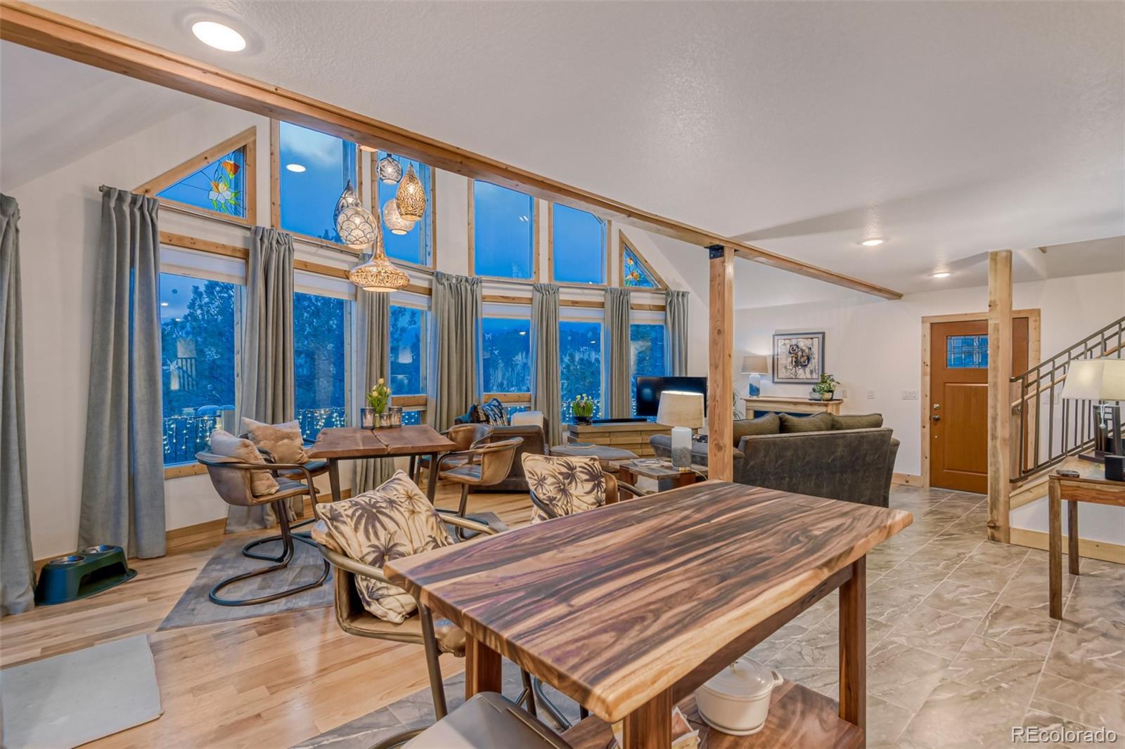 Welcome to this stunning custom mountain chalet, nestled in a breathtaking valley with spectacular 180* views of the Rocky Mountains. The striking exterior showcases elegant cedar siding. A 180-degree wraparound redwood deck features low-profile, no-maintenance railings. It’s perfect for enjoying crisp mountain air or hosting friends under a starlit sky. Step inside on the second floor to discover meticulous upgrades throughout. The bright, open-plan living area has soaring ceilings. A wall of windows floods the space with natural light. The windows offer seamless views above the tree line to the southwest, highlighting the surrounding wilderness. The inviting living room features hickory floors and a gas fireplace, creating an ideal spot to relax, watch sunsets, and enjoy the changing seasons. A beautiful gourmet kitchen flows effortlessly into the dining area. The dining space opens directly onto the redwood deck, making it perfect for entertaining. On the main floor, you’ll find two oversized secondary bedrooms, one with a four-piece ensuite bath for added comfort and privacy. Upstairs, the primary suite is a serene retreat with a loft sitting area and mountain views. The spa-like bath features a soaking tub, walk-in shower, dual vanities, and a heated towel rack for relaxation. The fully finished, above-grade walk-out lower level provides a spacious, flexible area. It is ideal for a home office, recreation room, den, or craft space. A three-quarter bath and two walk-in closets complete this versatile level. The oversized two-car garage offers ample storage for vehicles and gear. Ideal for ATV/UTV riding, horseback riding, hunting, and hiking. Access Mount Evans/Blue Sky Wilderness Trails and Meridian Trailhead. Just 60 minutes from Denver and Red Rocks. Both Breckenridge Ski Area and Denver International Airport are 90 minutes away. Don’t miss the chance to experience this serene mountain retreat.