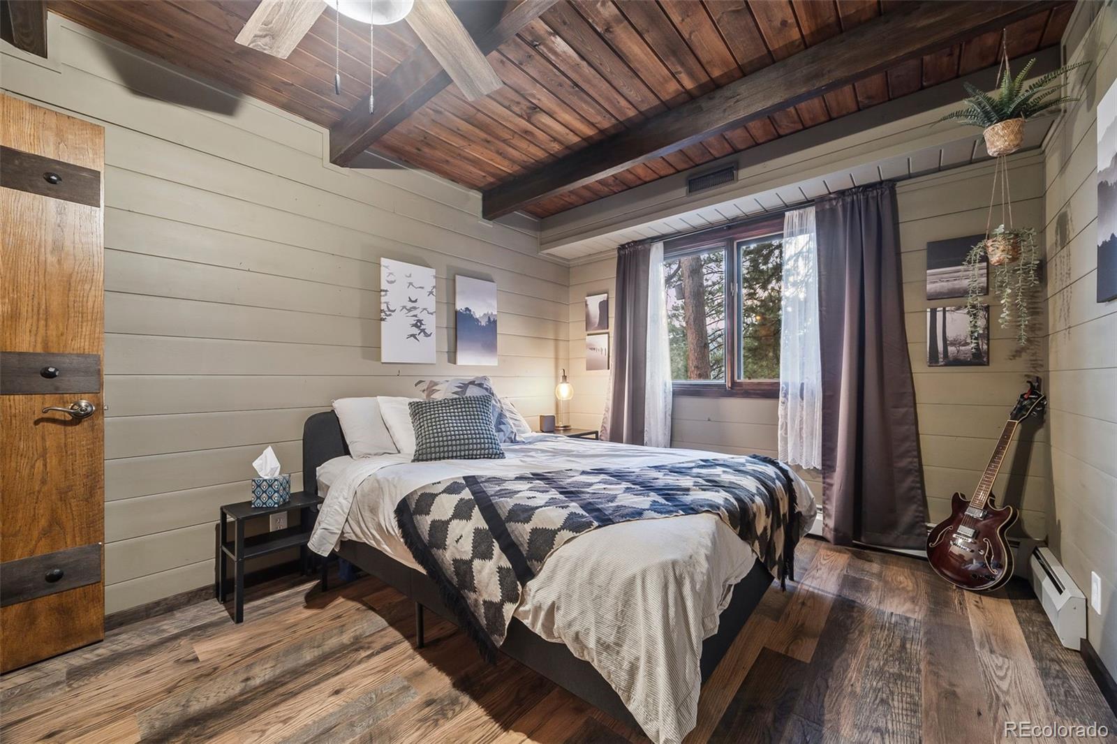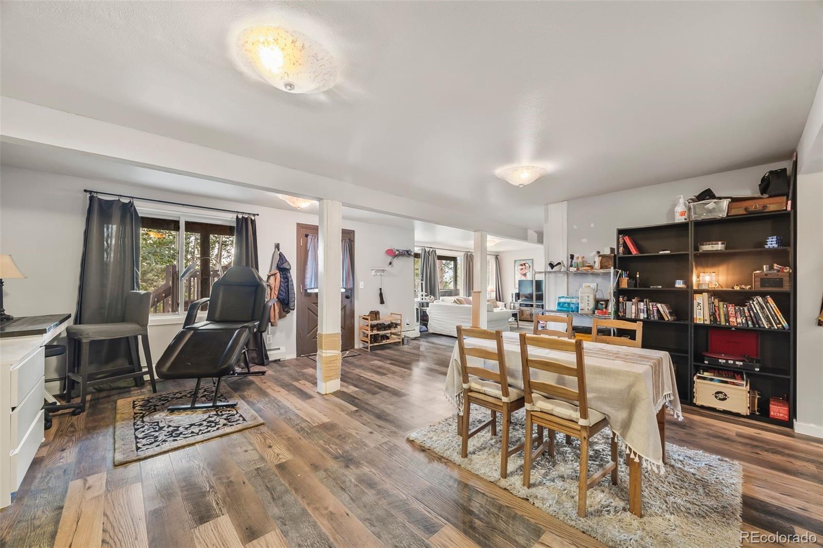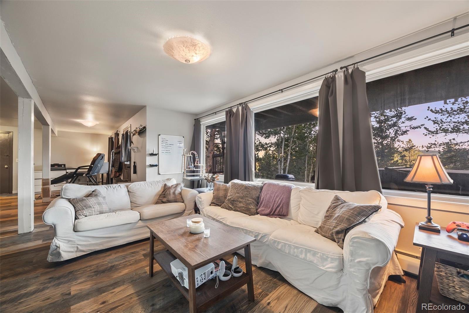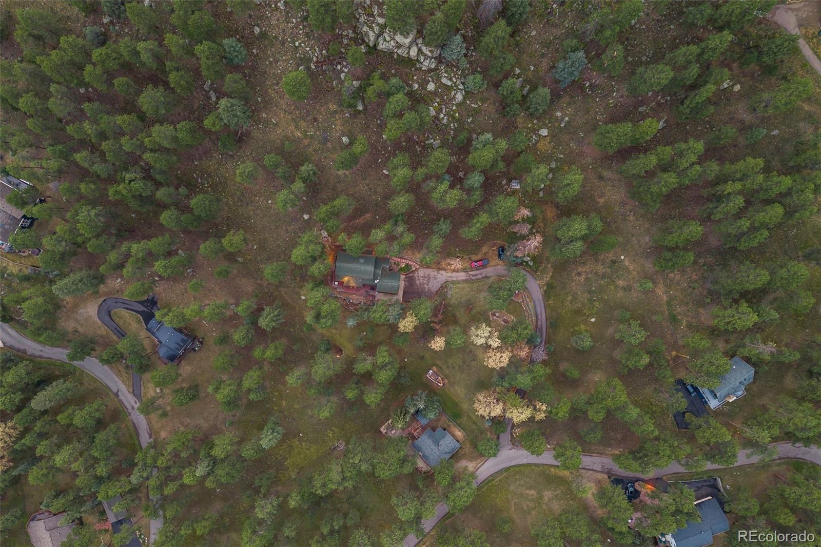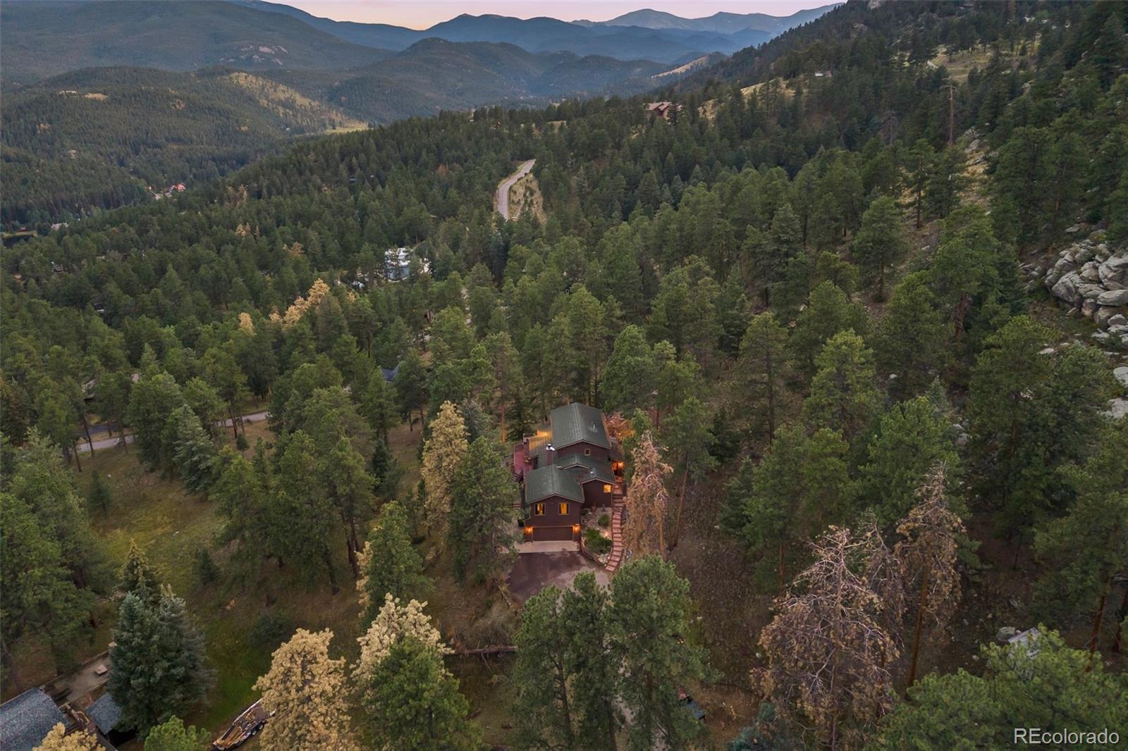Nestled in the serene mountains of Evergreen, this unique 5-bedroom, 3.5-bathroom home offers rustic charm blended seamlessly with modern upgrades, set on a combined 10.72 acre property. Step through the entry foyer into a spacious great room featuring a cozy wood-burning stove and French doors that open to the outdoors. The adjacent kitchen is a true chef’s delight, boasting a central island, granite countertops, stainless steel appliances, double sinks, and double ovens. Nearby, a charming family room showcases white shiplap walls and additional exterior access, perfect for indoor-outdoor living. Enjoy meals with a view in the dedicated dining area framed by five oversized windows. The main level offers a highly functional and versatile layout, featuring a separate formal living room perfect for entertaining, a spacious bedroom ideal for guests or main-level living. You'll also find a well-appointed 3/4 bathroom, a convenient powder room, and a dedicated laundry area adding to the comfort and practicality of daily living. Upstairs, the spacious primary suite features dual closets and a luxurious 5-piece en suite, recently updated with a freestanding tub, modern walk-in shower, and double vanity. A second upstairs bedroom also features shiplap accents for a cohesive mountain aesthetic. The finished walk-out basement expands the living space significantly. It includes a full second living area with a spacious family room, a dining nook, and a fully equipped kitchenette. Two additional bedrooms and a full bathroom complete the lower level, offering privacy and flexibility for a variety of lifestyles. Step outside to a large wraparound deck surrounded by towering pines and tranquil views. Just minutes from downtown Evergreen and the Mt. Evans Wilderness, this home offers privacy, character, and convenience. Beautiful woodwork and thoughtful details throughout make this a truly special mountain retreat.