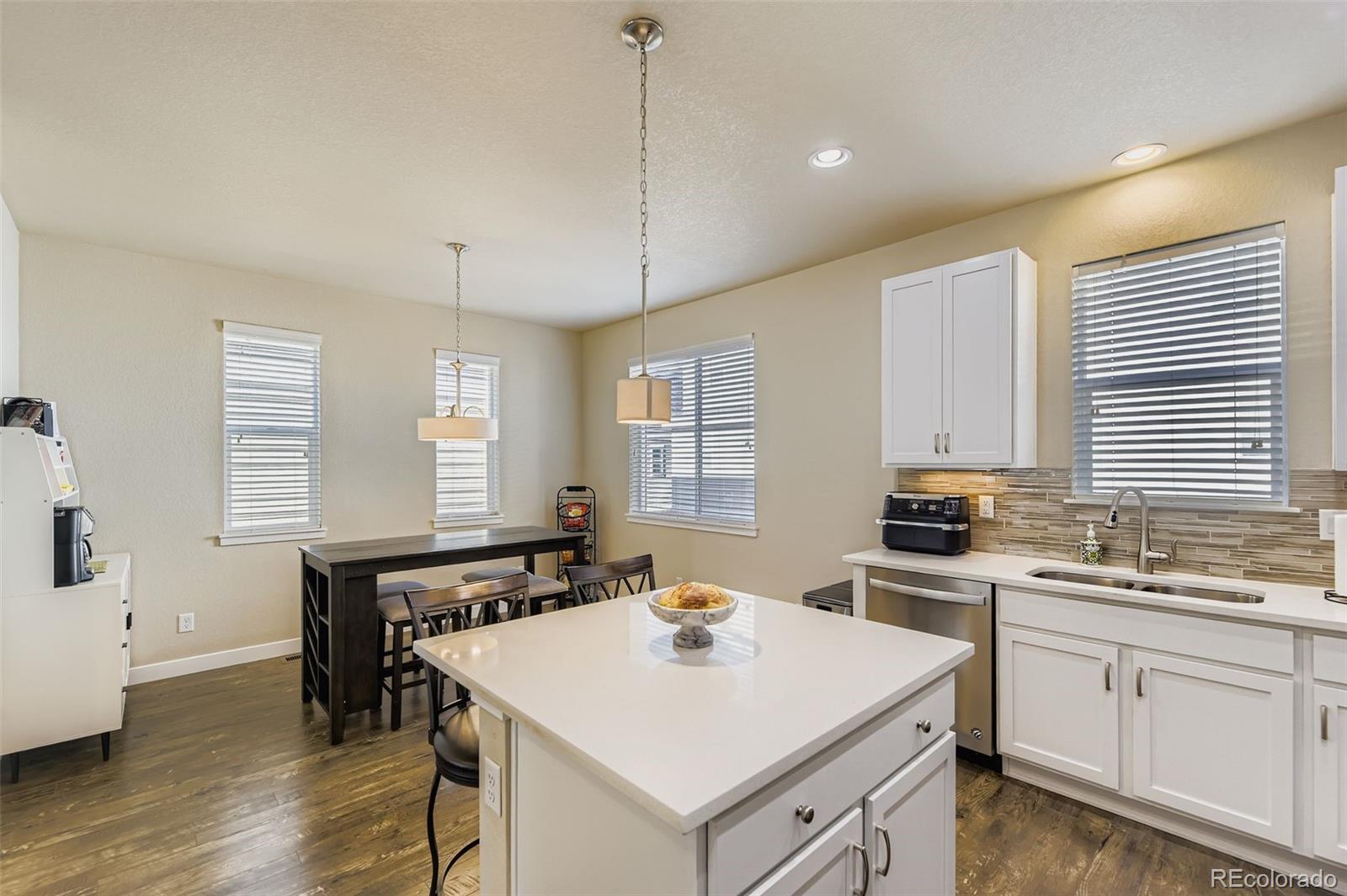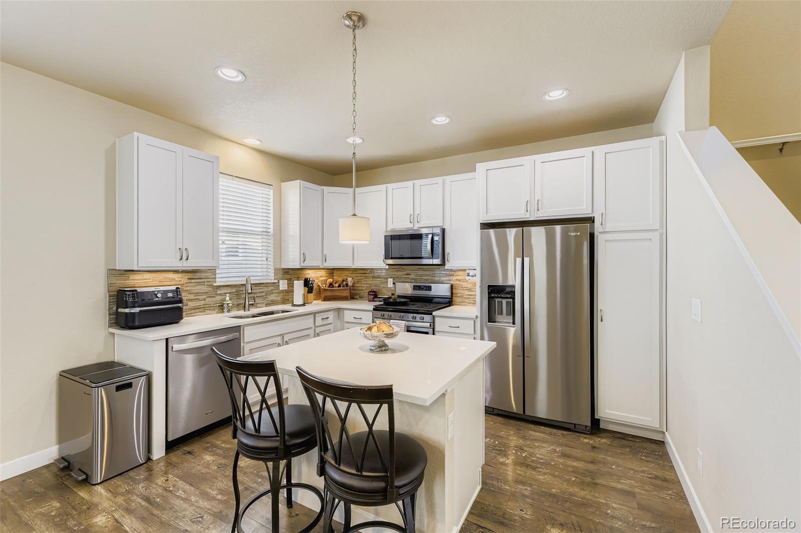 Gorgeous 3-story detached condo lives like a single family home. Low maintenance living. This beautiful home features 3 bedrooms, 2.5 baths, living room, dining nook, kitchen, mudroom and 2 car attached garage. Pride of ownership shines throughout. Enjoy relaxing on the deck or the covered front porch. The kitchen is well appointed with slab quartz counters & island, stainless steel appliances (gas range), tile backsplash and under cabinet lighting The many windows throughout allow the natural sunlight to cascade in - bright and cheerful. Neutral tones make it easy to picture yourself calling this one home. Easy / quick access to Cherry Creek Reservoir, shopping, dining, entertainment and other amenities such as Heather Ridge Golf course and light rail. Ample visitor parking available. Furniture and gas grill are negotiable. Don't miss your opportunity. Welcome Home!
