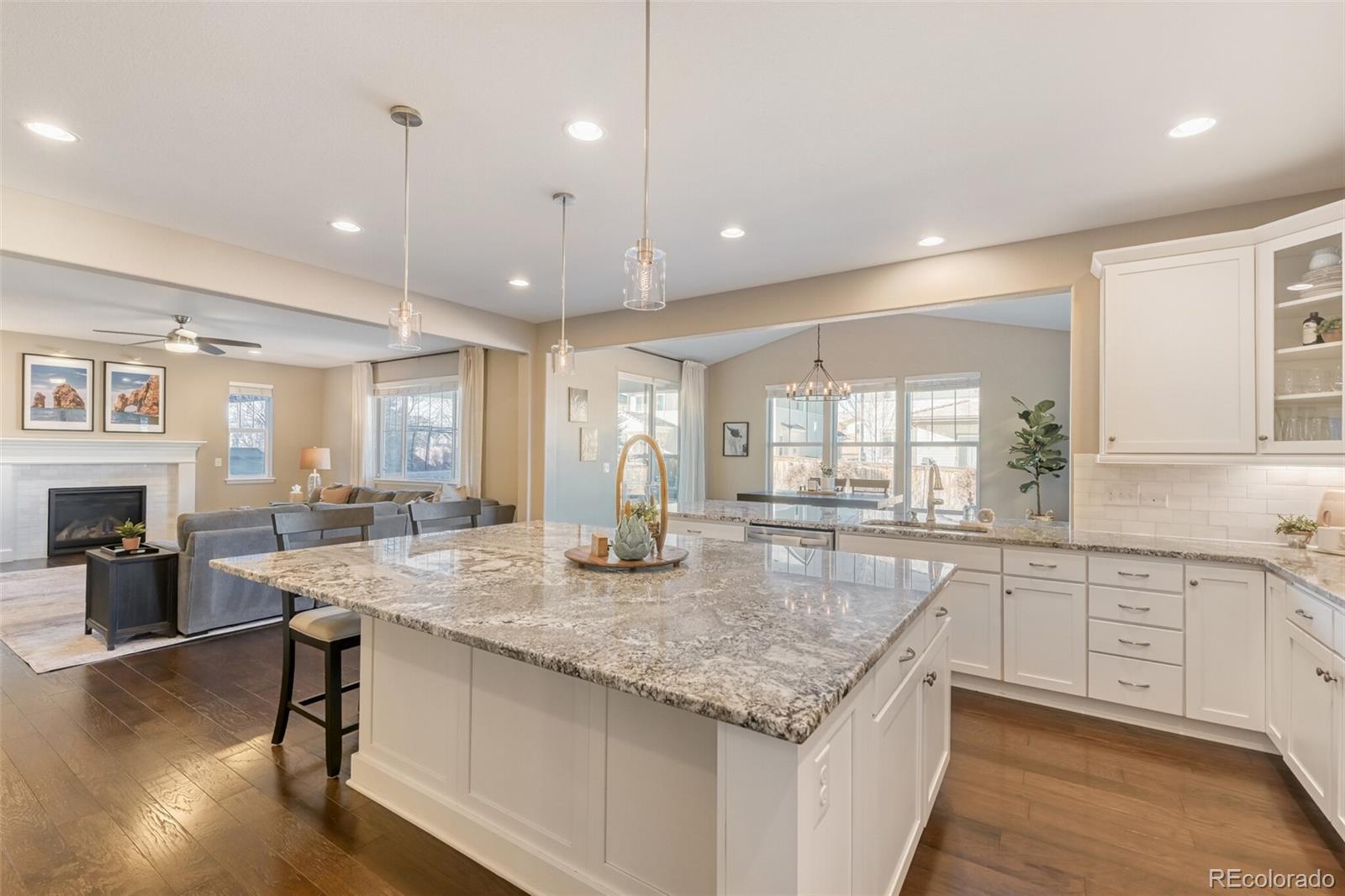 Welcome home to 14368 Double Dutch Cir, an exceptional south-facing Craftsman-style home in the highly desirable Stepping Stone community in Parker, CO. A charming front porch welcomes you into a warm and inviting entry, where a formal dining room with tray ceiling and bay window creates an elegant first impression. Gorgeous hardwood floors lead into the heart of the home—a bright, open-concept kitchen that truly stands out as an entertainer’s dream, featuring white cabinetry, an oversized statement island, granite countertops, a five-burner gas cooktop, stainless steel appliances including double ovens, and a walk-in pantry. The kitchen opens seamlessly to the great room w/ gas fireplace, perfect for cozy nights in and the breakfast nook/sunroom, which flows to a covered patio, ideal for indoor–outdoor living. The main floor also includes a private office w/walk-in closet, and adjacent half bath, plus a functional mudroom/closet and access to the three-car garage. Upstairs, the oversized primary suite features tray ceilings, backyard views, and a five-piece en-suite bath with soaking tub, walk-in shower, and dual walk-in closets. A charming light-filled loft provides flexible living space. Additional 3 bedrooms share a full bath w/double vanity near upstairs laundry. The professionally finished basement offers high ceilings, two bedrooms, a full bath with walk-in shower, expansive flexible living/game room space, ample storage, and plumbing for a future wet bar. Enjoy neighborhood trails, community amenities, and a short walk to the private pool. This home is a must-see!