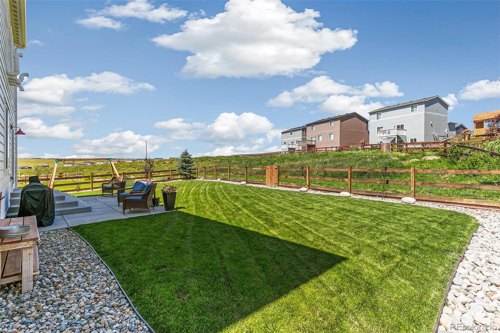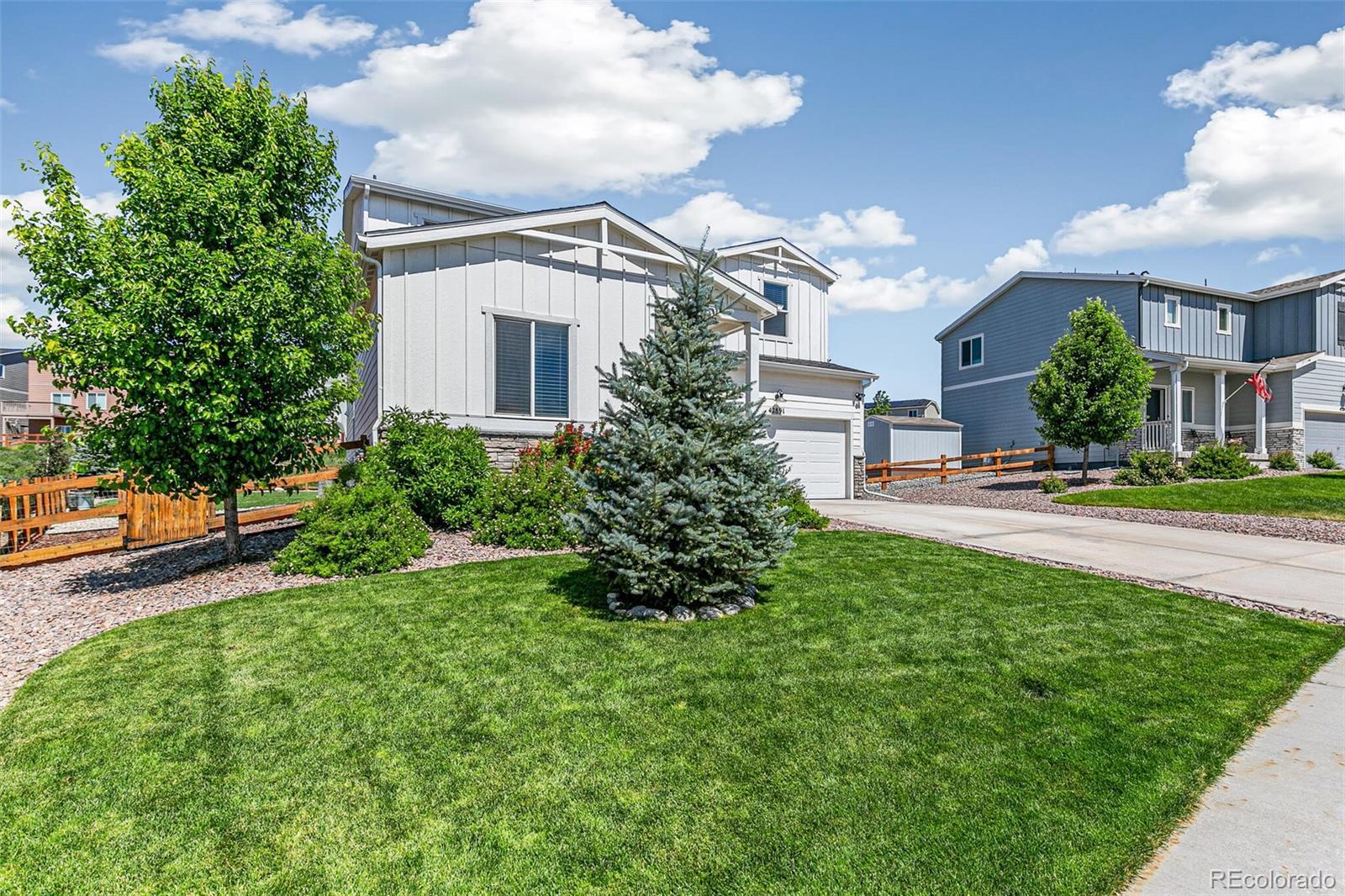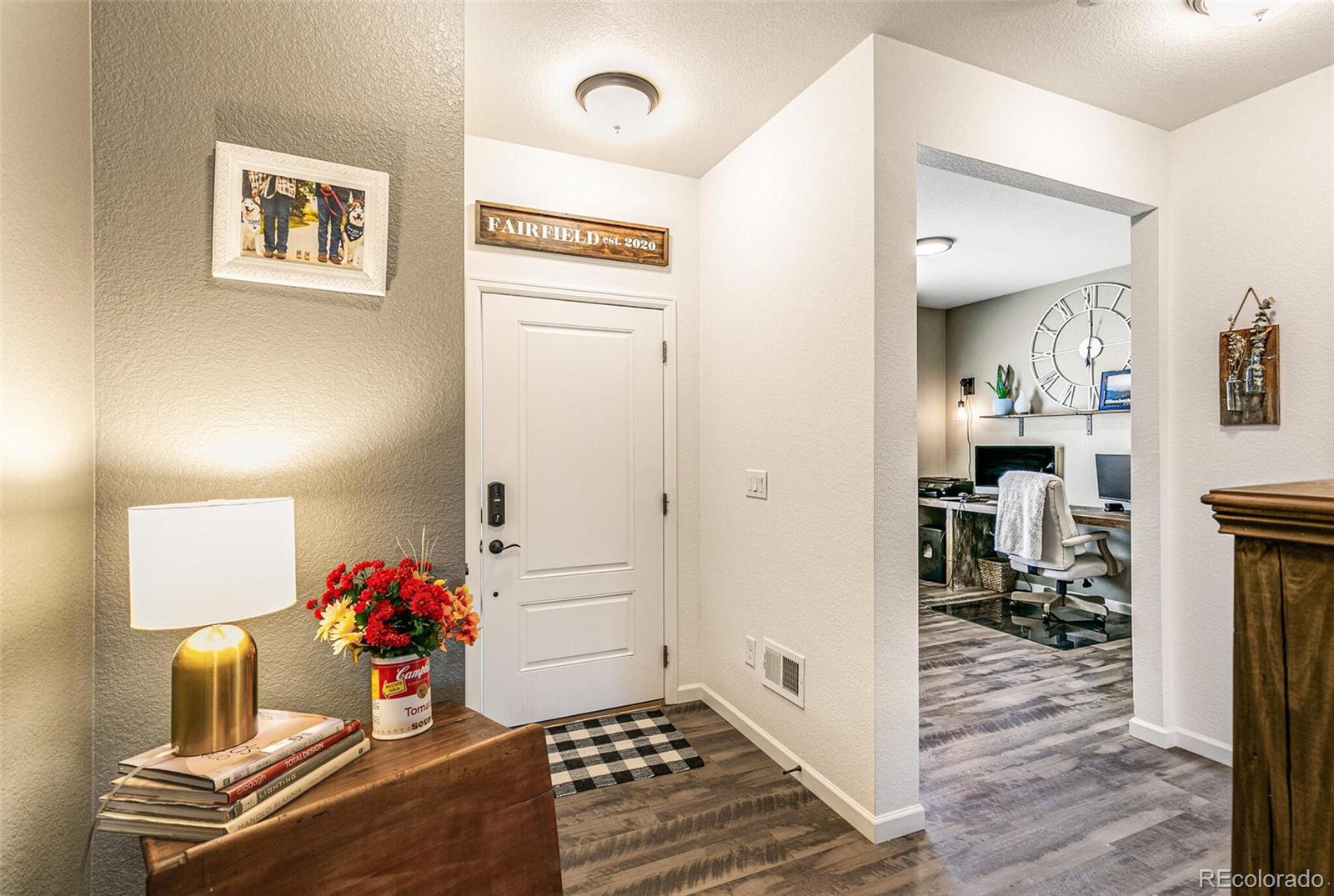 This home is better than new with all it's updating! No need for landscaping and window coverings here! This home has been maintained and upgraded with lots of loving care and displays pride of ownership. Since being purchased, the kitchen has been updated with custom cabinets, quartz counters. Included is a pot rack, and all kitchen appliances, along with a custom, unique cabinet with a bar refrigerator that allows for extra storage and space to display whatever suites your needs. Throughout the main floor you will discover luxury vinyl plank flooring (also in all the bathrooms), a main floor bedroom that is currently used as a home gym, a full bath and an office with great natural lighting and a built in desk. The stairway has been updated with a custom hand railing, metal spindles, a wood wall and a half "barn door" gate at the top of the stairs. New lush carpet has recently (2025) been installed on the stairs and upper floor that your feet will love! The primary bath has a barn door, custom cabinets and a quartz counter as well as two sinks. Other improvements include new sliding glass back door, a whole house water filtration system, a ring doorbell and cameras and a new impact resistant shingle roof (2023). The home owner has a green thumb and the yard is beautifully maintained and features a patio, strawberry garden, built in fire pit and backs to open space. This home says "I live in Colorado". Several parks close by. Lots of summer neighborhood events. Across the street from the Spring Valley Ranch golf course and clubhouse which features great food!