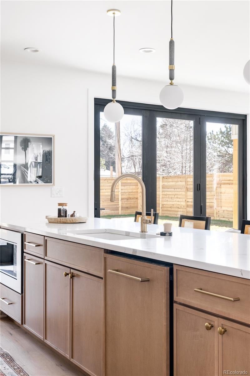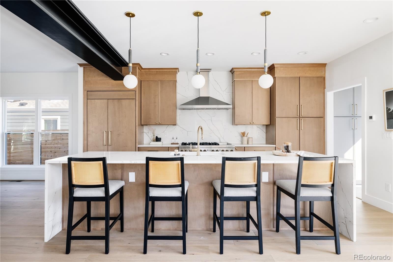 This is the one you've been waiting for! Brand new construction, this beautiful custom home was thoughtfully designed by Studio Thomas, with each detail carefully chosen to create a seamless blend of comfort and luxury, while staying on trend. Your new home features level 5 drywall and expansive white oak engineered wood floors throughout. Your kitchen is as beautiful as it is functional with a paneled refrigerator and dishwasher and comes equipped with top of the line JennAir appliances that will have you cooking like a pro. Your large kitchen island with waterfall quartz counters provides plenty of room to prep or dine. Open up the huge accordion panel doors in your living room, to expand your entertaining area and provide indoor/outdoor living that flows from your living room to your back covered patio. The floating staircase provides a design focal point leading to both the upstairs and basement levels of the home. On the second floor, every bedroom is a suite, with its own en suite full bath, providing convenience and comfort to everyone. The primary suite is truly special with soaring vaulted ceilings, and an impressive 5 piece bath with freestanding tub, oversized frameless shower, and an enormous closet. You'll have the option to upgrade the closet customizations if you choose. The basement is the perfect location to relax and watch a movie with a large living area, wet bar that would make any regular kitchen jealous, bedroom, and full bath. Two high efficiency AC units and two high efficiency furnaces will ensure comfortable living on all three floors year round. The low maintenance yard includes a sprinkler system and is fully fenced for privacy and completed with an oversized 2 car garage. With no expense spared, this home will surely check off all the boxes on your list!