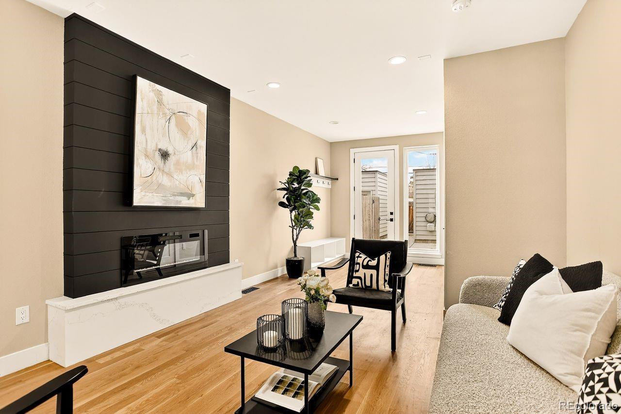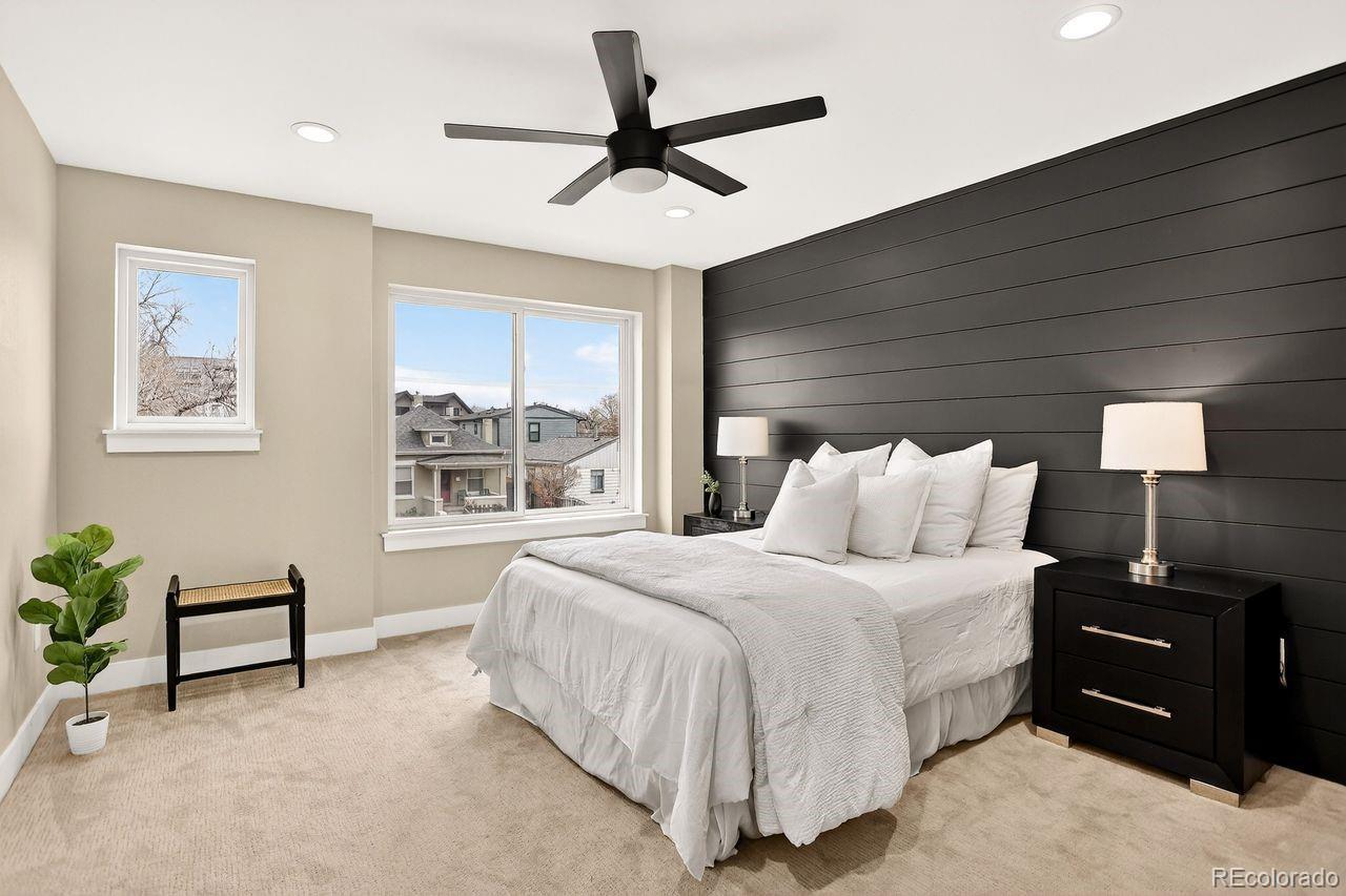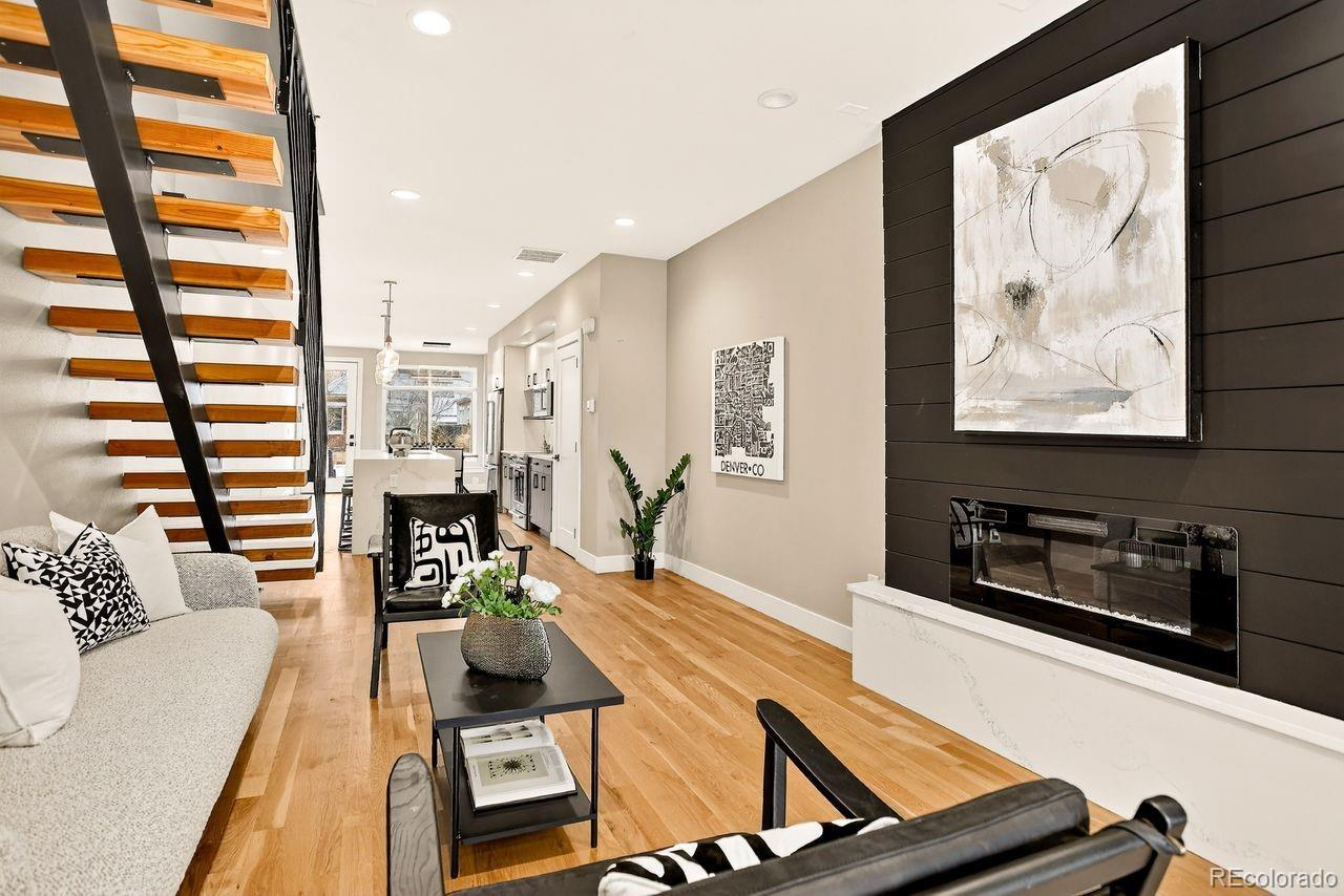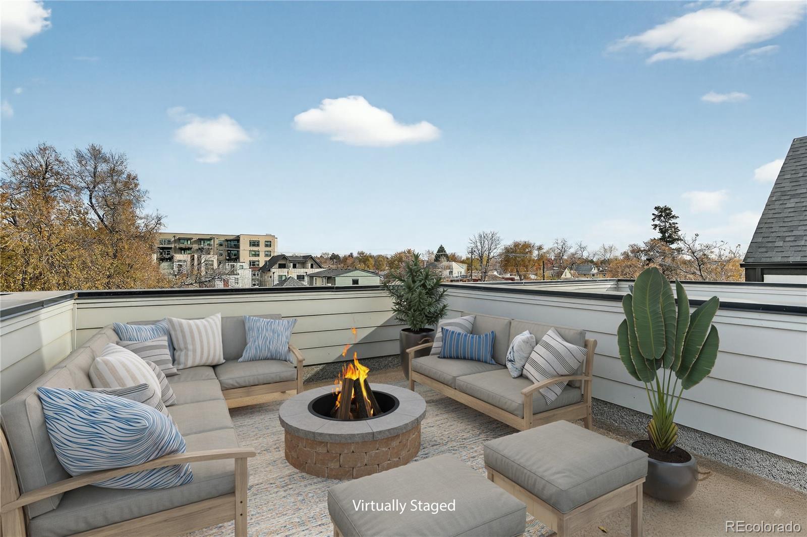 Modern living meets unbeatable views at 2179 S Bannock St. This contemporary 3-bed, 4-bath home sits just two blocks from the Evans Light Rail Station and moments from South Broadway’s top dining and entertainment, including Adrift, La Chiva, Corvus Coffee, Denver Distillery, and more. Designed with clean lines and upscale finishes, this home offers exceptional city and mountain views from TWO private rooftop decks, including a fully covered, west-facing deck that frames the skyline and Front Range in every season. Whether it’s sunrise over downtown or sunset over the Rockies, the views are truly standout. The open main level features real recently refinished oak hardwood floors and a sleek kitchen with soft-close cabinetry, a large quartz waterfall island, custom black iron shelving, under-cabinet lighting, pantry storage, and Bosch appliances. The living area includes a quartz-wrapped fireplace, pre-wired in-ceiling speakers, and a modern mono-rail staircase with wood treads and welded iron railings. Upstairs offers dual bedroom suites, each with designer tile, Euro-glass showers, quartz countertops, and contemporary lighting. Generous Andersen windows provide natural light throughout all levels. The rooftop level showcases two separate outdoor spaces, perfect for entertaining, relaxing, or simply enjoying the panoramic mountain and city views. Additional features: • Central networking panel • High-efficiency furnace and water heater • Central A/C • 1-car garage with WiFi-enabled opener + 220V EV charging • Fenced yard with concrete patio, grass, sprinklers (front & back) • No HOA A rare blend of style, location, walkability and year-round views in one of Denver’s most dynamic neighborhoods.