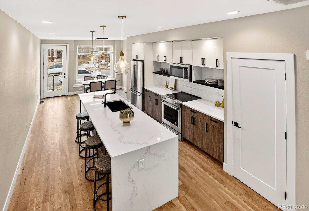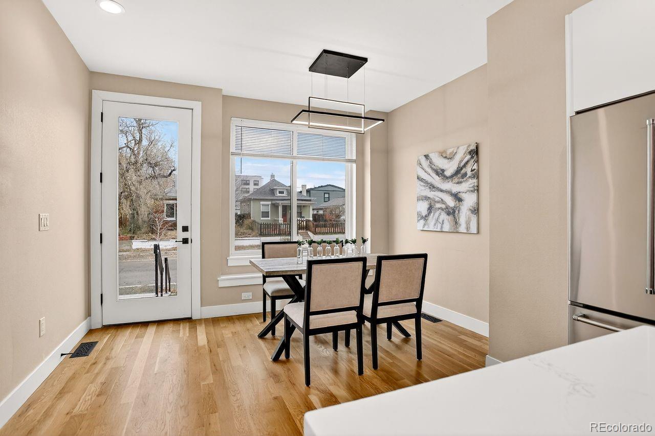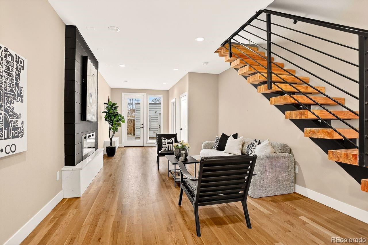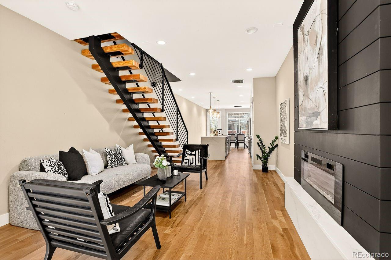 Modern living meets unbeatable views at 2179 S Bannock St. This contemporary 3-bed, 4-bath home sits just two blocks from the Evans Light Rail Station and moments from South Broadway’s top dining and entertainment, including Adrift, La Chiva, Corvus Coffee, Denver Distillery, and more. Designed with clean lines and upscale finishes, this home offers exceptional city and mountain views from TWO private rooftop decks, including a fully covered, west-facing deck that frames the skyline and Front Range in every season. Whether it’s sunrise over downtown or sunset over the Rockies, the views are truly standout. The open main level features real recently refinished oak hardwood floors and a sleek kitchen with soft-close cabinetry, a large quartz waterfall island, custom black iron shelving, under-cabinet lighting, pantry storage, and Bosch appliances. The living area includes a quartz-wrapped fireplace, pre-wired in-ceiling speakers, and a modern mono-rail staircase with wood treads and welded iron railings. Upstairs offers dual bedroom suites, each with designer tile, Euro-glass showers, quartz countertops, and contemporary lighting. Generous Andersen windows provide natural light throughout all levels. The rooftop level showcases two separate outdoor spaces, perfect for entertaining, relaxing, or simply enjoying the panoramic mountain and city views. Additional features: • Central networking panel • High-efficiency furnace and water heater • Central A/C • 1-car garage with WiFi-enabled opener + 220V EV charging • Fenced yard with concrete patio, grass, sprinklers (front & back) • No HOA A rare blend of style, location, walkability and year-round views in one of Denver’s most dynamic neighborhoods.