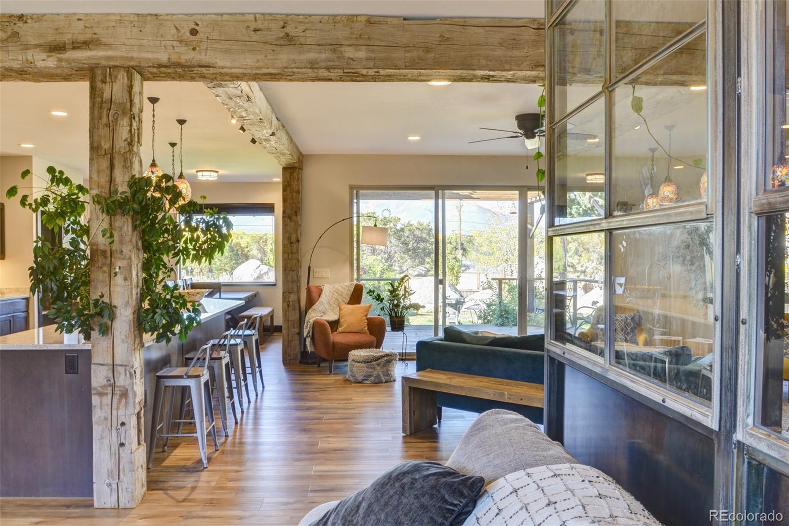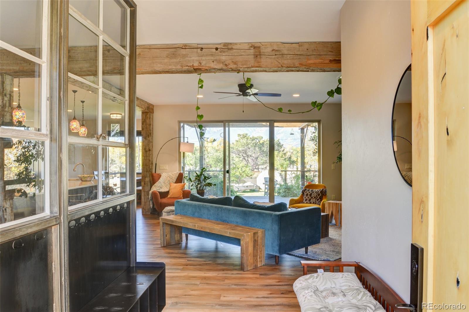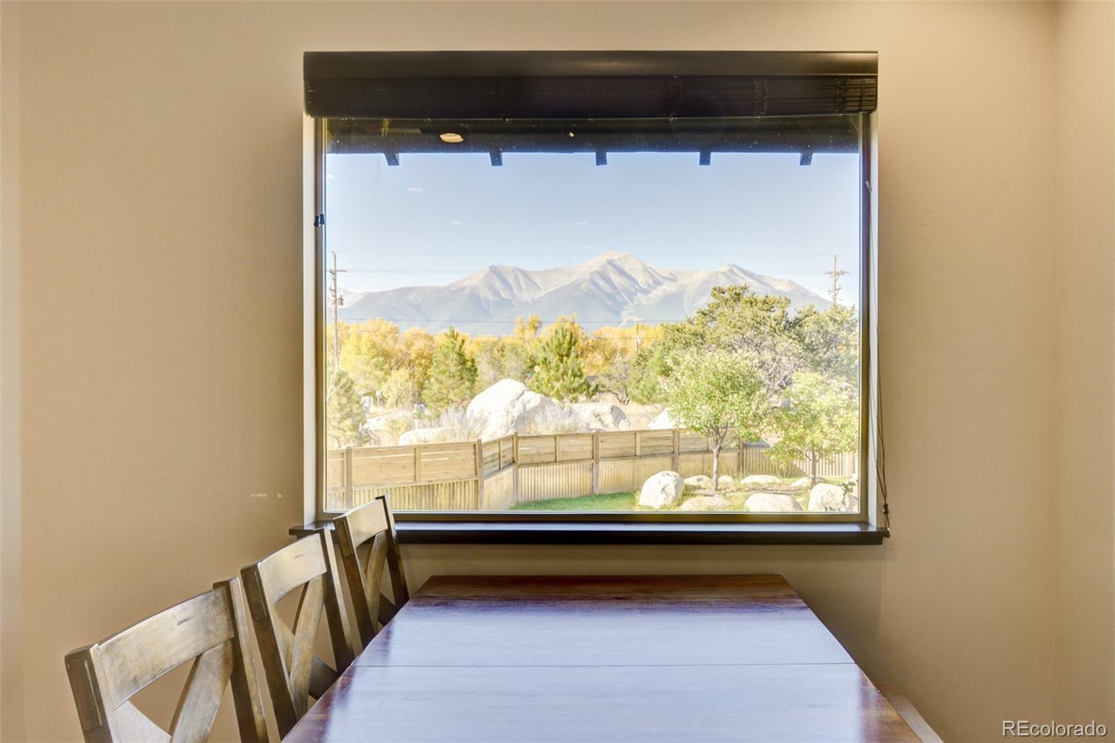 Located in one of Buena Vista’s premier neighborhoods, this custom home enjoys stunning views of Mt. Princeton and the Sleeping Indian/Midland Hill, privacy, and excellent proximity to town. Located on a quiet cul-de-sac in the River Run neighborhood, the HOA maintains a private trail along the Arkansas River from the Beaver Falls Bridge (by Ramsour Rd) to the Cottonwood Creek confluence then up to Arizona St. Quality craftsmanship and attention to detail are evident throughout the home. A unique metal divider wall with antique windows in the entry highlights the open floorplan that seamlessly connects the kitchen, dining, and two living/sitting areas making for an exceptional space for enjoying family and entertaining friends. Custom metal work, hand-picked wooden beams from a reclaimed barn in Michigan, and unique lighting add to the character and style of the home. The gas fireplace is on a thermostat and has a duct system to recirculate heat from the fireplace through the home. The primary suite enjoys a massive well-appointed bathroom, walk-in closet, and is on the opposite side of the home from the other two bedrooms. The current media room would make a great home office or guest bedroom. Many closets with lights and built-in organization throughout the home. The back deck and yard are a seamless extension of the living space. Snowberry bushes with vines adorn the custom steel & wood pergola while the fully fenced and totally landscaped yard enjoys privacy and stunning views. Over 30 trees were planted on this property including five different types of fruit trees; hope you like cherries! Above the garage is a one bedroom lock off ADU with a full kitchen and spacious living room. The ADU has lockable access to the main home and direct access outside via a private entry. The 2 Car Garage has a finished concrete floor, painted drywall finishing, tall ceilings, and plenty of storage space for gear and toys. The neighborhood is fully built and sees little traffic.
