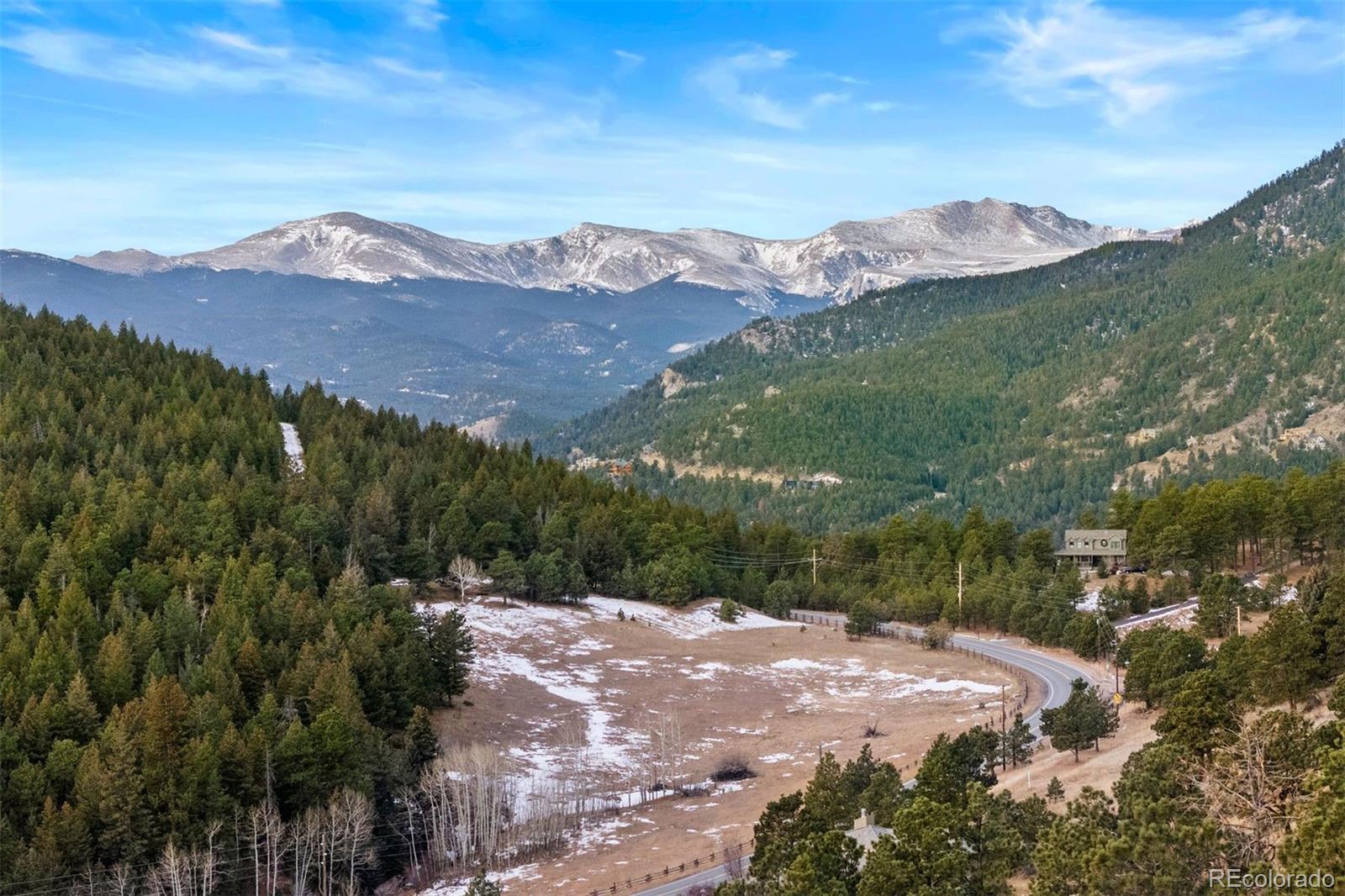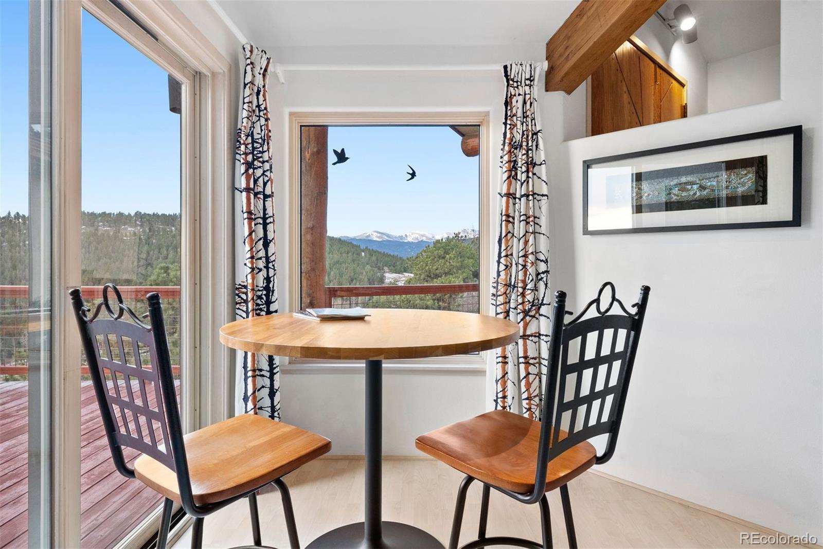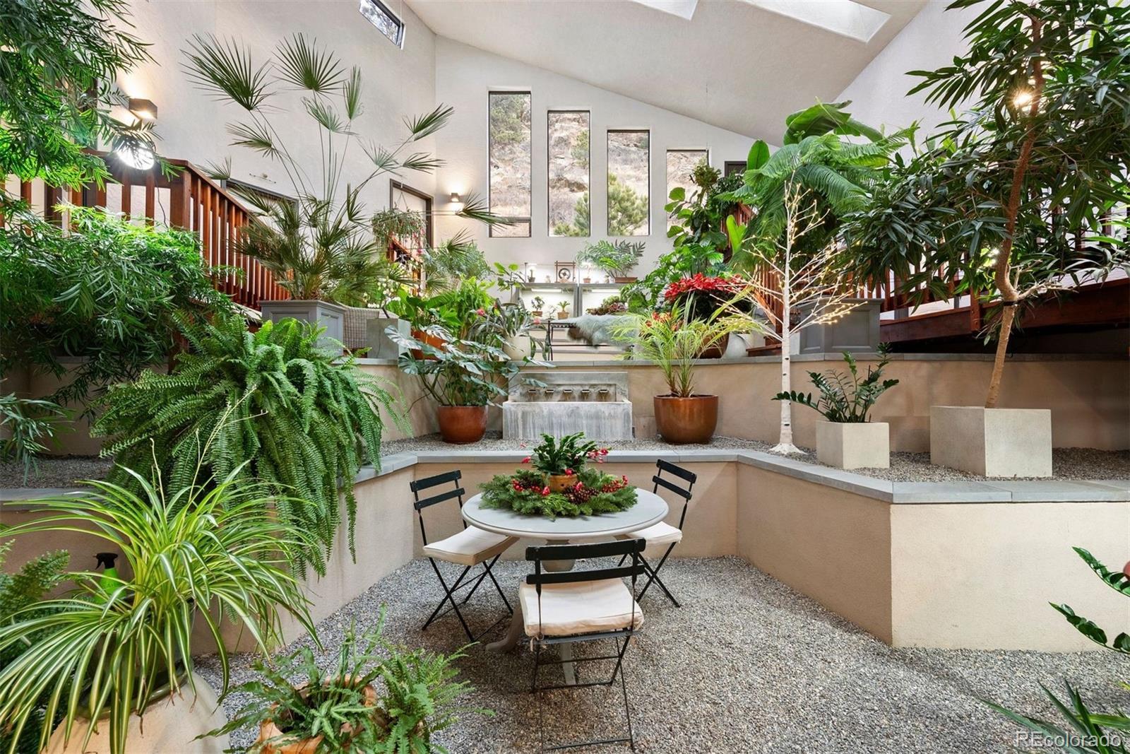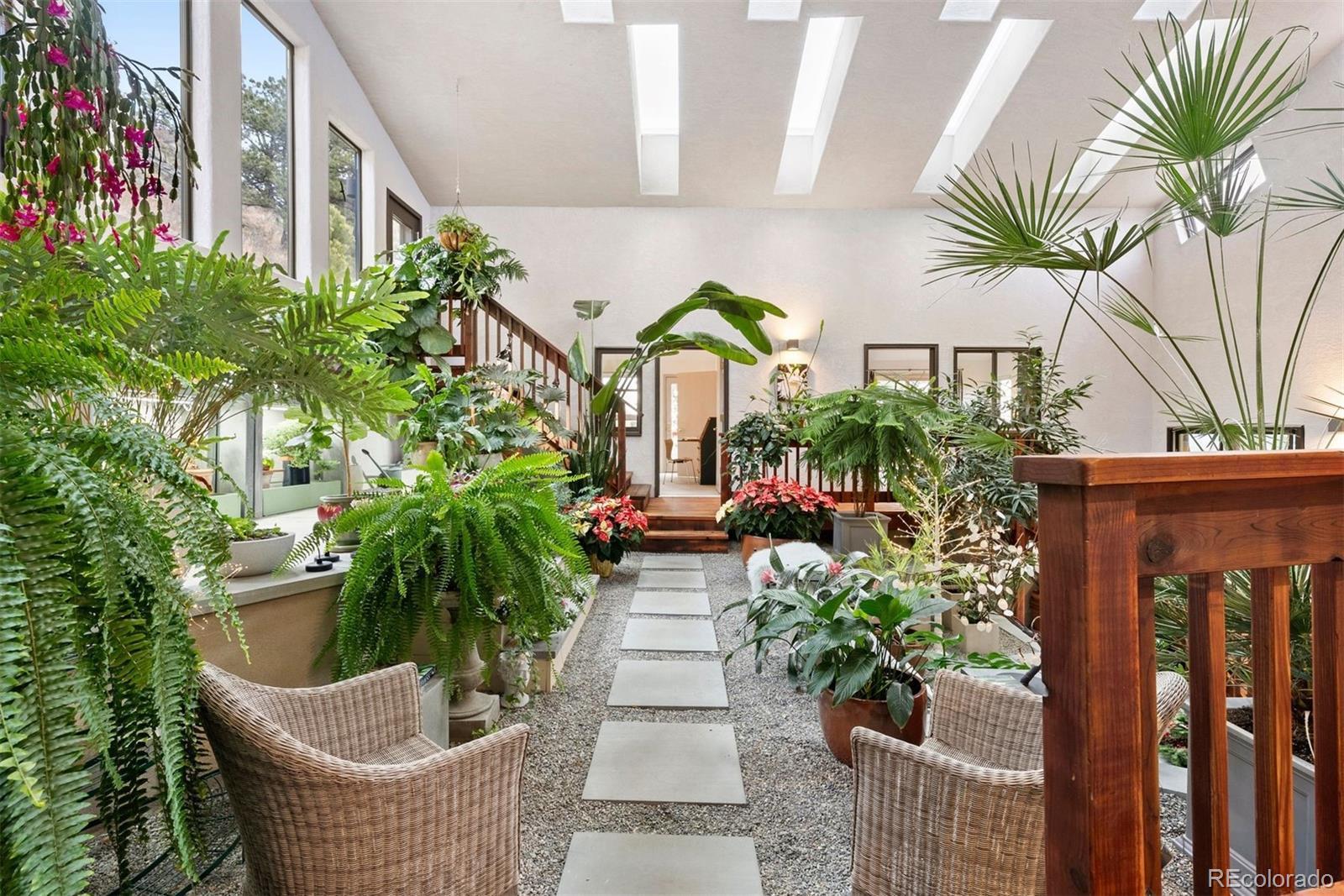 A house to live in! For work, play, creative time, family gatherings, gardening, relaxing or entertaining, this totally unique property has space that promotes a relaxed and fun lifestyle within its sky-lit and glassed walled environment. Privately set high up on six+ south-facing acres in north Evergreen, the home's contemporary design showcases Mt. Blue Sky and a towering rock promontory backdrop that hosts a pair of nesting golden eagles. The 5,700 s.f. interior includes a 925 s.f. sky-lit central atrium complete with a plethora of plants, water feature, sitting area, potting shed and gas forced air heating unit. The rest of the home has five zones of in-floor radiant heat. The wrap-around west-facing deck is graced by direct Mt. Blue Sky views and is accessed from the slate entry that features an 8' hand carved double door that depicts the heavens, and from the large comfortable living room with built-in shelving and a cheery gas fireplace that is see through to the spacious dining room. With two-story west-facing glass, the primary suite has its own patio, gas fireplace and his/her cedar lined closets. Curved slate walk-in shower offers views to the stone cliffs that border the property to the north. Step from the primary bath to one of several entrances to the entrancing atrium. The home is built around this multi-tiered space that is a joy to behold. Stairs lead up to the north lawn that provides a respite from summer heat and an ideal private picnic venue. Two Jack 'n Jill style bedrooms have cedar closets and a broad east-facing deck for beholding the mornings' sunrises. The family room/studio/play room includes a closet originally designed as a dark room with cabinets and sinks making this bright spacious room the ideal haven for any creative endeavor. Central kitchen offers exceptional storage including roll-out drawers plus a two entrance panty that doubles as a serving buffet. Tiled walk-out level includes game room, office and a full bath.