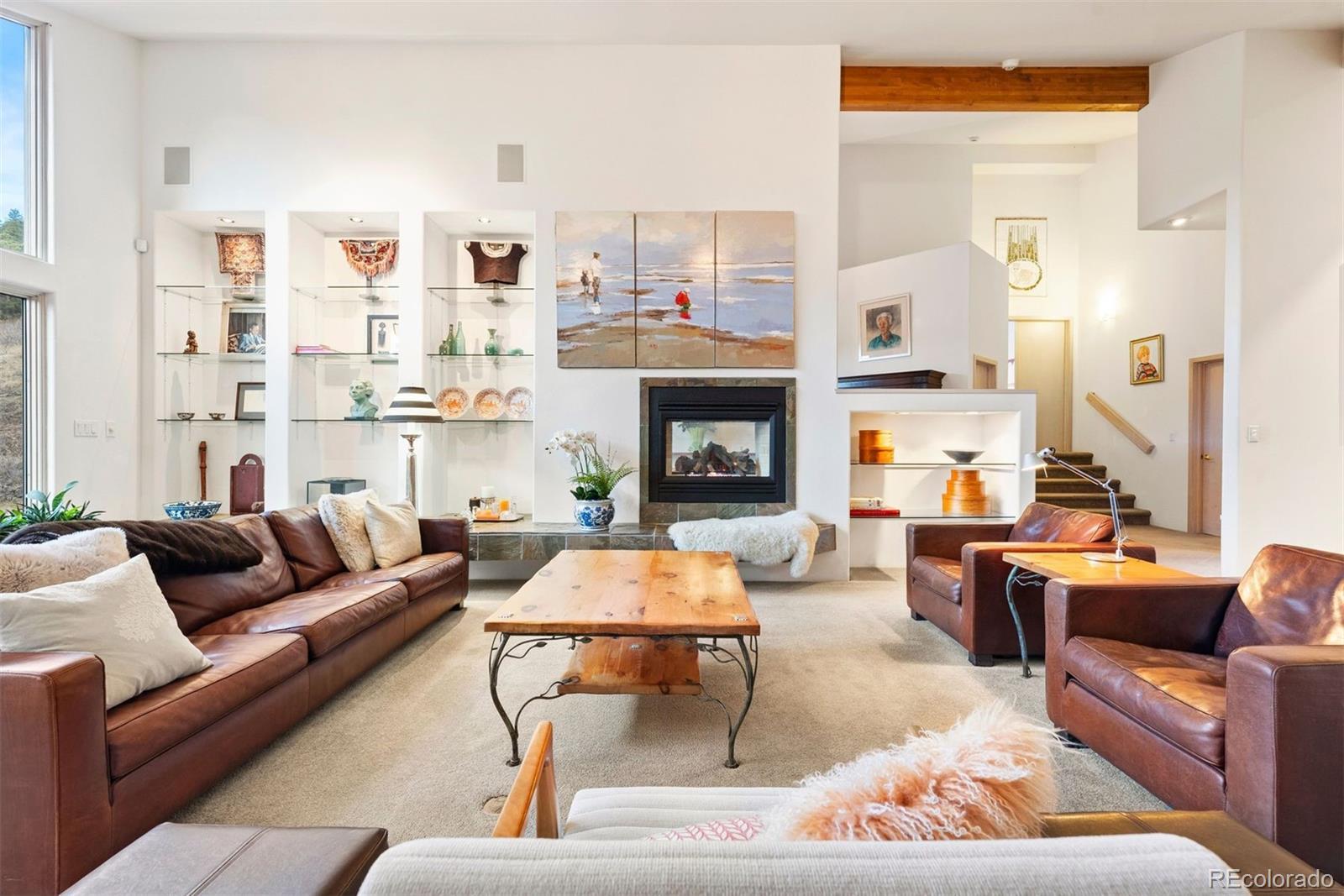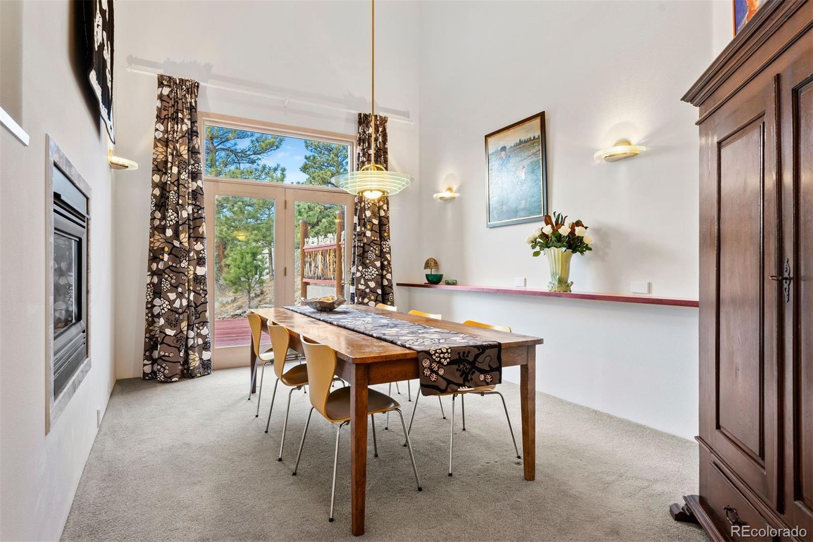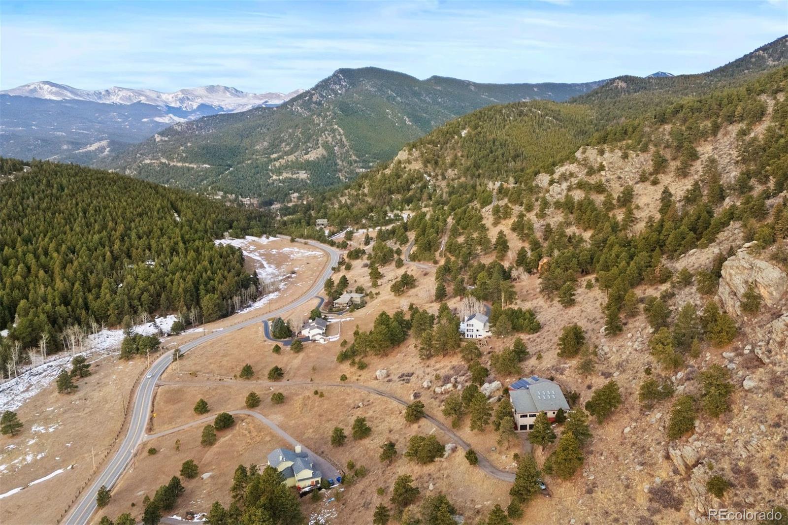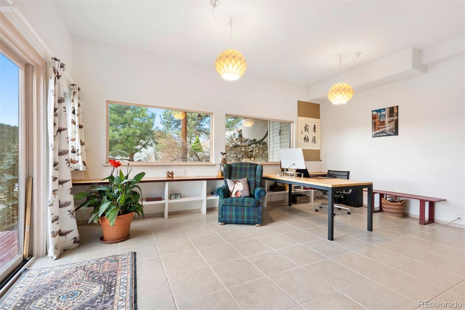 A house to live in! For work, play, creative time, family gatherings, gardening, relaxing or entertaining, this totally unique property has space that promotes a relaxed and fun lifestyle within its sky-lit and glassed walled environment. Privately set high up on six+ south-facing acres in north Evergreen, the home's contemporary design showcases Mt. Blue Sky and a towering rock promontory backdrop that hosts a pair of nesting golden eagles. The 5,700 s.f. interior includes a 925 s.f. sky-lit central atrium complete with a plethora of plants, water feature, sitting area, potting shed and gas forced air heating unit. The rest of the home has five zones of in-floor radiant heat. The wrap-around west-facing deck is graced by direct Mt. Blue Sky views and is accessed from the slate entry that features an 8' hand carved double door that depicts the heavens, and from the large comfortable living room with built-in shelving and a cheery gas fireplace that is see through to the spacious dining room. With two-story west-facing glass, the primary suite has its own patio, gas fireplace and his/her cedar lined closets. Curved slate walk-in shower offers views to the stone cliffs that border the property to the north. Step from the primary bath to one of several entrances to the entrancing atrium. The home is built around this multi-tiered space that is a joy to behold. Stairs lead up to the north lawn that provides a respite from summer heat and an ideal private picnic venue. Two Jack 'n Jill style bedrooms have cedar closets and a broad east-facing deck for beholding the mornings' sunrises. The family room/studio/play room includes a closet originally designed as a dark room with cabinets and sinks making this bright spacious room the ideal haven for any creative endeavor. Central kitchen offers exceptional storage including roll-out drawers plus a two entrance panty that doubles as a serving buffet. Tiled walk-out level includes game room, office and a full bath.