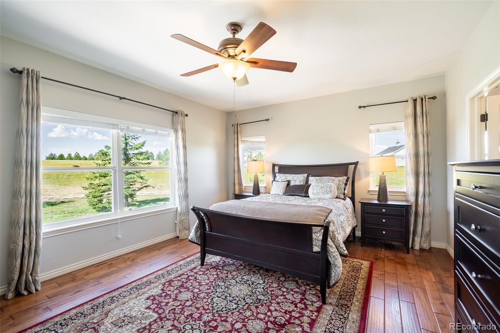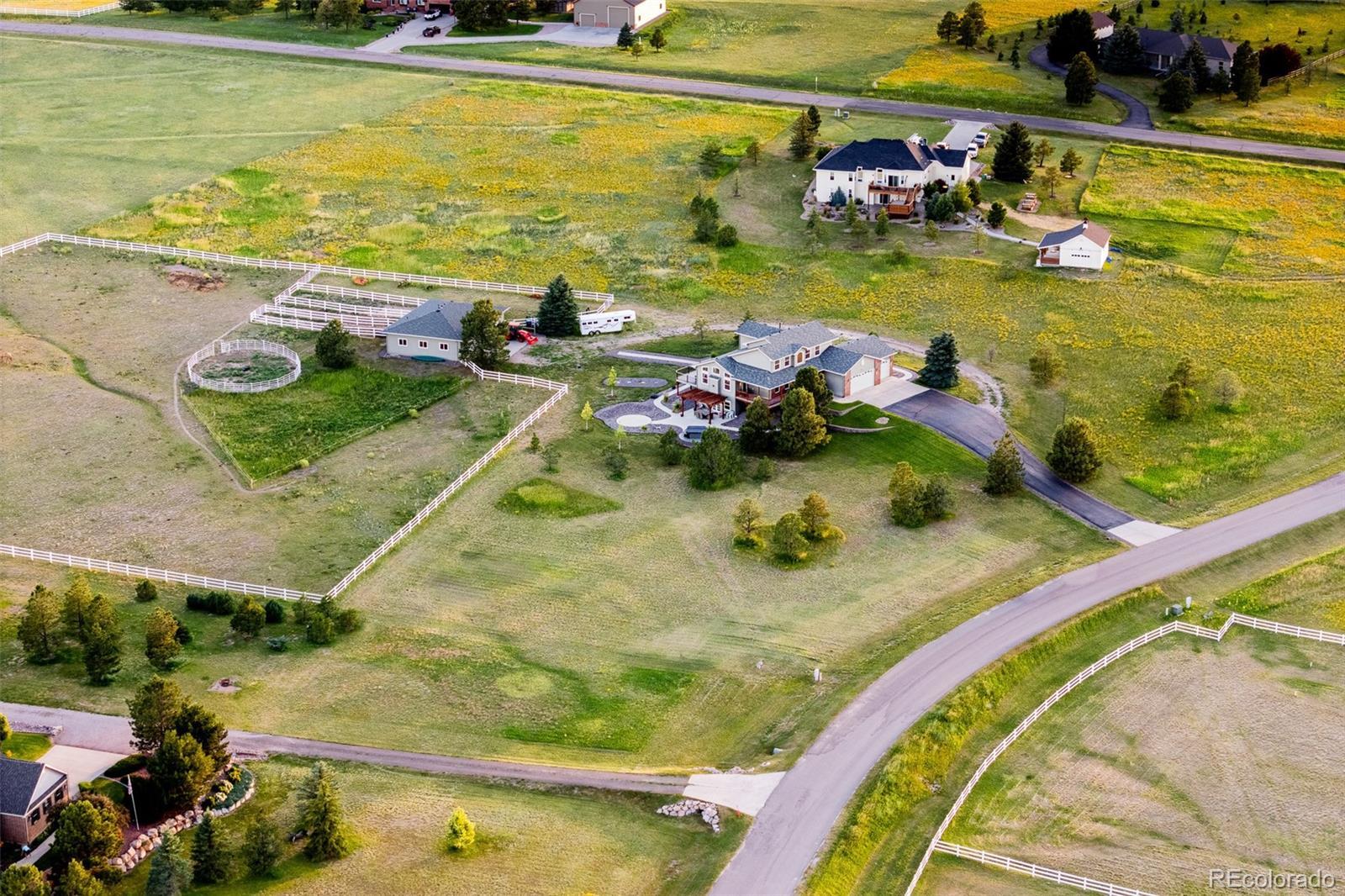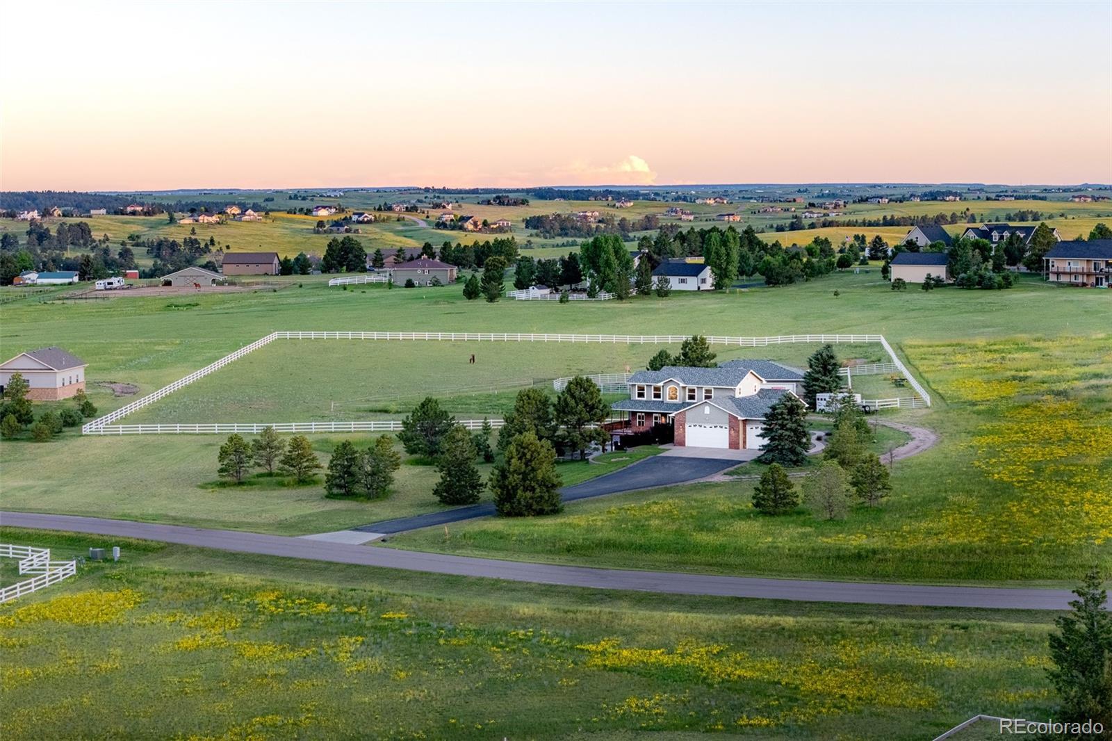 This extraordinary property seamlessly blends luxury living with equestrian elegance, situated on 5 tranquil acres in Stage Run just outside the picturesque town of Elizabeth. Offering a spacious workshop, barn, round pen, paddocks, and expansive pastures for roaming, this estate is a haven for horse enthusiasts or anyone who appreciates wide-open spaces and rural serenity. This horse-friendly neighborhood features miles of dedicated bridle paths for leisurely horseback riding and trail exploration. The main floor of this exquisite home boasts a generously sized primary bedroom, offering a peaceful retreat with abundant natural light and breathtaking views. The great room is a standout feature, highlighted by a dramatic stacked stone fireplace that serves as a stunning focal point, perfect for cozy evenings with loved ones. The open layout, flowing seamlessly into the kitchen, is ideal for both everyday living and entertaining. Upstairs, you'll find three secondary bedrooms and two bathrooms, providing ample space and privacy for the entire family. The finished basement is a true entertainer's dream, with a spacious TV area, a rec room complete with a pool table, a fully-equipped wet bar, and a walkout leading to the expansive covered patio. Step outside to discover meticulously landscaped grounds, a large deck and covered patio — perfect for enjoying Colorado's stunning weather. Additional patio spaces, including a private retreat with a hot tub, provide the ideal setting to unwind after a long day. This home has been refined with new paint and carpet, offering a clean, modern atmosphere while retaining its timeless charm. With its unbeatable location, exceptional amenities, and breathtaking views, this property truly stands as a rare gem.