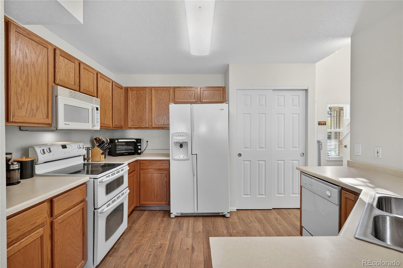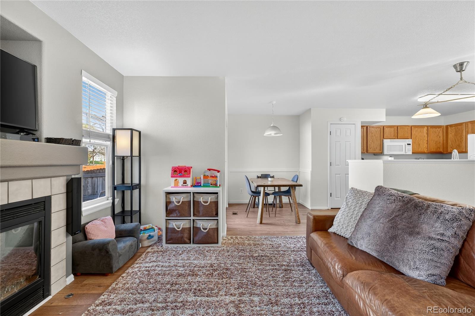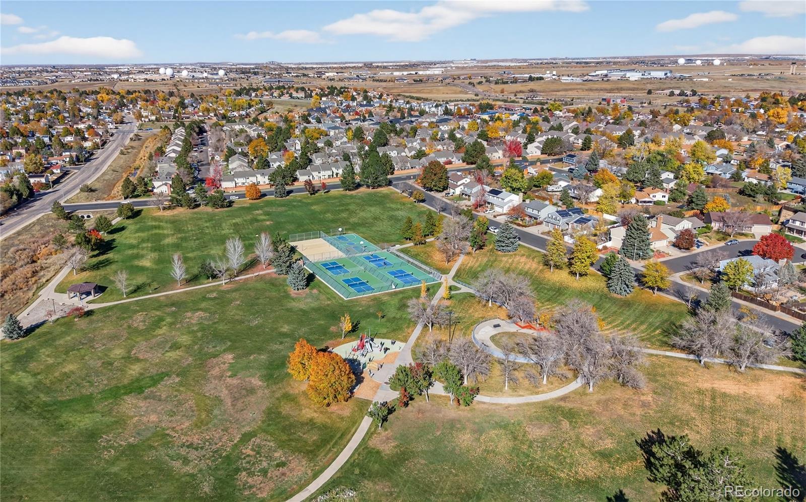 Charming, turn-key, 2-story, 2-bedroom townhome in the quiet Quail Run community. Enjoy a private fenced patio and yard that backs to open space and a peaceful greenbelt, with Highland Hollows Park just a block away. An inviting front porch welcomes you into a bright, open layout featuring new durable laminate wood floors. The cozy living room with a fireplace flows seamlessly into the dining area and spacious kitchen, perfect for entertaining or relaxing. The dining area opens to the private backyard with a new patio and artificial grass—ideal for outdoor dining or unwinding. A convenient gate off the patio provides direct access to greenbelt trails throughout the community. The kitchen offers ample countertop space, a pantry, and double ovens. The main level also includes laundry, a half bath, and plenty of storage. Upstairs, two generous bedrooms with new carpeting await, including a primary suite with a walk-in closet. A designated parking spot adds everyday convenience. Fantastic amenities including a pool and tennis courts, and the HOA covers water, trash, exterior maintenance (roof, siding, and gutters), and lawn care. Conveniently located near major highways, Buckley AFB, DIA, and a variety of shops and restaurants, this move-in-ready gem is waiting for you to call it home.