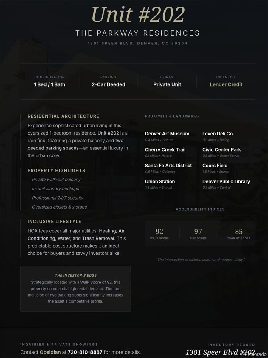 Discover a sophisticated urban retreat at 1301 Speer Blvd #202. This industrial-modern residence is perfectly positioned in Denver’s vibrant Golden Triangle (80204), offering an unparalleled lifestyle just steps from the Denver Art Museum, the Santa Fe Arts District, and the scenic Cherry Creek Bike Path. Designed for those who appreciate both character and connectivity, this loft defines living "beyond square footage." The interior features soaring ceilings and expansive windows that flood the open-concept floor plan with natural light, creating an airy, gallery-like atmosphere. The industrial aesthetic is balanced by high-end finishes, offering a seamless blend of raw architectural elements and modern comfort. The location is a commuter’s dream and an outdoor enthusiast’s sanctuary. Residents enjoy immediate access to the Central Business District for work and the vast Denver trail system for play. Whether you’re hosting in the chef-inspired kitchen or exploring the world-class galleries and coffee shops of the Creative District, this home provides a rare level of "market certainty" in one of Denver's most culturally rich neighborhoods. Experience a home that transcends the typical price tag and focuses on the curated Colorado lifestyle. 1301 Speer Blvd #202 is more than just a condo; it is an invitation to live at the intersection of art, history, and modern urban convenience. Presented by Obsidian real estate advisors.
