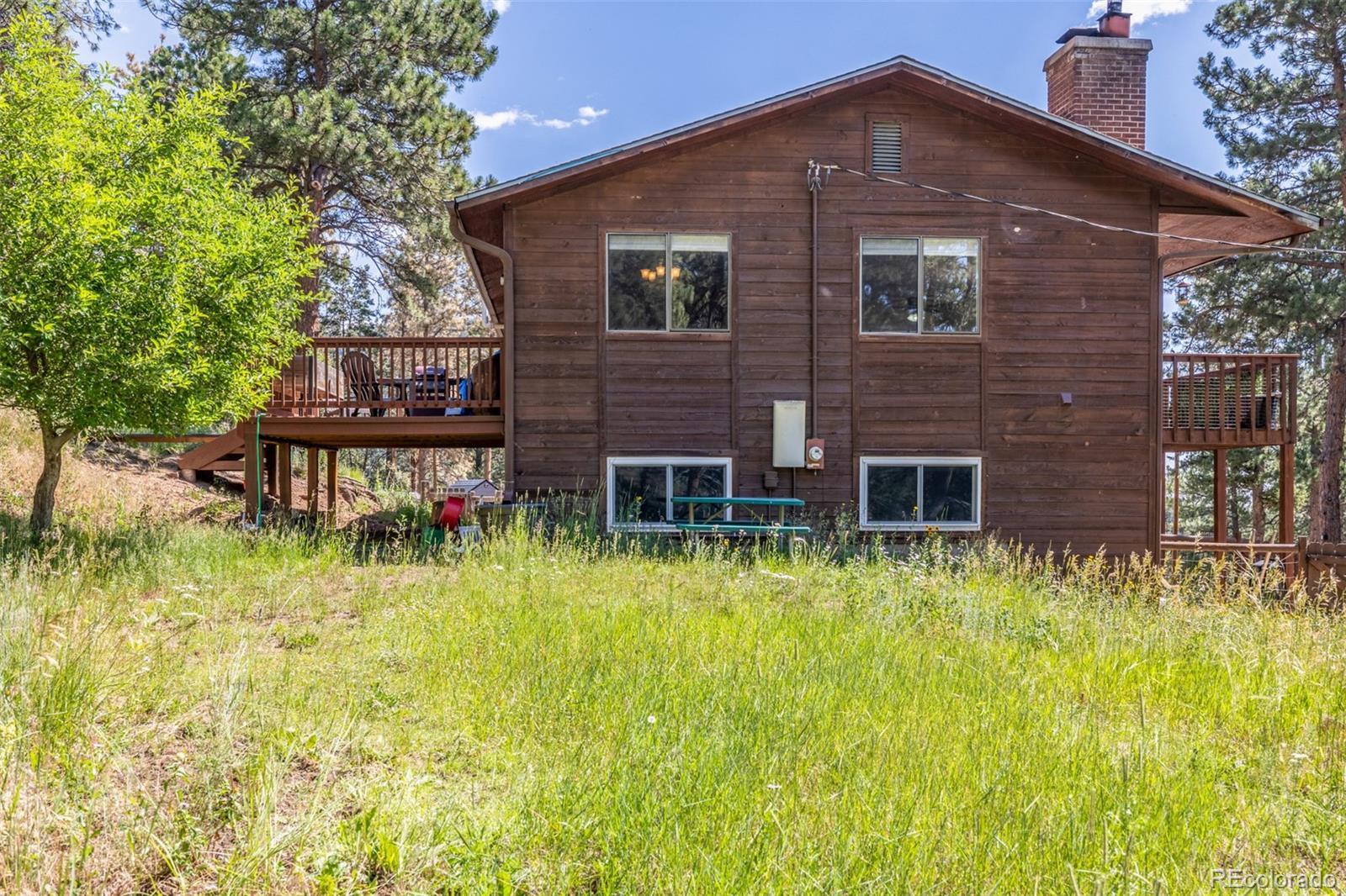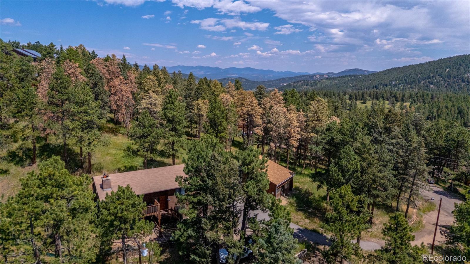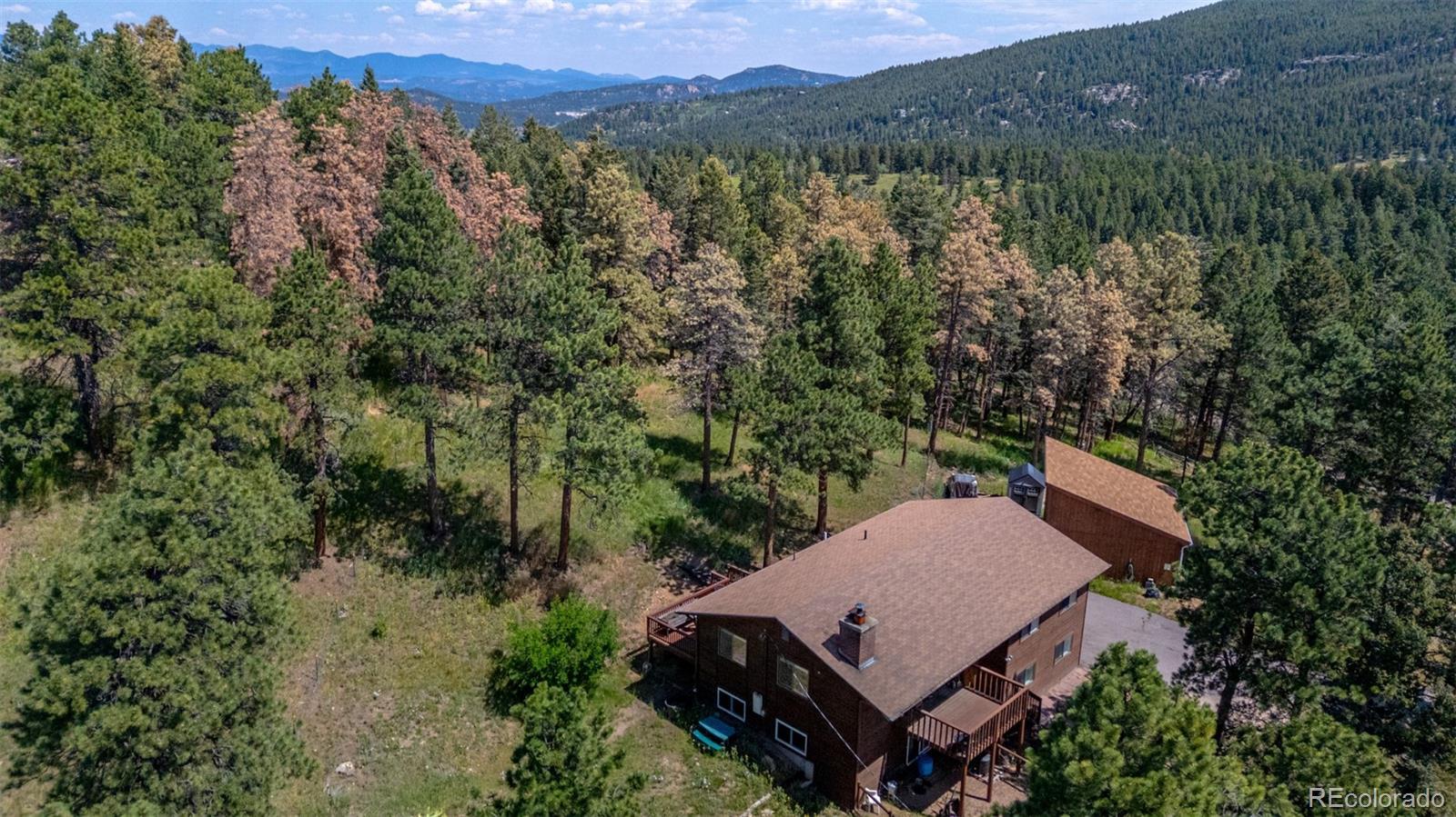 Horse READY! 1-acre lot with breathtaking mountain views! You’ll be drawn in by the charm and peaceful energy of this one-of-a-kind home. Inside, warm wood floors welcome you into a cozy living room featuring a fireplace, perfect for chilly evenings. Need more space to gather? Check out the family room, where a second fireplace adds to the inviting ambiance. Whip up delicious meals in the beautifully appointed kitchen, boasting built-in appliances, granite counters, wood cabinetry, a stone backsplash, and classic tile flooring. The dining area is ideal for hosting special occasions or casual everyday meals. At the end of the day, unwind in the main bedroom offering its own closet and a spa-inspired private bathroom complete with a soaking tub and tile finishes on the floor, counters, and walls. Looking for even more versatility? The lower level features a bonus room that could easily serve as an additional bedroom, media center, game room or whatever suits your lifestyle! Outside, sip your favorite beverage on the deck as you soak in serene mountain views. Bring your horses, toys, or hobbies as the property includes a large barn with a loft area, plus a 2-car garage for all your storage needs. Whether you're seeking room to roam, space to entertain, or a quiet place to make your own home, this gem has it all. Fencing already done, all you need to do is bring your horses and move in!A peaceful combination of mountain living in the Foothills with easy access to all amenities, schools, shopping, trails, open spaces & min to 285. Don’t miss this rare opportunity to own a slice of country living with all the modern comforts. Your dream lifestyle awaits!