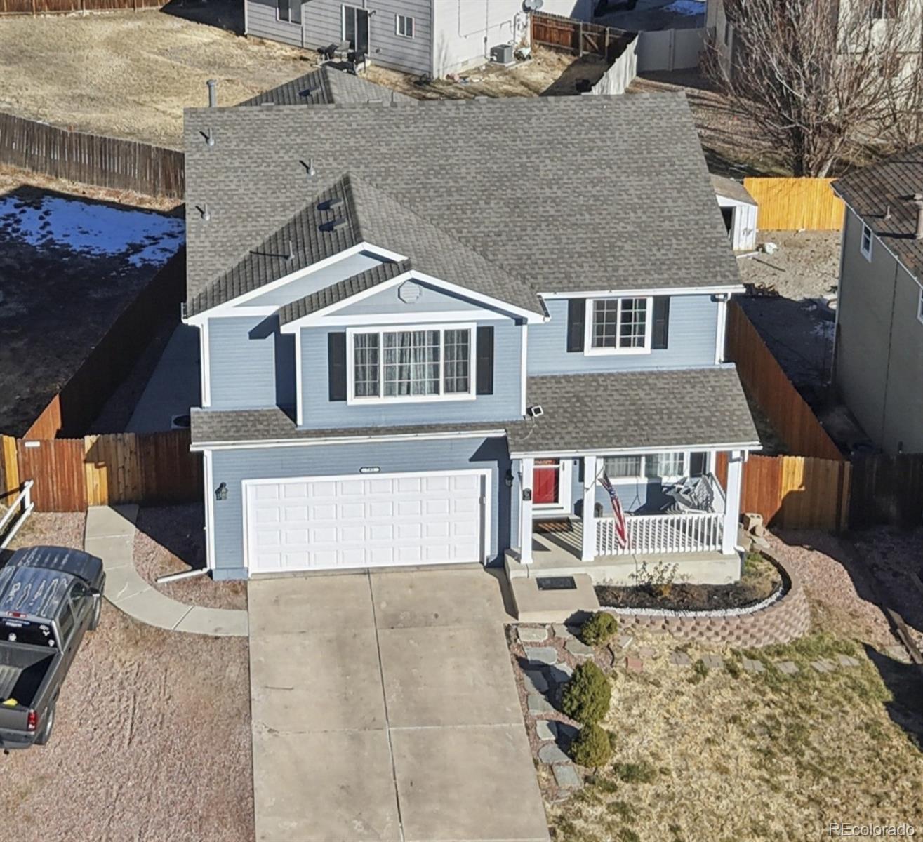 Welcome to your new home! This spacious 5-bedroom, 3-bath property in the desirable Heritage area of Fountain, a home that blends comfort, convenience, and thoughtful updates throughout. Luxury vinyl flooring spans the main level, complemented by newer carpet upstairs and fresh interior paint. A charming south-facing covered front porch welcomes you in and offers the perfect spot to enjoy beautiful Colorado days. Inside, the inviting family room features central air and a cozy gas fireplace, creating a warm gathering space. The kitchen offers an island workstation, abundant cabinetry, and seamless flow into the dining and family room—ideal for everyday living and entertaining. Step outside to a large backyard with a generous concrete patio ready for grilling, play, and gatherings. Upstairs, all bedrooms are very spacious with custom closet inserts and are conveniently located together, including a spacious primary suite with walk in closet and private access 5-piece bath. The loft was enclosed at build to create a true 5th bedroom, offering flexibility for guests, office space, or hobbies. This home is packed with valuable extras: a whole-home water filtration system, an advanced ozone and static-electro HVAC system designed to help relieve asthma and allergies, updated light switches, and many replaced windows. Impeccable attention to maintenance reflects true pride of ownership. Super close- 50 yards and across the street-- to Heritage neighborhood park (photographed), shopping, and an easy commute to military bases Ft. Carson and Peterson, this home delivers exceptional value in a fantastic location for friends and family to gather and enjoy everyday life.