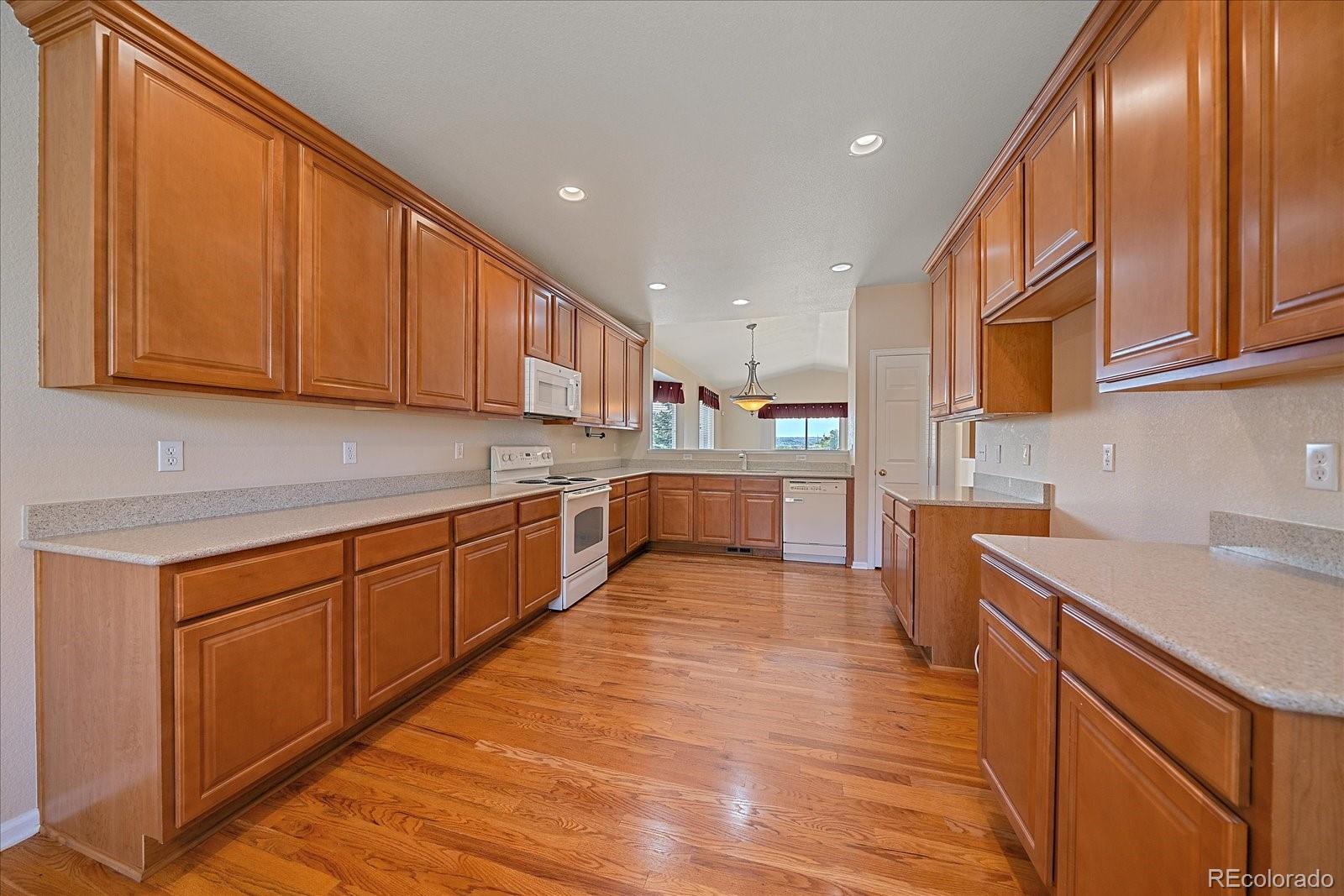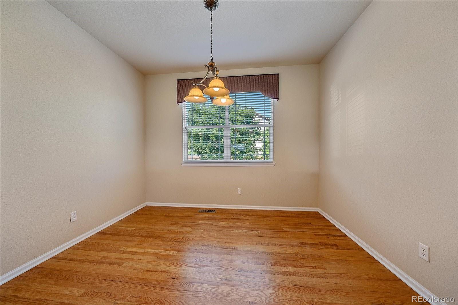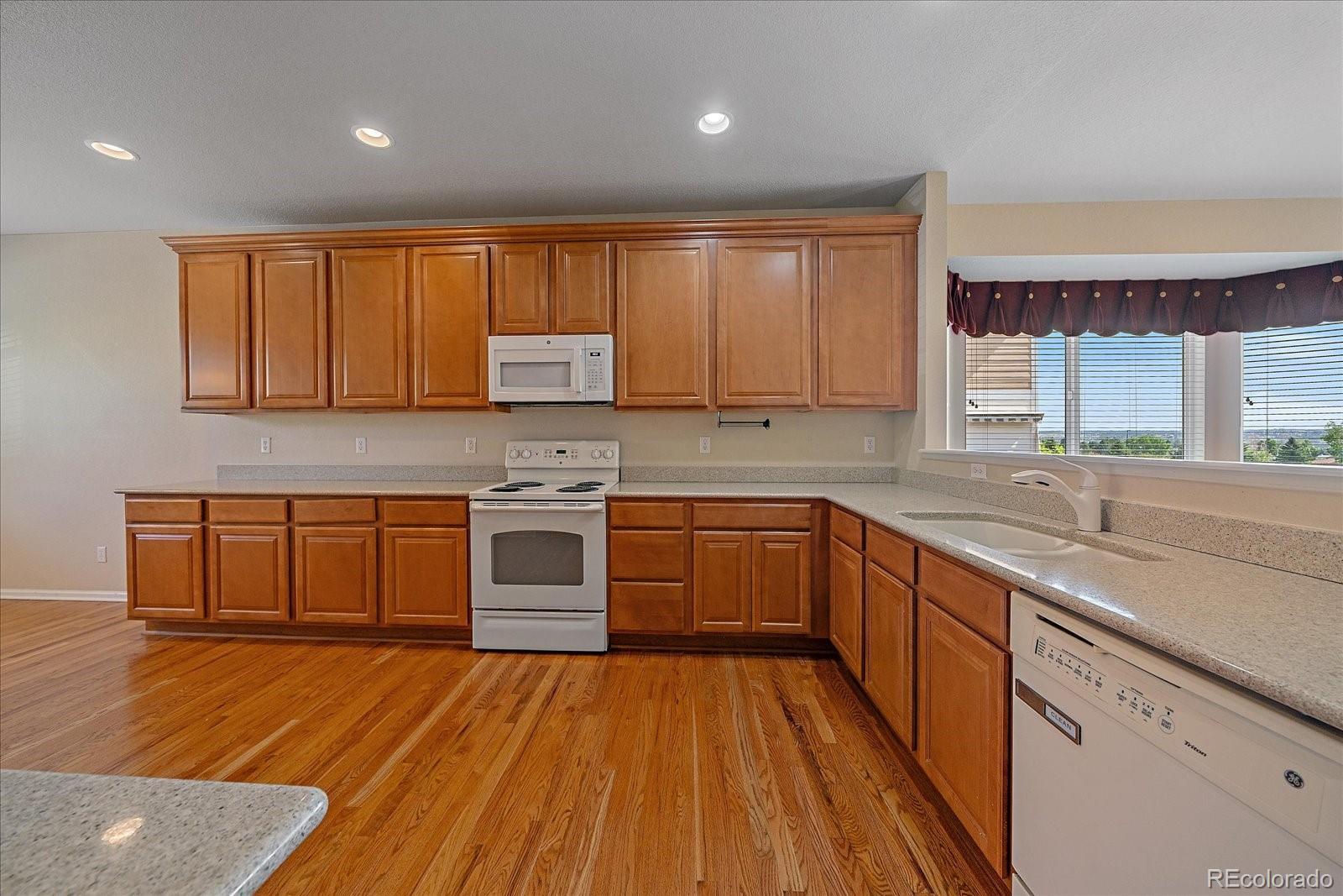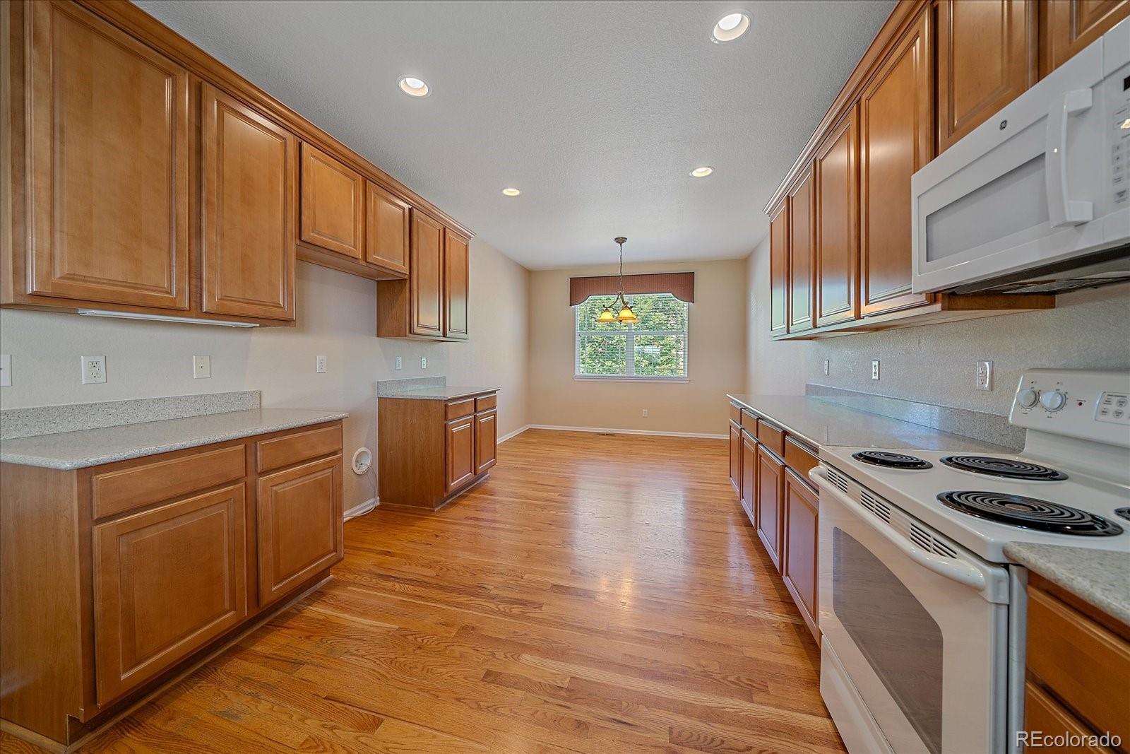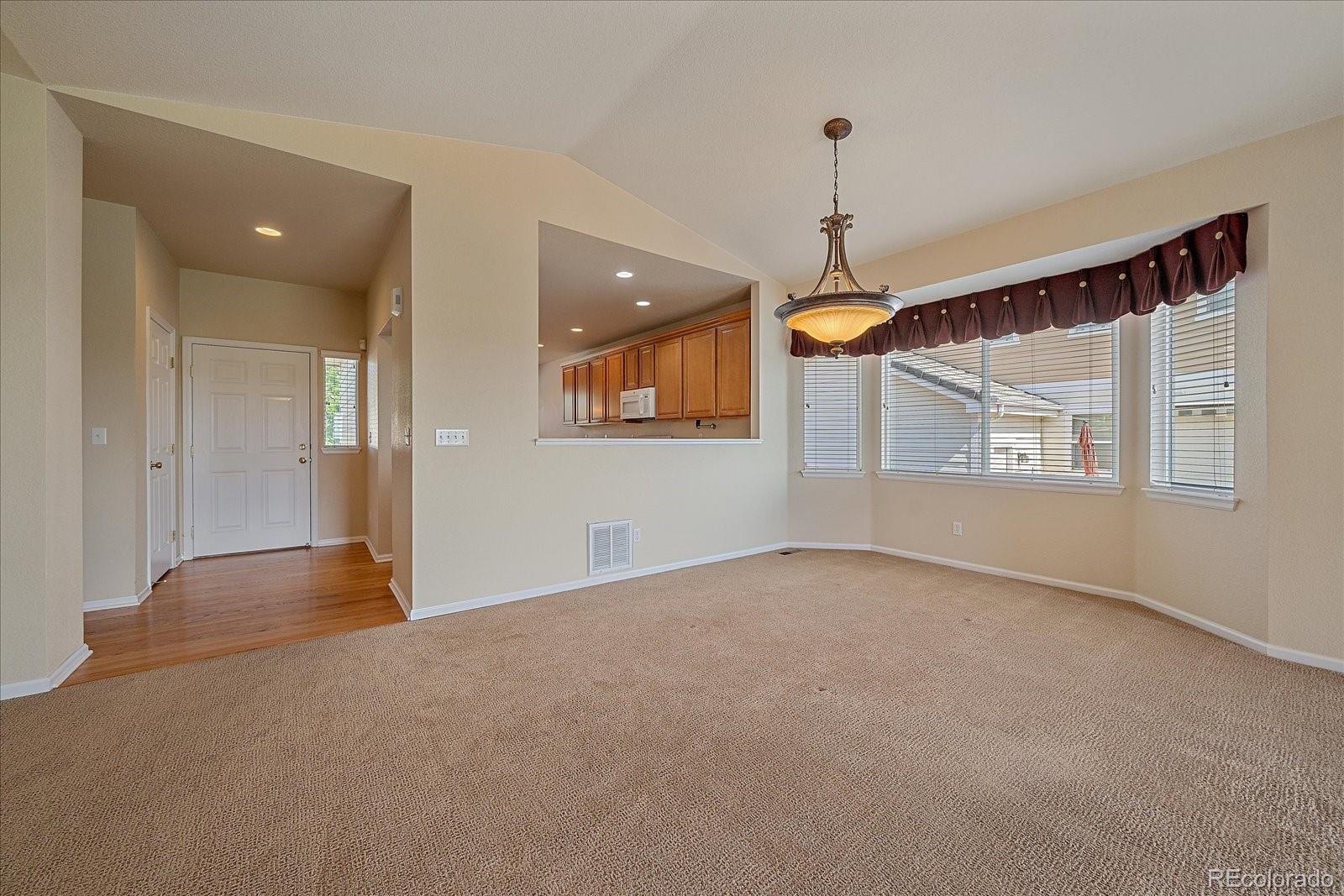 You won't want to miss this awesome ranch at the latest new price on open space in great neighborhood. It features an open floor plan with great room/dining room/kitchen all flowing together. You will love the vaulted ceilings and bright light throughout. The large great room showcases a gas fireplace and has ample room for all your furnishings. Step right outside onto the covered patio perfect for relaxing on or for cookouts and overlooks the peaceful open space. The kitchen featuring rich wood 42" cabinets with abundant space for all your things, wonderful counter space for meal prep, and wood floor. The eating nook is framed by a window letting in plenty of sunlight. The dining room is the ideal setting for casual get togethers or elegant dining parties. The spacious primary bedroom has a vaulted ceiling and adjoins a 5 piece bath with garden tub, large walk in closet, and heated tile floor. There is instant hot water in both the primary bath and secondary one. The colors are neutral throughout this home. The secondary bedrooms are both a good size with a convenient full bath in the hall. The yard is the perfect size and the cement tile roof is designed to stand strong against the elements and hail. The full unfinished basement is waiting for your design to finish how you like. This home is in the highly demanded Douglas County schools and is close to dining and shopping. The original owners have had such pride of ownership and this home is in perfect condition. Incredible new price reduction - priced to sell, come take a look.