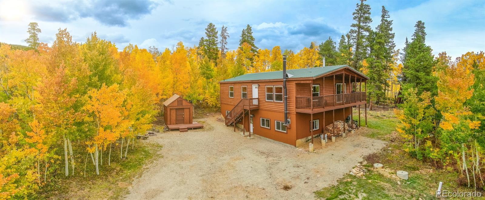 Spacious cabin in a gated community with a small town neighborhood feel. Situated on a lovely lot covered in Pine and Aspen, this three bedroom, three bath cabin has plenty of space to live and play. An open great room on the main level includes a dining space and large, well designed kitchen with plenty of counter space and storage, and a kitchen island with extra seating. This is an ideal space for family time or entertaining friends. A primary suite with a full bath, two additional bedrooms, a second full bath, and a convenient laundry room complete the space. A covered deck off the great room affords stunning views of mountain peaks and national forest The lower level opens up from the outside to a mudroom which leads to a huge family space with a wood stove. The lower level also has a bunk room and 3/4 bath. This space would be perfect as a game room, family room, or even a short term rental. The rolling property is stunning, and an oversized shed will easily store all your toys and extras. The lot backs directly up to national forest for hiking, biking, bird watching, and viewing all the native wildlife. There are several other forest access points throughout the community. An easy commute to Fairplay, Buena Vista, or Breckenridge, and close to excellent schools, this is a great full time residence. Community amenities include a central water system, a Clubhouse, tennis/recreation courts, 7 ponds, road snow plowing, a trash compactor, and numerous community activities throughout the year. Whether you are looking for a full time home, a vacation getaway, or an investment prospect, this is a perfect cabin.
