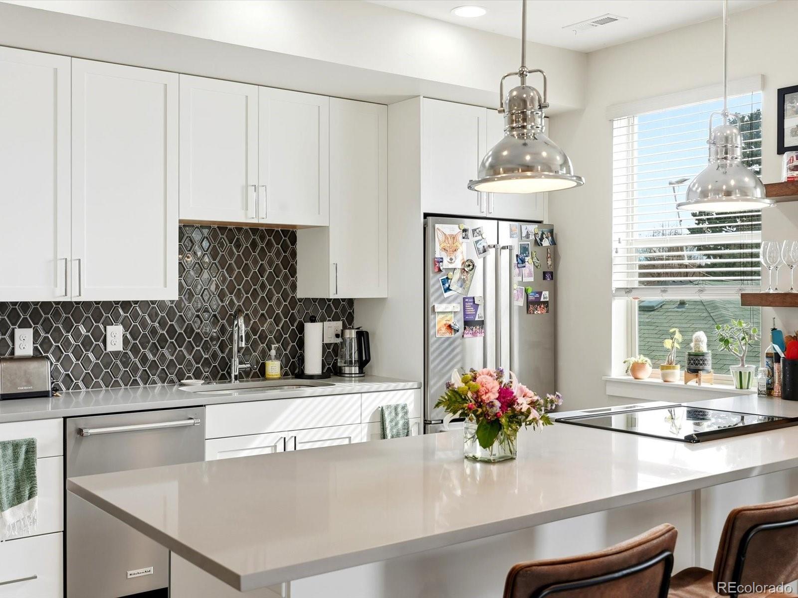 Step into modern living with this exceptional end-unit townhome at 2190 S Birch, an entertainer’s dream in the heart of University Hills. Boasting nearly 1,300 square feet, it features one of the largest floorplans in the community, complete with a private-use additional parking spot and an oversized one-car garage. The custom-designed open-concept main floor is a showcase of contemporary style, with sleek stainless steel appliances anchoring the chef’s kitchen and a seamless flow between living and dining spaces perfect for hosting or relaxing. Upstairs, the third-floor bedroom level offers a luxurious retreat, including an oversized primary suite with a spa-like en suite featuring a walk-in shower, double vanity, and spacious walk-in closet, alongside a second bedroom with its own en suite full bath for ultimate comfort and privacy. The crown jewel is the expansive fourth-floor rooftop deck, offering breathtaking west-facing mountain views and ample space to entertain or unwind under Colorado’s stunning skies. This 2-bedroom, 2.5-bath home also includes plumbing for an additional half bath on the entry level, adding to its flexibility. The property has NO HOA! Situated just moments from University Hills’ shops, dining, and amenities, this stylish, move-in-ready home blends privacy, convenience, and unmatched charm. Don’t miss the chance to make it yours—schedule your showing today!