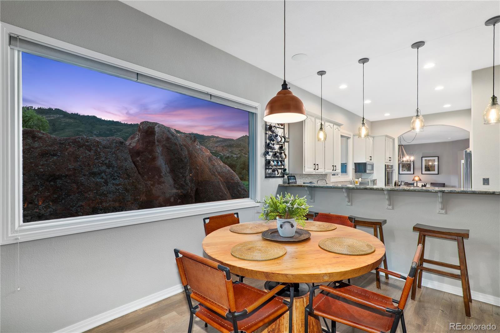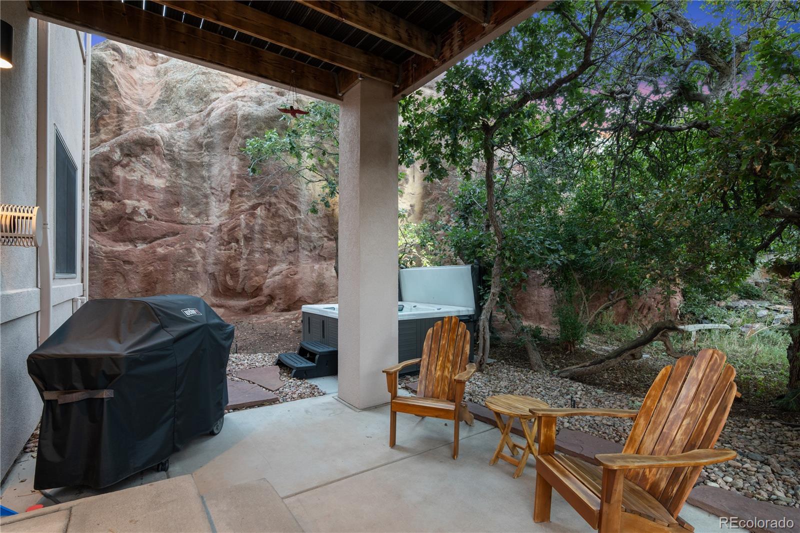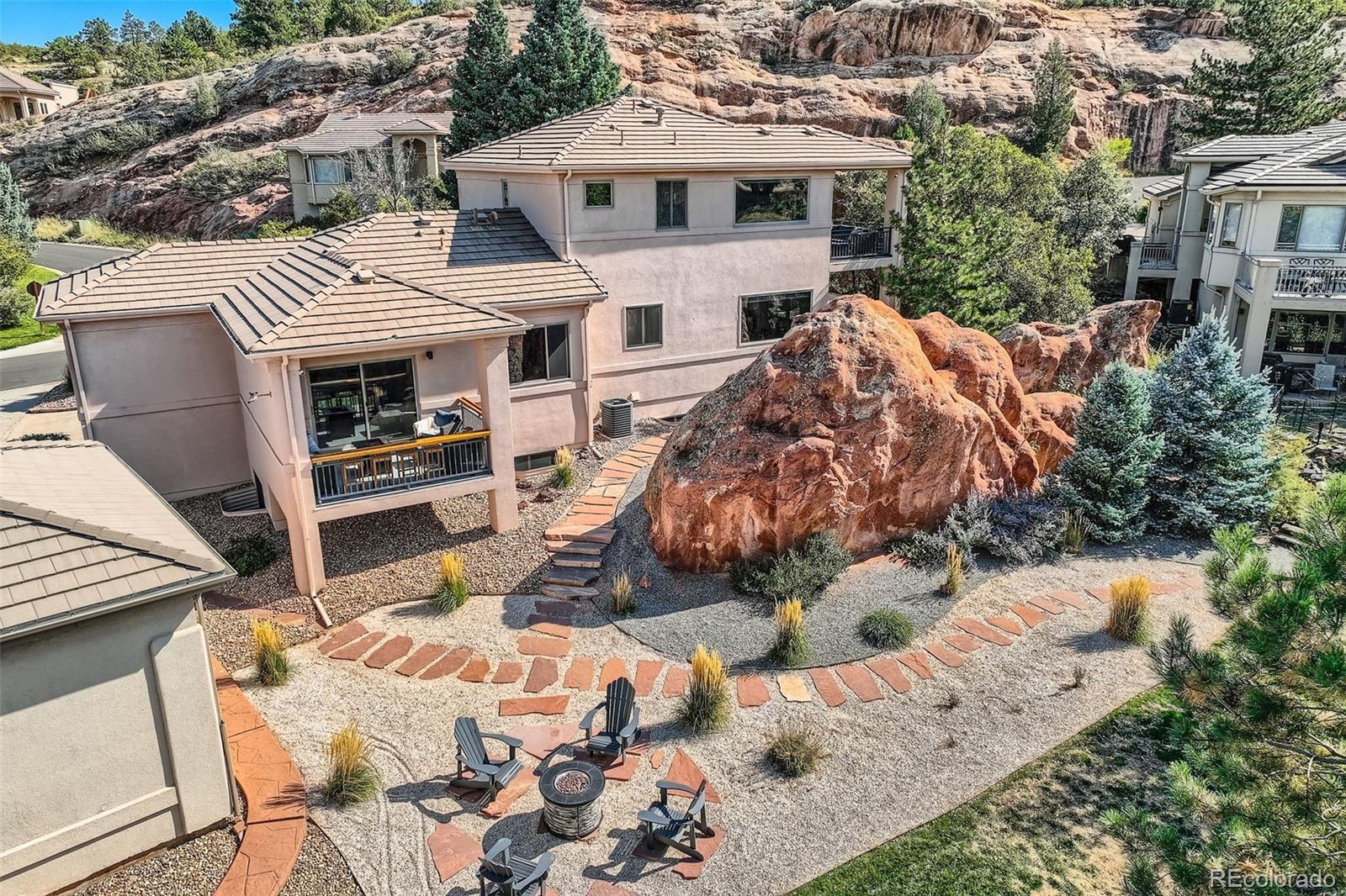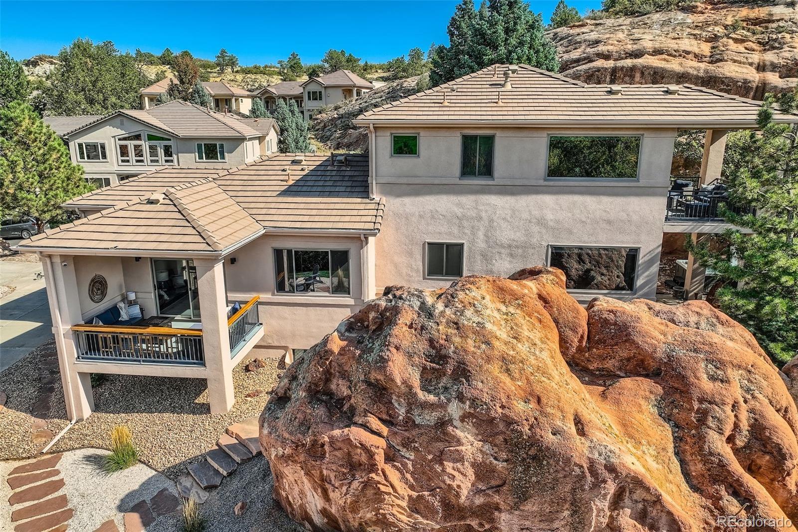 At the base of the Rocky Mountains, we proudly present 6645 Bright Water Trail in beautiful Roxborough Park—where abundant wildlife, unprecedented mountain views, and the world-class Arrowhead Golf Course define the Colorado lifestyle most buyers are seeking. Surrounded by dramatic red rock formations and sweeping mountain vistas, this exceptional residence is perfectly positioned on the 8th hole of one of the most scenic golf venues anywhere—Arrowhead. Breathtaking views extend from nearly every window, including your own backyard, where a magnificent natural rock formation creates a truly unforgettable backdrop. Beautifully designed and freshly professionally renovated, the home features 3 bedrooms, 2.5 bathrooms, soaring 10-foot ceilings, and three fireplaces and so much more. The open-concept main level is ideal for entertaining and is accessed through a steel security door, leading to expansive living spaces filled with natural light. Enjoy two private balconies, along with a hot tub patio nestled among the rocks, offering exceptional privacy and serenity. The lower level includes two additional bedrooms, a beautifully updated bathroom, and a comfortable living area perfect for guests or flexible use. Sellers used the basement living space occasionally for Guests as well. Upstairs, the primary suite is a true retreat—perched at the top of the home with unmatched mountain and golf course views. Pictures do not capture the full essence of this remarkable property. Schedule your private showing today to experience it in person.