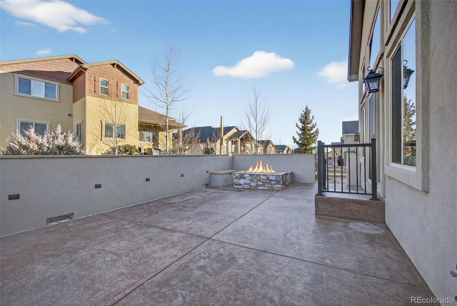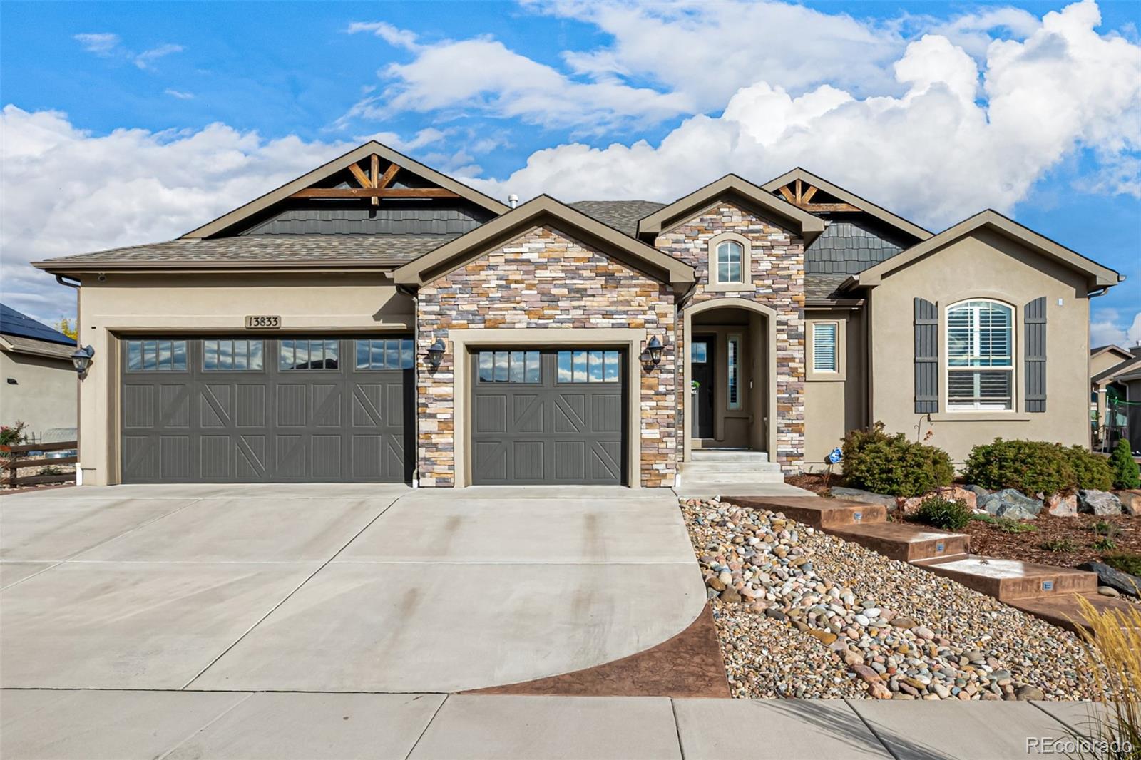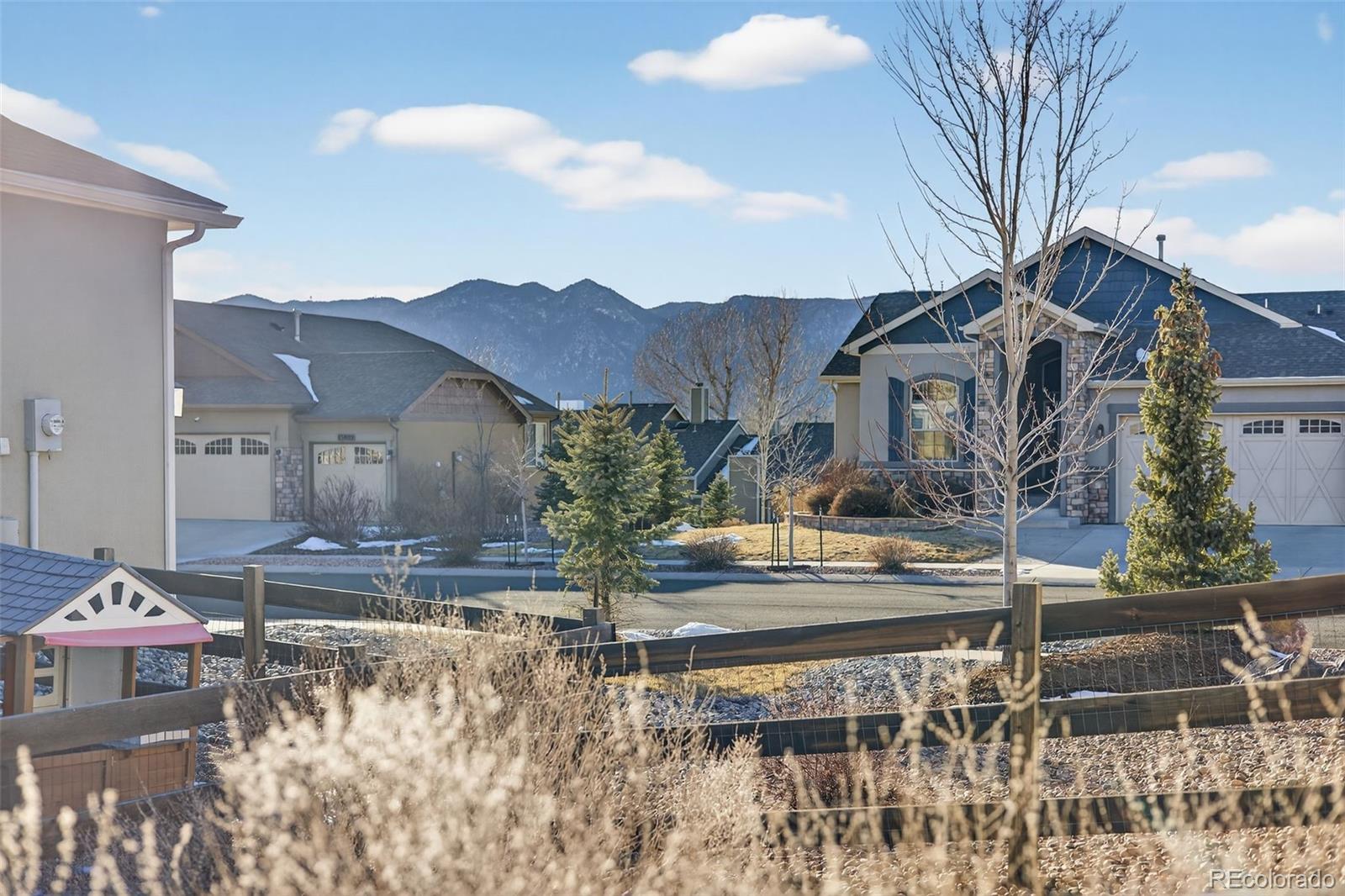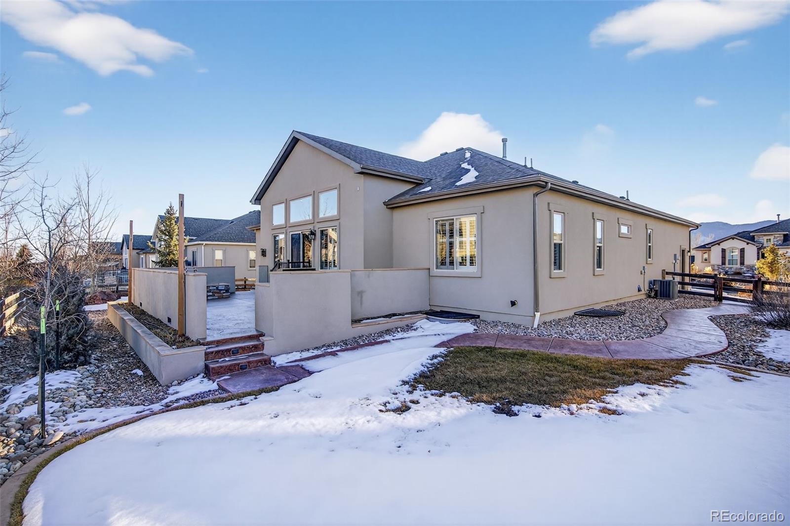 Welcome to this beautifully crafted ranch-style home in the highly sought-after Morningview at Gleneagle community. Offering partial mountain views and elegant design throughout, this home blends luxury, comfort, and functionality. Step inside to soaring 12-foot ceilings and an open-concept layout filled with natural light. The main level includes three bedrooms, a dedicated home office, and a formal dining room with barn doors that open to the backyard—ideal for indoor-outdoor entertaining. The gourmet kitchen features a large leathered granite island, soft-close cabinets, walk-in pantry, and premium stainless steel appliances, including double ovens, a gas range, and a French door refrigerator. The spacious living room centers around a gas fireplace with stone surround and wood mantel, creating a warm, inviting atmosphere. The primary suite is a true retreat, featuring a spa-inspired en-suite with dual vanities, a walk-in shower with dual heads, and a large walk-in closet. The finished basement offers 9-foot ceilings, a large rec room, wet bar, and two additional bedrooms with walk-in closets. One is a junior suite with a private full bath and double sinks—perfect for guests or multigenerational living. Additional highlights include a 3-car garage, laundry/mudroom with built-in cabinetry and utility sink, plantation shutters, an On-Q home audio system, whole-house humidifier, radon mitigation system, and a spacious storage room. Enjoy Colorado’s beautiful weather in the professionally landscaped, low-maintenance backyard featuring a stamped concrete patio, walled seating area, built-in gas BBQ, and custom gas fire pit. Located just minutes from I-25, shopping, dining, and top-rated District 20 schools, this home offers the ideal blend of luxury, convenience, and lifestyle.