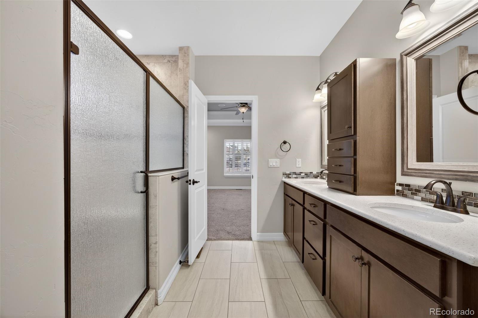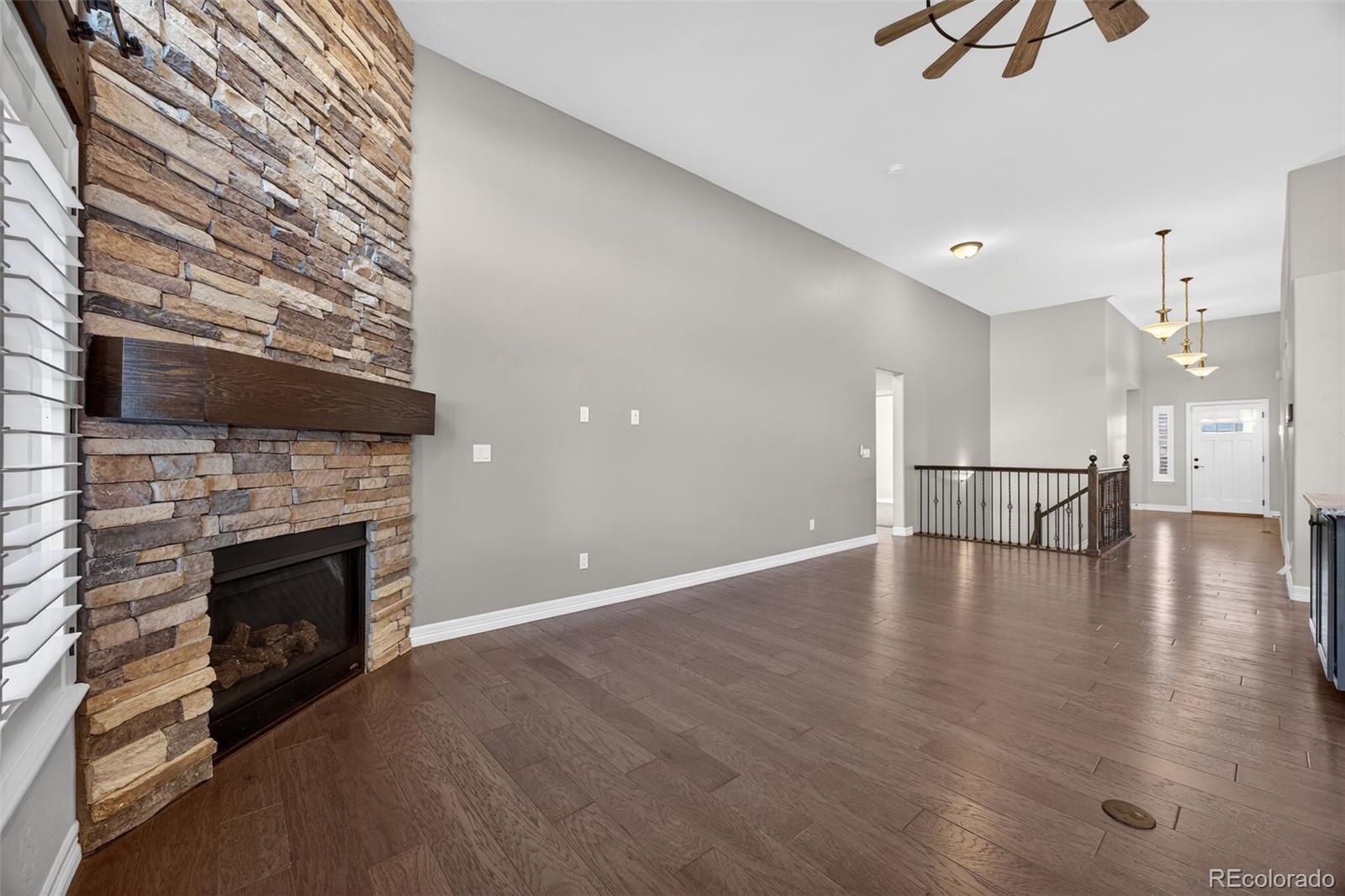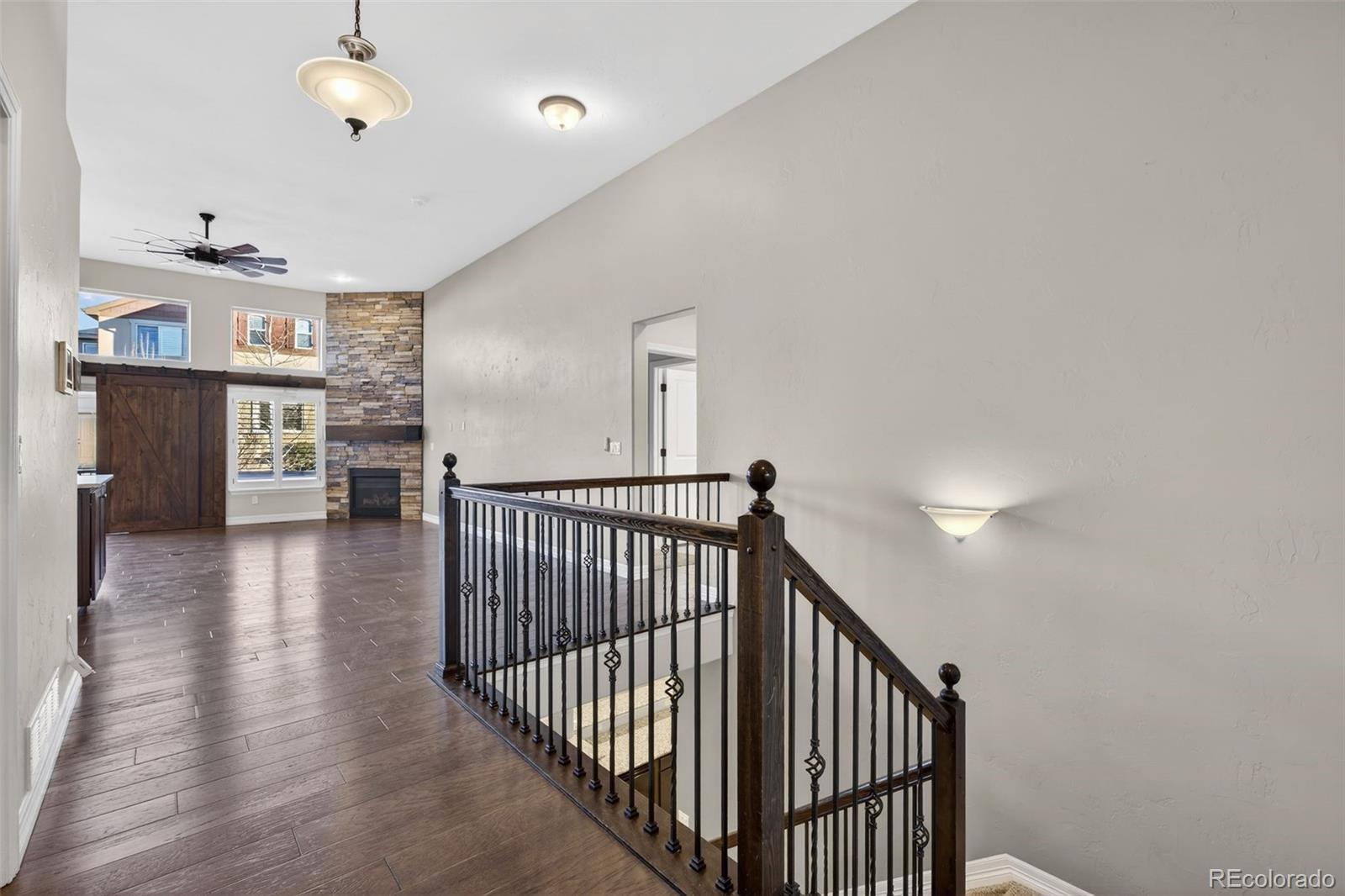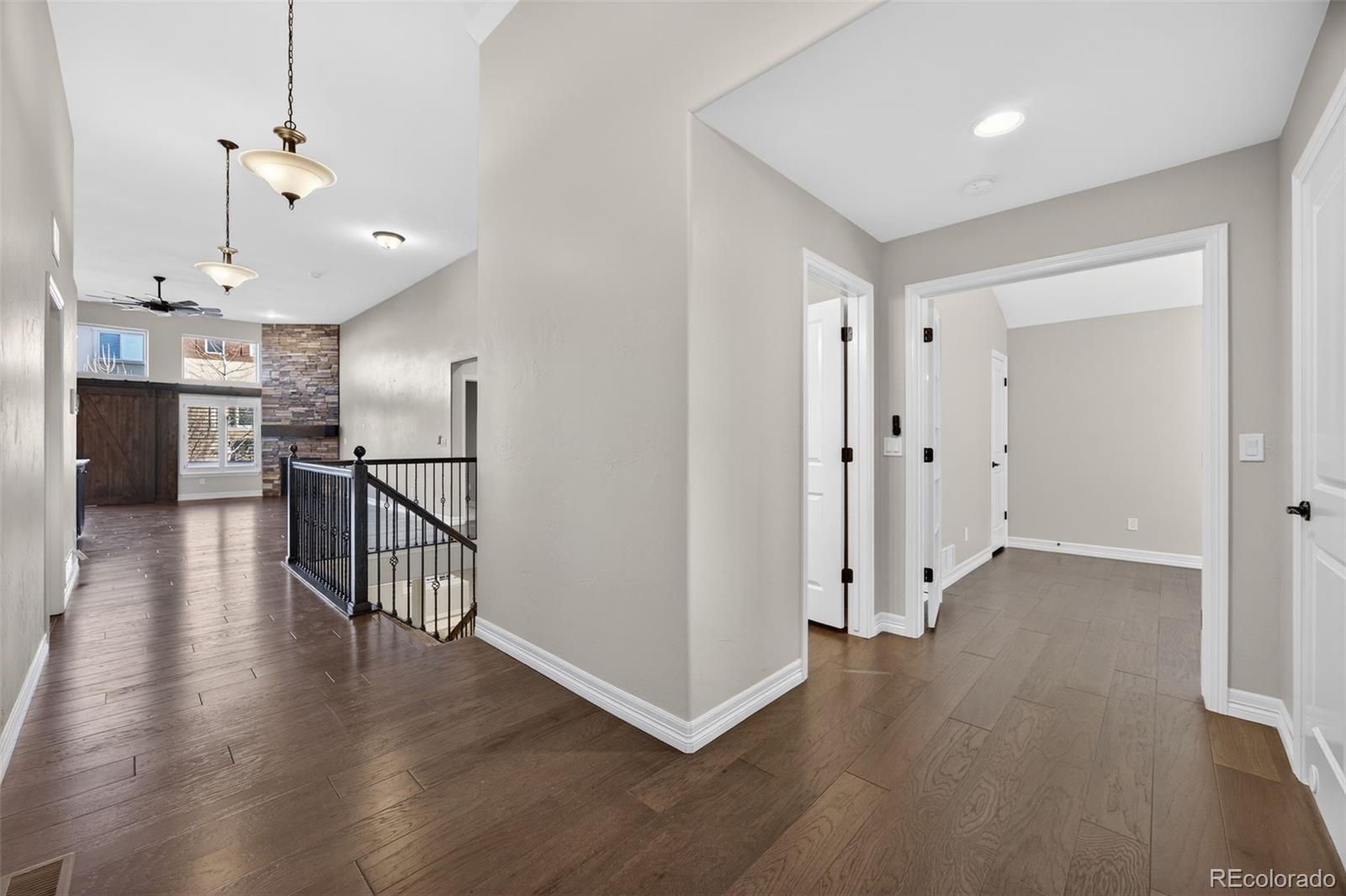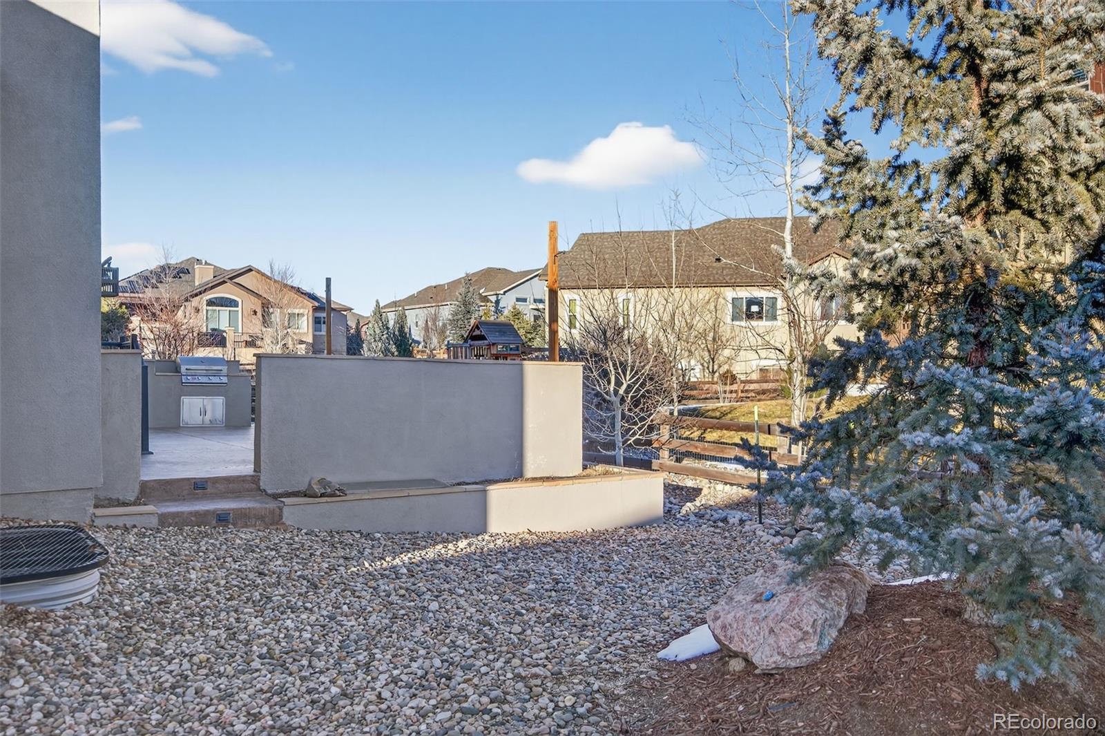 Welcome to this beautifully crafted ranch-style home in the highly sought-after Morningview at Gleneagle community. Offering partial mountain views and elegant design throughout, this home blends luxury, comfort, and functionality. Step inside to soaring 12-foot ceilings and an open-concept layout filled with natural light. The main level includes three bedrooms, a dedicated home office, and a formal dining room with barn doors that open to the backyard—ideal for indoor-outdoor entertaining. The gourmet kitchen features a large leathered granite island, soft-close cabinets, walk-in pantry, and premium stainless steel appliances, including double ovens, a gas range, and a French door refrigerator. The spacious living room centers around a gas fireplace with stone surround and wood mantel, creating a warm, inviting atmosphere. The primary suite is a true retreat, featuring a spa-inspired en-suite with dual vanities, a walk-in shower with dual heads, and a large walk-in closet. The finished basement offers 9-foot ceilings, a large rec room, wet bar, and two additional bedrooms with walk-in closets. One is a junior suite with a private full bath and double sinks—perfect for guests or multigenerational living. Additional highlights include a 3-car garage, laundry/mudroom with built-in cabinetry and utility sink, plantation shutters, an On-Q home audio system, whole-house humidifier, radon mitigation system, and a spacious storage room. Enjoy Colorado’s beautiful weather in the professionally landscaped, low-maintenance backyard featuring a stamped concrete patio, walled seating area, built-in gas BBQ, and custom gas fire pit. Located just minutes from I-25, shopping, dining, and top-rated District 20 schools, this home offers the ideal blend of luxury, convenience, and lifestyle.