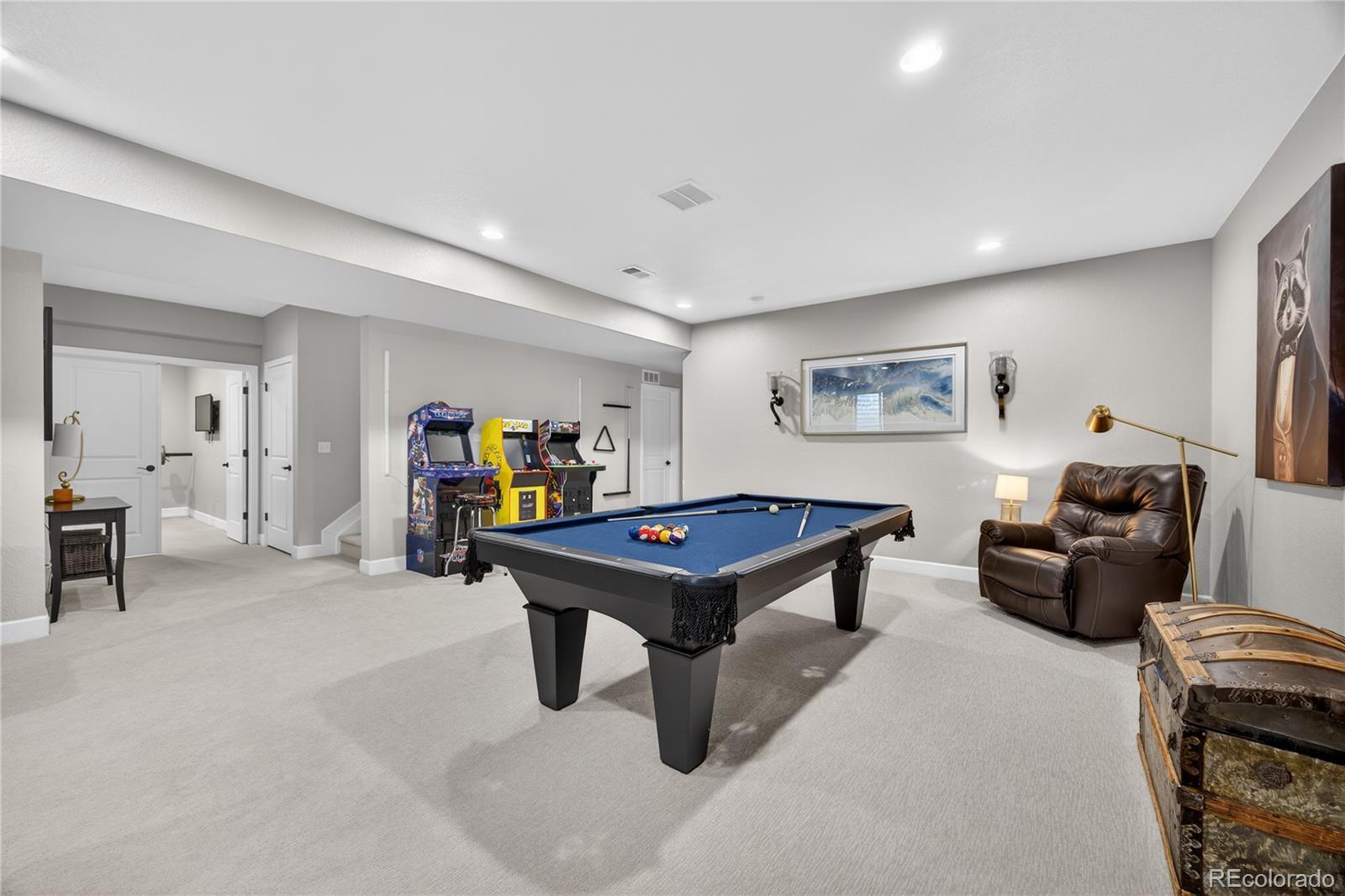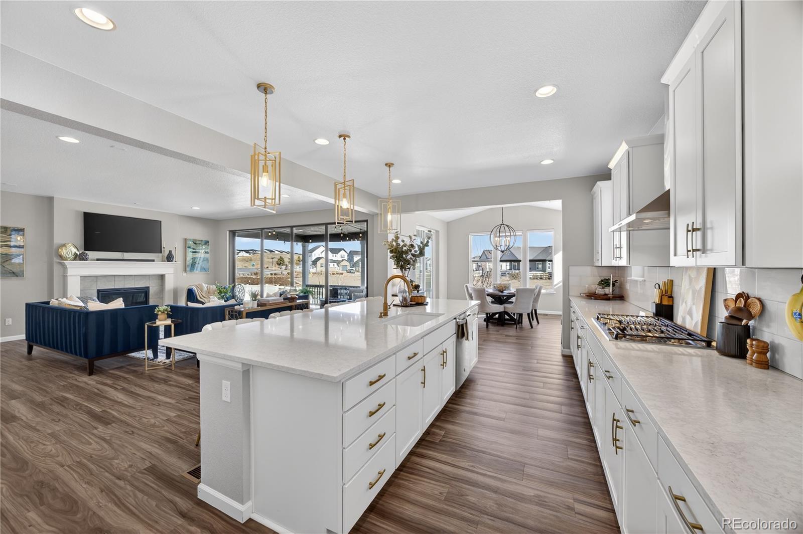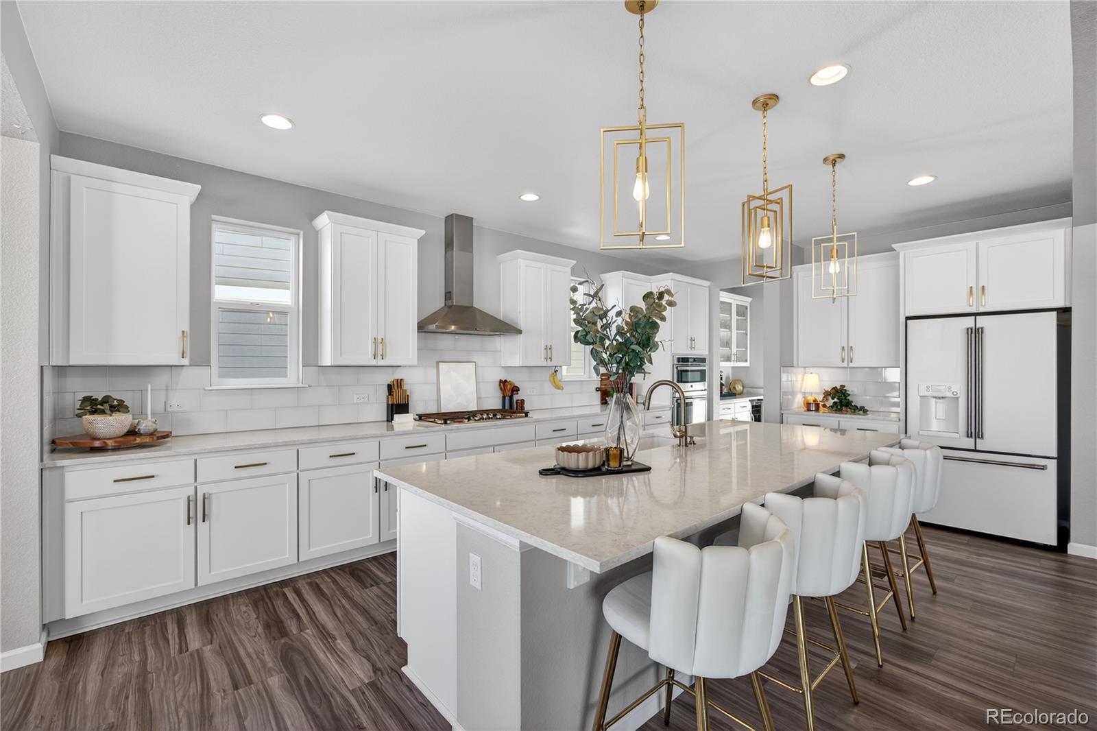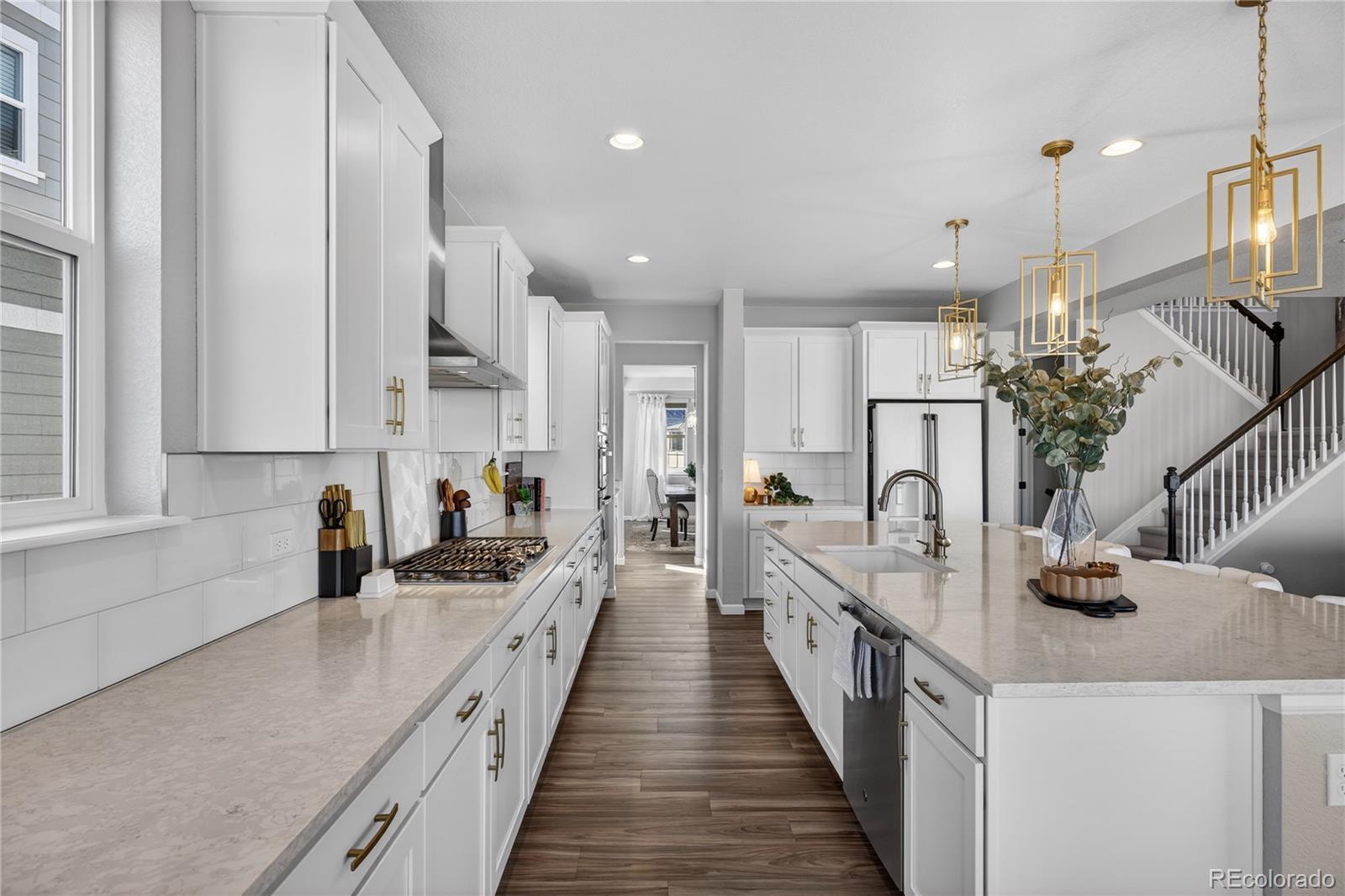 Discover a stunning 5-bedroom, 4.5-bath Dillon II model luxury home in Parker, Colorado’s prestigious Stone Creek Ranch. This move-in ready home backs to a peaceful greenbelt, offering privacy, open views, and access to nearby trails—perfect for homeowners seeking modern Colorado living. From the moment you enter, a vaulted-ceiling entryway filled with natural light sets the tone for refined design throughout. The bright white gourmet kitchen features a massive quartz center island, modern gold hardware, high-end finishes, abundant cabinetry, breakfast nook/second dining area, butler’s pass-through, and large dedicated pantry. The kitchen flows seamlessly into the open family room with a cozy gas fireplace and a wall-to-wall sliding glass door opens to the covered patio, creating true indoor-outdoor living and serene greenbelt views. The main level also includes a private office with elegant French doors. Upstairs, a large loft-style bonus room serves as a second family/living room or play area, while the primary suite offers a spacious walk-in closet and spa-inspired bath with dual quartz top vanity, and gorgeous, upgraded tile in the walk-in shower. Three additional bedrooms provide flexible accommodations for guests, family, or multi-generational living. The finished basement adds a dedicated gym, expansive recreation room, guest bedroom, and full bath—perfect for entertaining or extended stays. Built in 2021, this Dillon model by Richmond American Homes features numerous builder upgrades and lives like new construction. Residents enjoy premium community amenities including a pool, clubhouse, fitness center, playground, and trails, all within one of Parker’s most desirable neighborhoods.