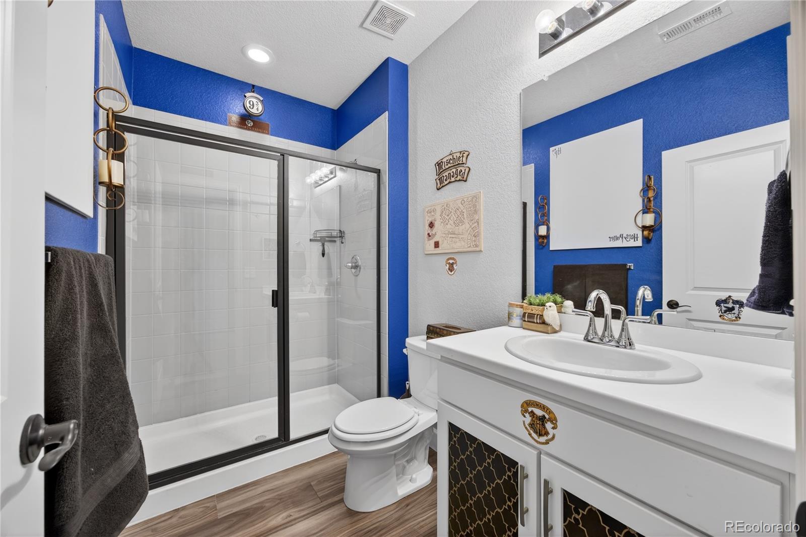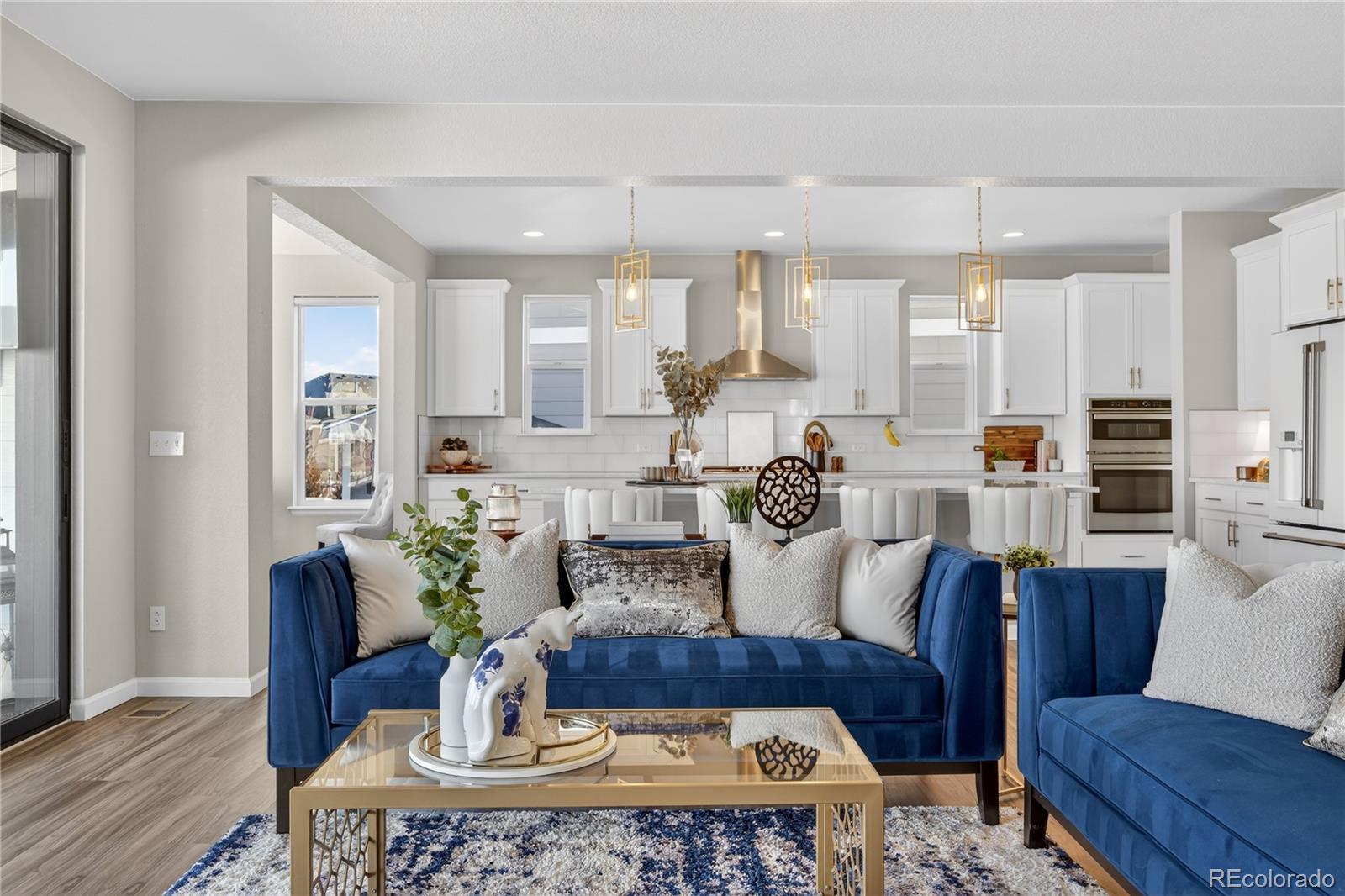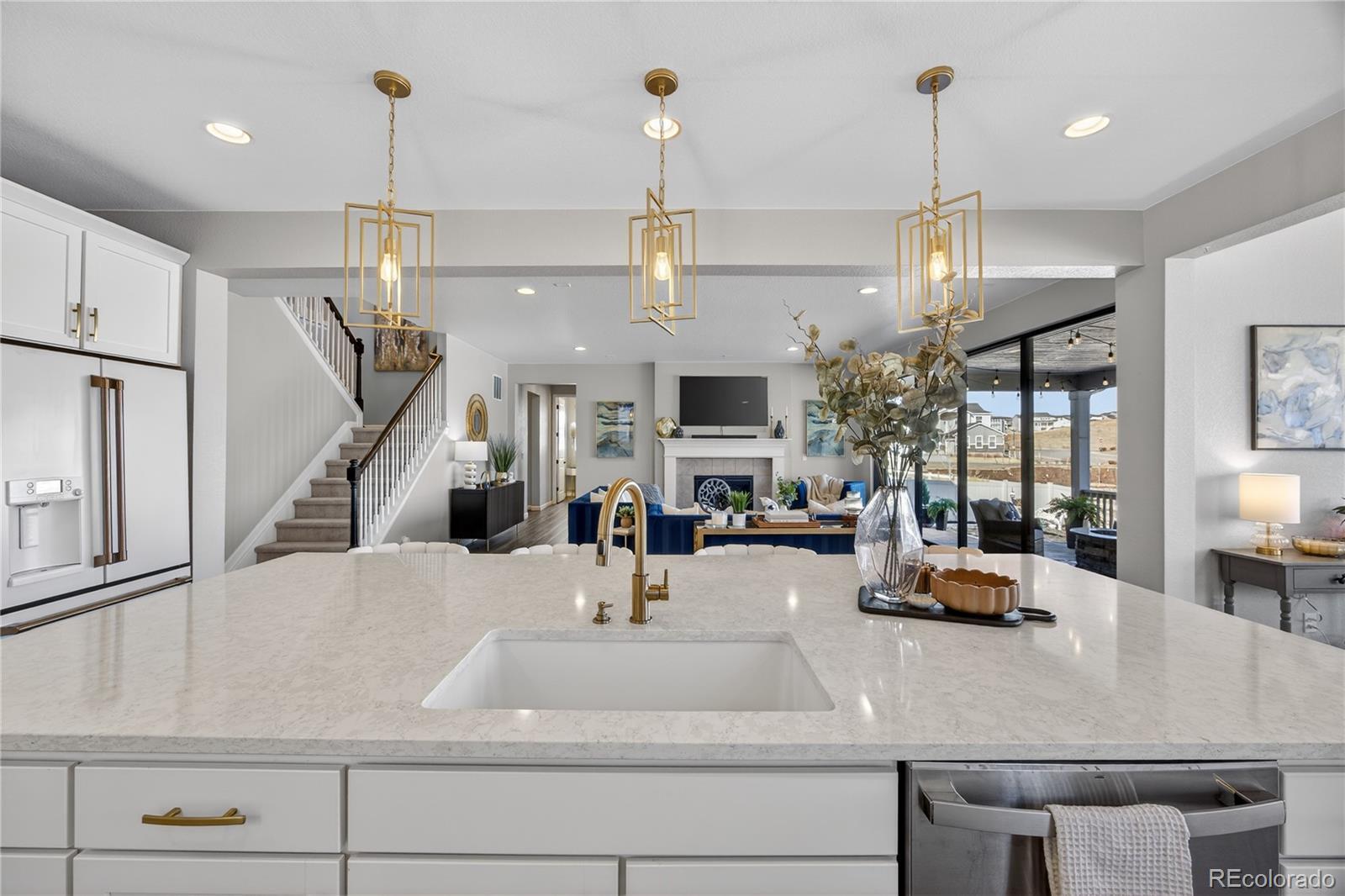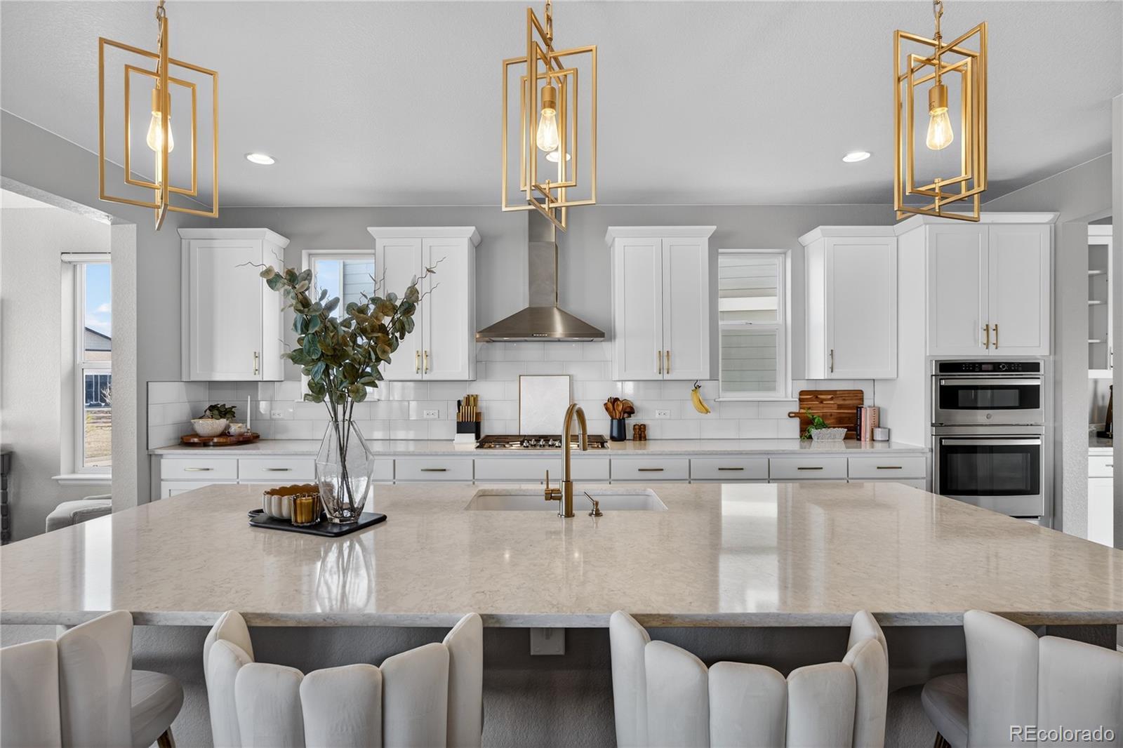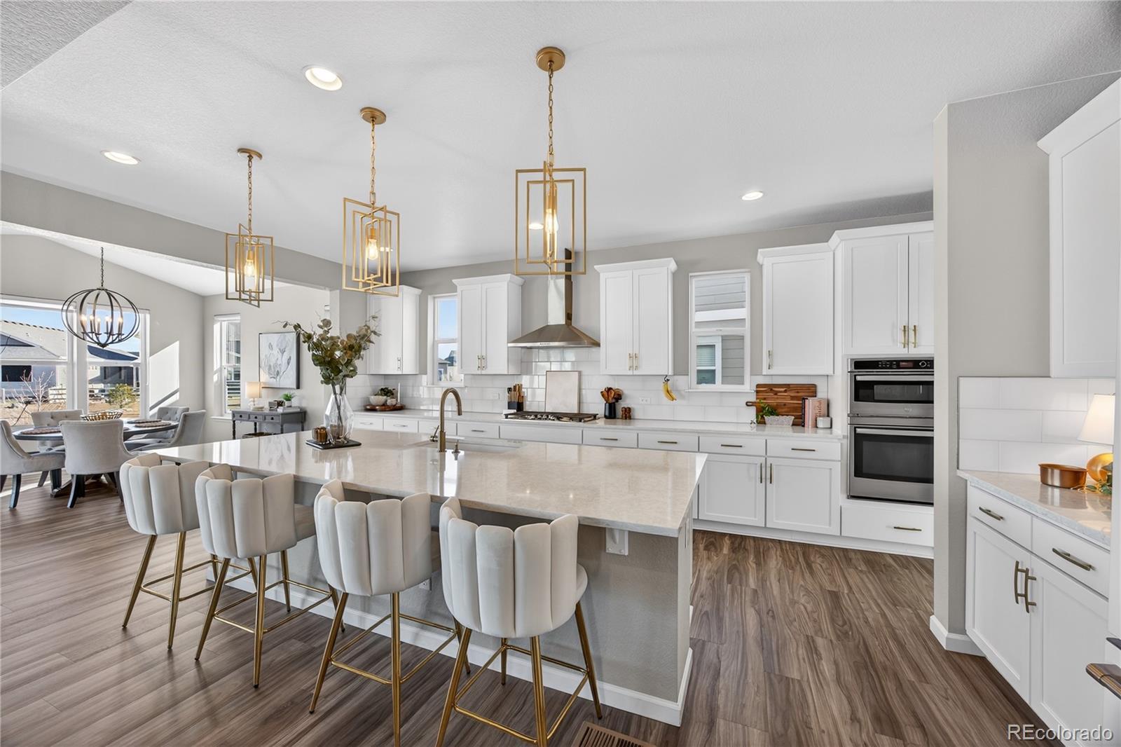 Discover a stunning 5-bedroom, 4.5-bath Dillon II model luxury home in Parker, Colorado’s prestigious Stone Creek Ranch. This move-in ready home backs to a peaceful greenbelt, offering privacy, open views, and access to nearby trails—perfect for homeowners seeking modern Colorado living. From the moment you enter, a vaulted-ceiling entryway filled with natural light sets the tone for refined design throughout. The bright white gourmet kitchen features a massive quartz center island, modern gold hardware, high-end finishes, abundant cabinetry, breakfast nook/second dining area, butler’s pass-through, and large dedicated pantry. The kitchen flows seamlessly into the open family room with a cozy gas fireplace and a wall-to-wall sliding glass door opens to the covered patio, creating true indoor-outdoor living and serene greenbelt views. The main level also includes a private office with elegant French doors. Upstairs, a large loft-style bonus room serves as a second family/living room or play area, while the primary suite offers a spacious walk-in closet and spa-inspired bath with dual quartz top vanity, and gorgeous, upgraded tile in the walk-in shower. Three additional bedrooms provide flexible accommodations for guests, family, or multi-generational living. The finished basement adds a dedicated gym, expansive recreation room, guest bedroom, and full bath—perfect for entertaining or extended stays. Built in 2021, this Dillon model by Richmond American Homes features numerous builder upgrades and lives like new construction. Residents enjoy premium community amenities including a pool, clubhouse, fitness center, playground, and trails, all within one of Parker’s most desirable neighborhoods.