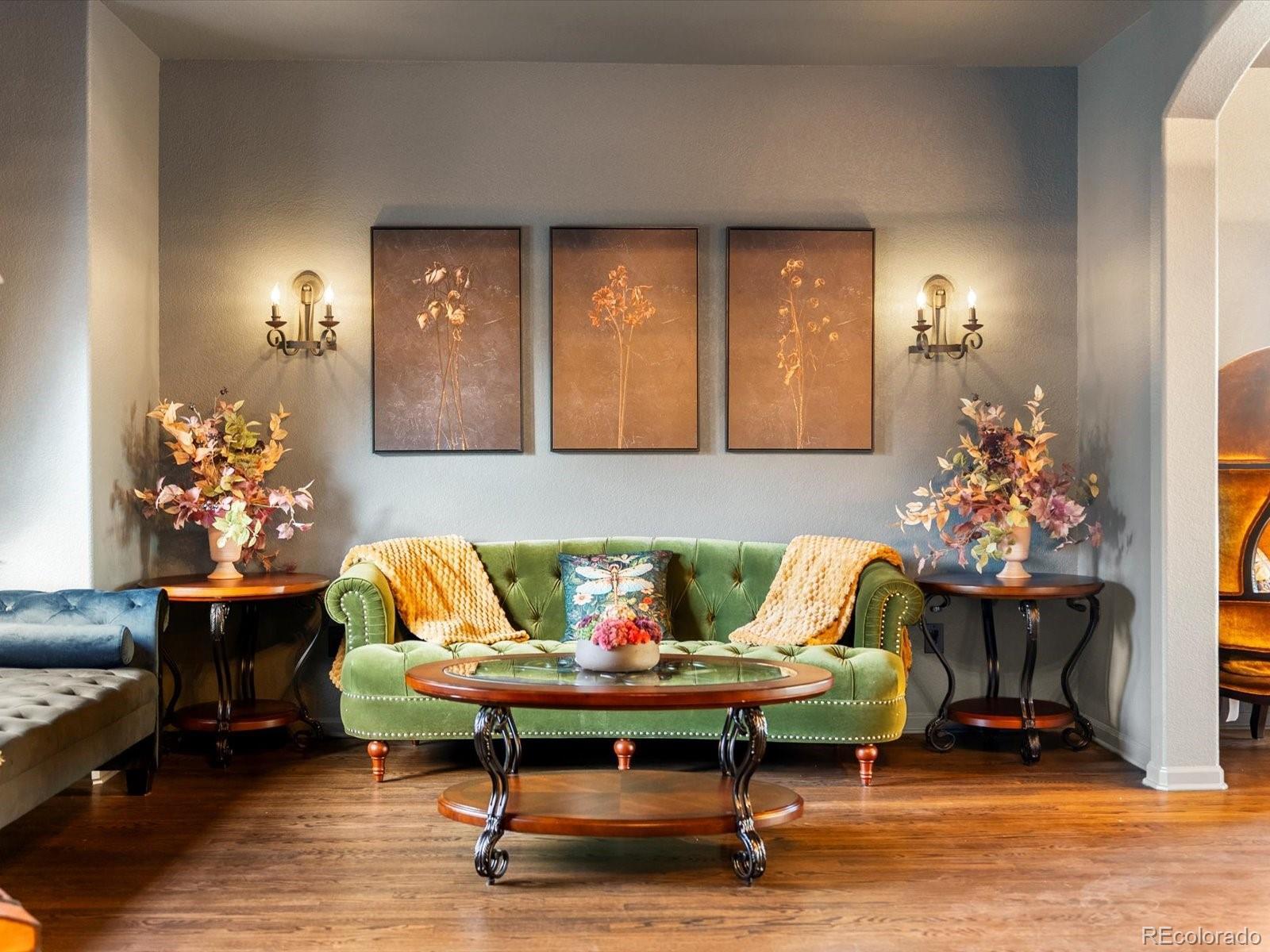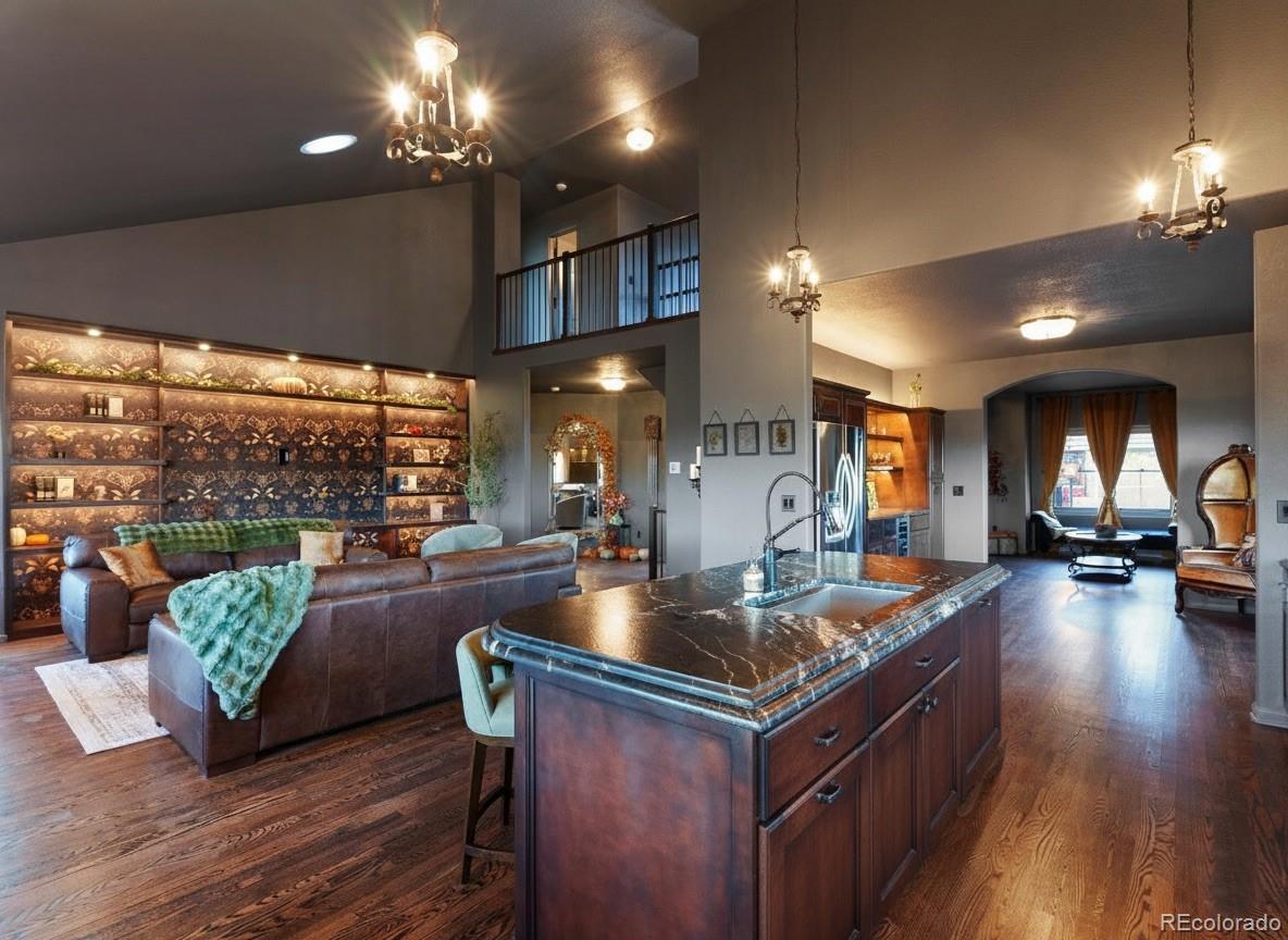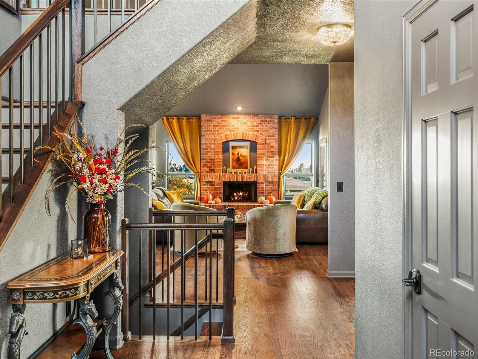 Every so often, a home captures not just the eye—but the imagination. Welcome to 370 Golden Eagle Drive, a designer-remodeled showpiece gracefully perched along the fairways of Eagle Trace Golf Club, where timeless architecture meets inspired artistry. From its elegant custom wood entry door to the warm glow gleaming through oversized windows at sunset, every detail whispers of quality & sophistication. Inside, rich hardwood floors anchor an open & inviting layout where light, texture, and design converge. The great room exudes warmth & grandeur with its floor-to-ceiling brick fireplace, vaulted ceilings & hand-finished accent wall, a space that feels equal parts cinematic and intimate.The kitchen is a triumph of form & function, crafted for both the gourmet & the entertainer. A dramatic Titanium Gold leathered finished island, bespoke cabinetry & designer lighting complement a built-in breakfast nook framed by golf-course views. For entertaining & function, we highlight the double Bosch dishwashers & luxurious parquet tiled Butler’s Pantry w/ wine cooler seamlessly connecting the kitchen to the elegant entry sitting room. The main-level primary suite is pure indulgence, a retreat of texture & tranquility. A rustic stone hearth & chandelier set the tone for evenings by the fire, while the spa-inspired bath blends modern elegance w/ old-world charm through black marble counters, gold-framed mirrors, voice command toilet & artisan lighting. Upstairs are 3 add'l bedrooms, while the walk-out lower level extends the home’s living experience w/ a built-in theater room, game area & seamless outdoor access. Outside, the redwood deck & manicured landscape open to panoramic mtn vistas and the lush greens of Eagle Trace—a front-row seat to Colorado’s four-season beauty. Blending European sophistication with Colorado soul, this one-of-a-kind residence is more than a home; it’s a work of art designed for those who appreciate the extraordinary.