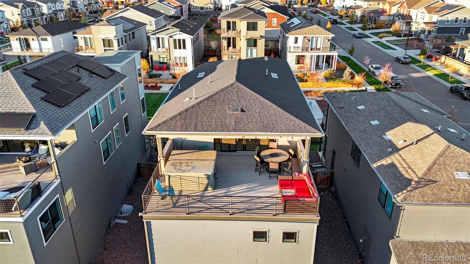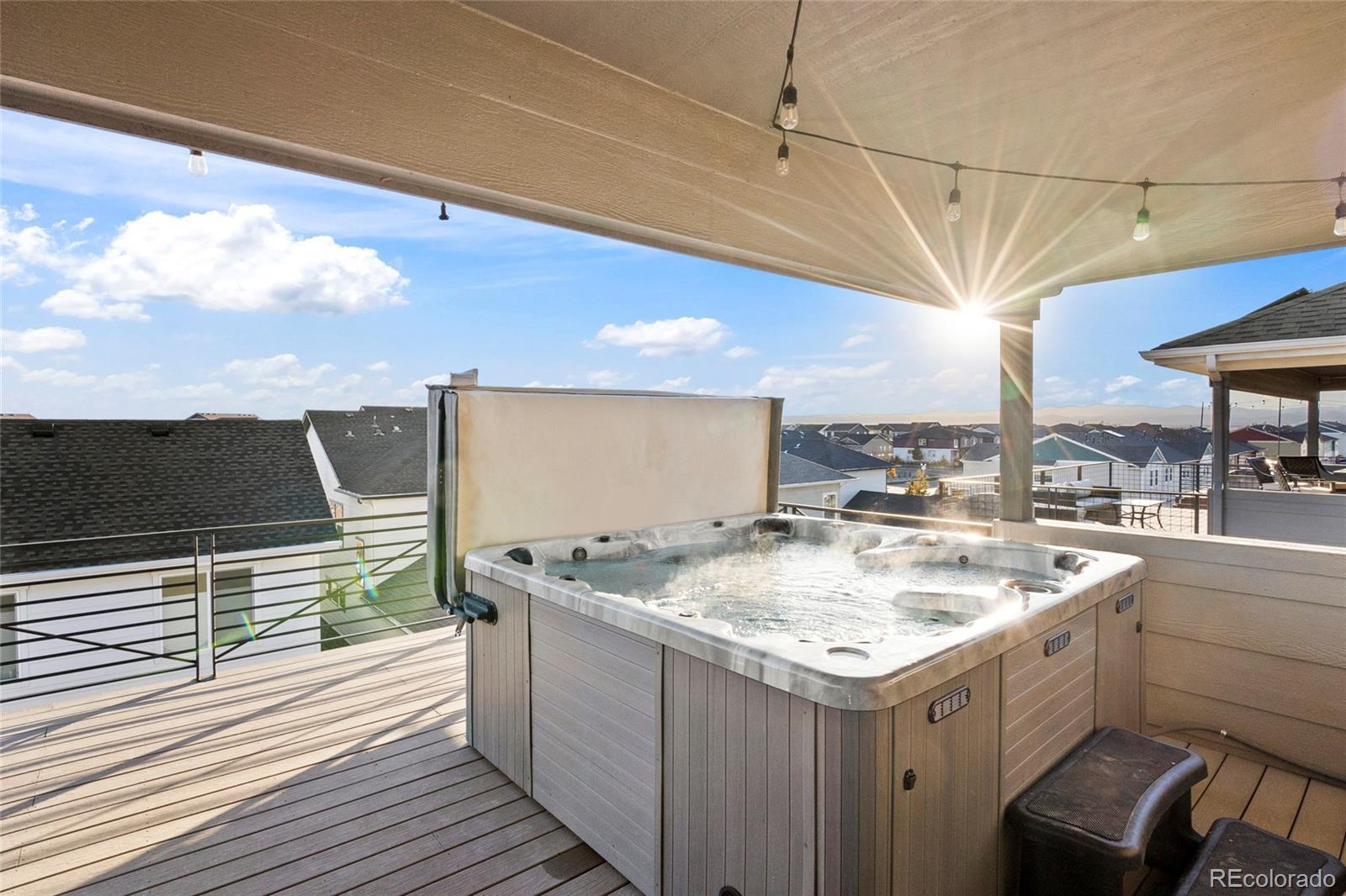 The best-priced three-story home currently available in Painted Prairie for its model, featuring premium upgrades throughout. The main level offers a fully upgraded chef’s kitchen with granite counters, gas range, stainless appliances, and an open-concept layout centered around a large island. Upstairs, the primary suite is spacious and private with its own en suite bath and direct access to a wraparound balcony for true indoor-outdoor living. The third level is truly an entertainer’s dream, with an entire floor dedicated to fun, a wet bar, custom mini fridge, and direct access to a huge, partially covered sky deck with a reverse-osmosis hot tub. The basement is rough-in plumbed and ready for future expansion. Where else can you get unobstructed mountain and city views at this price point in this area? This home delivers lifestyle, luxury, and unmatched value in one!