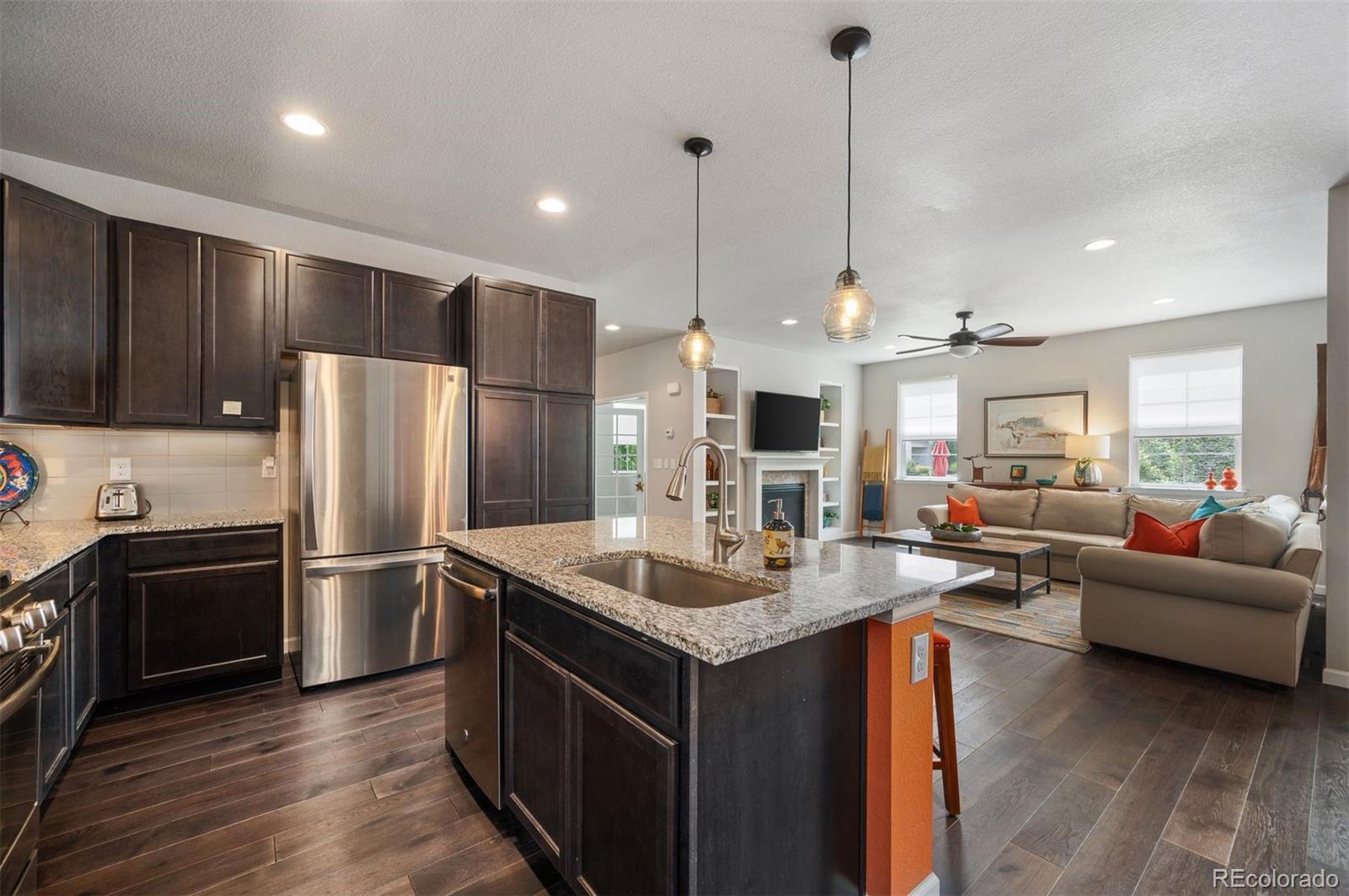 Fabulous two-story home on a premium corner lot with a 3-car garage! Step inside this spacious home to find rich hardwood flooring throughout the main level, office, dining, mudroom, built-ins, ceiling fan, and cozy gas fireplace. The light-filled, open floor plan is perfect for relaxing with family or entertaining with friends. The large eat-in kitchen features ample storage space, convenient center island, stainless appliances, and granite countertops. Upstairs you’ll find a sizable primary suite with decorative barn door and 5-piece bath, two secondary bedrooms, full bath, loft, and laundry room. The basement offers additional bedroom and living space, two egress windows, bathroom, and bar area. Additional upgrades include paint, lighting, two finished side yards with pavers & grass, and a whole house water filtration system. Nestled in the heart of Littleton Village in a coveted courtyard setting, this beautiful home is just steps away from the community playground, park, trails, retail, and dining. Don’t miss it!