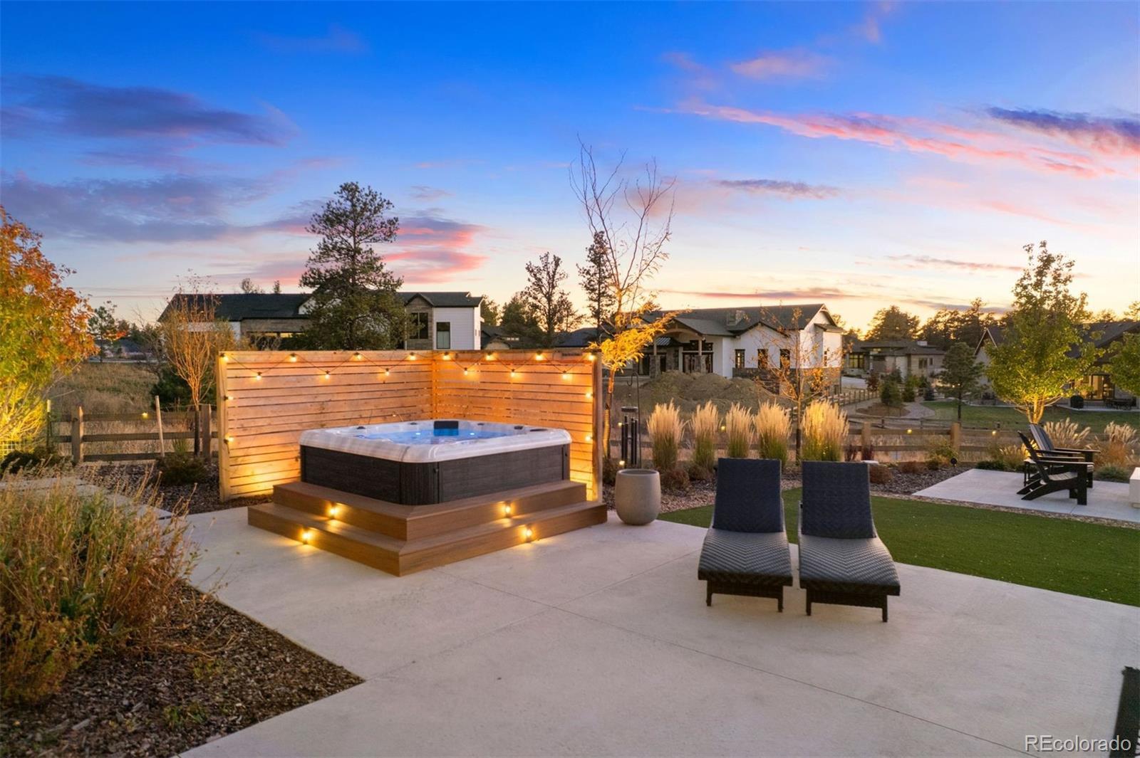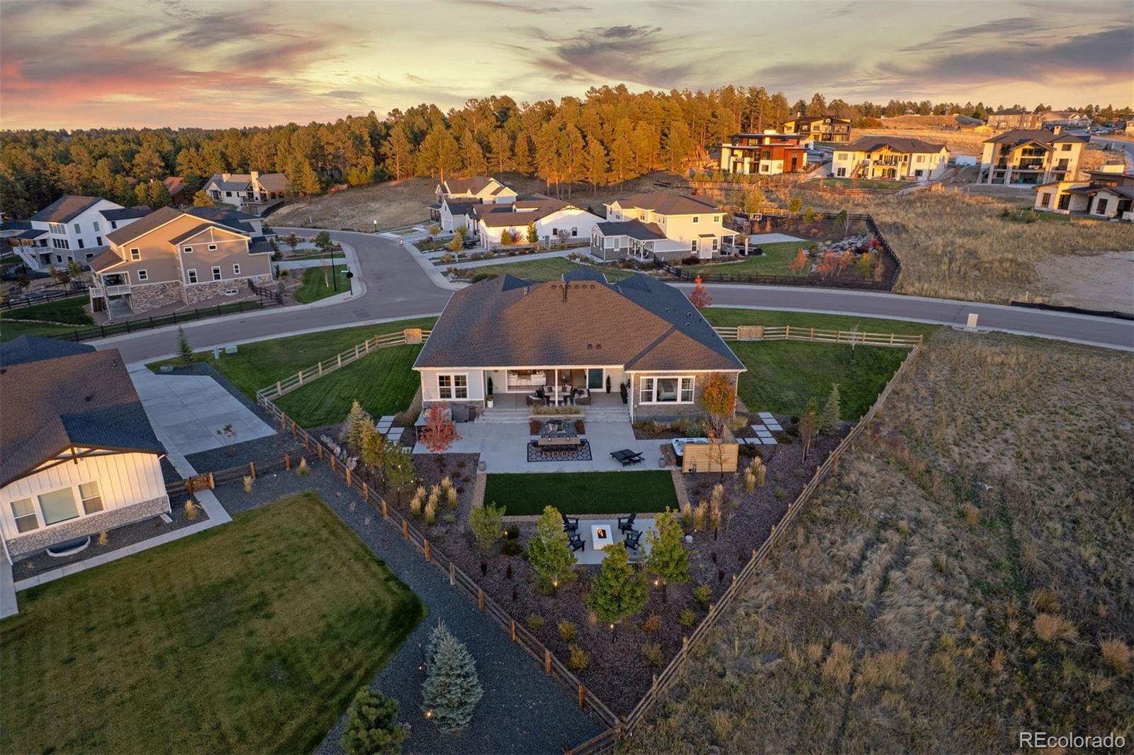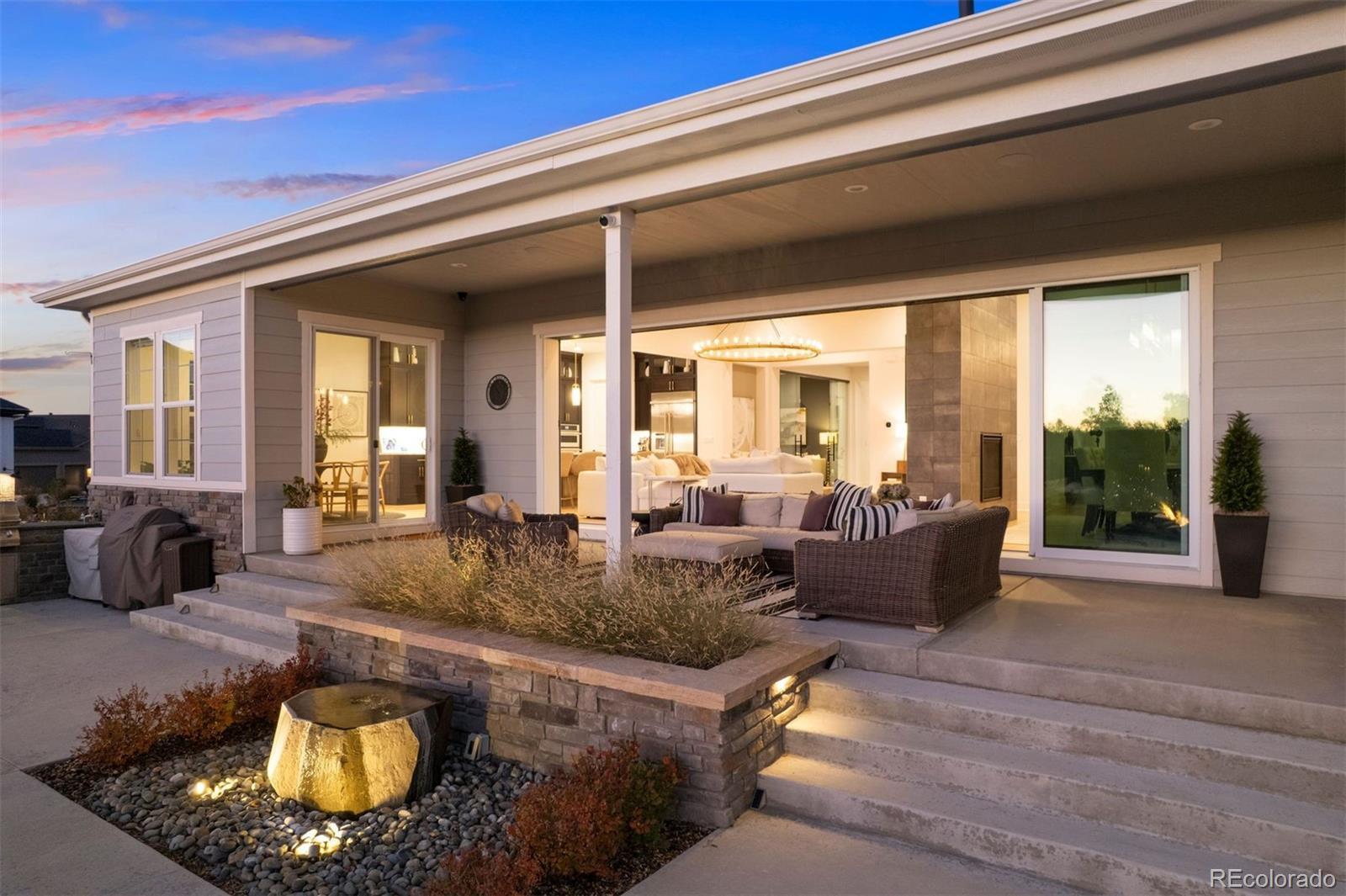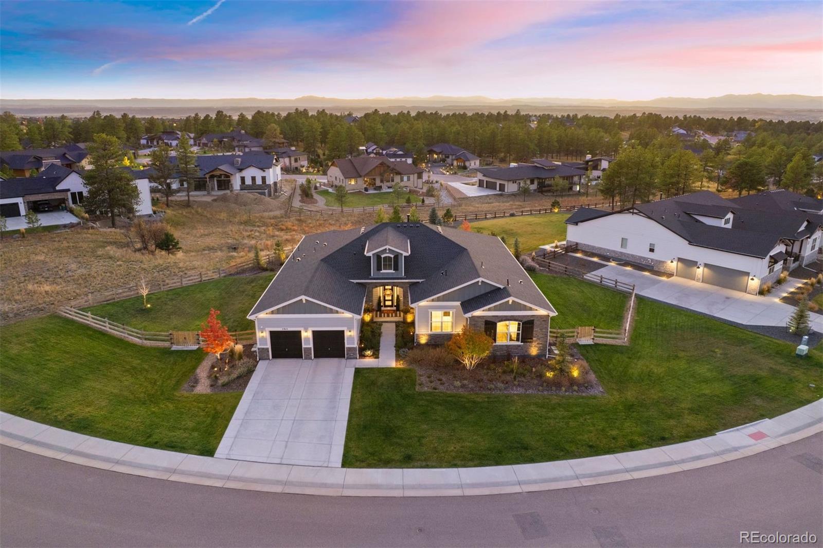Nestled on a premier private homesite in the coveted Timbers at the Pinery, this exceptional ranch-style home offers refined Colorado living at its finest. Featuring four bedrooms and five bathrooms, the residence is filled with natural light, soaring ceilings, and exquisite craftsmanship throughout. The welcoming entry opens to 12-foot beamed ceilings and an open floor plan that seamlessly connects the dining area, custom two-sided fireplace, and spacious living room. Expansive 24-foot stacked sliding patio doors create effortless indoor-outdoor living. The gourmet kitchen overlooks the living space and showcases a 10-foot waterfall island, custom cabinetry to the ceiling, four ovens, a 48-inch professional range, built-in 42-inch refrigerator, designated eating area and a large walk-in pantry. The backyard is a private entertainer’s retreat with an expansive patio, stunning western sunset and mountain views, built-in fire pit, hot tub, built in grill and wet bar area, and ample grassy space. Inside, Restoration Hardware lighting, 8-inch white oak floors, and timeless finishes reflect thoughtful attention to detail. The main-floor primary suite overlooks the backyard and features a spa-like five-piece bath and custom walk-in closet. Two additional ensuite bedrooms, a main-floor office with glass French doors, and a functional mudroom and laundry complete the main level. The remodeled lower level is designed for entertaining with a large recreation room, game room, fully equipped wet bar, surround sound, and Control4 system throughout the home and outdoor spaces. A guest bedroom, exercise room or optional fifth bedroom, and generous storage complete the lower level. Residents of the Timbers have the option to join the Pinery Country Club or the Golf Club at Pradera, offering world-class golf, fitness, swimming, and social amenities. This is more than a home—it’s a true reflection of the Colorado lifestyle.
