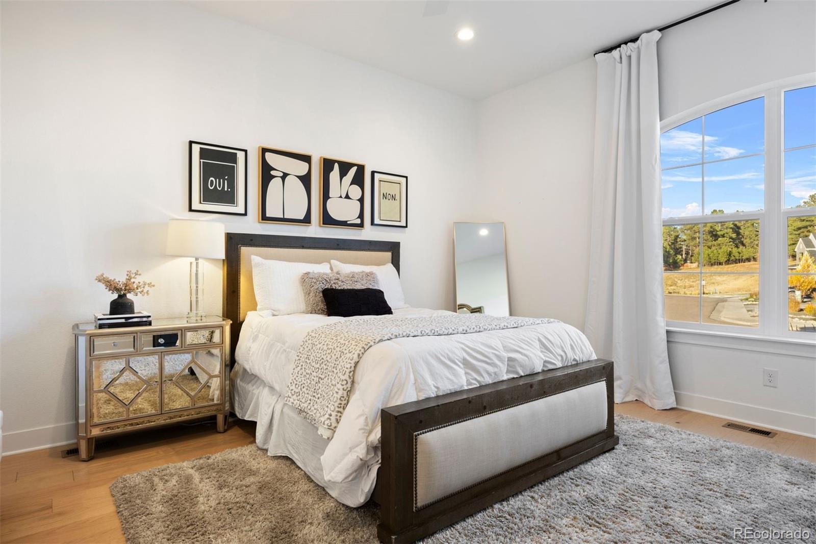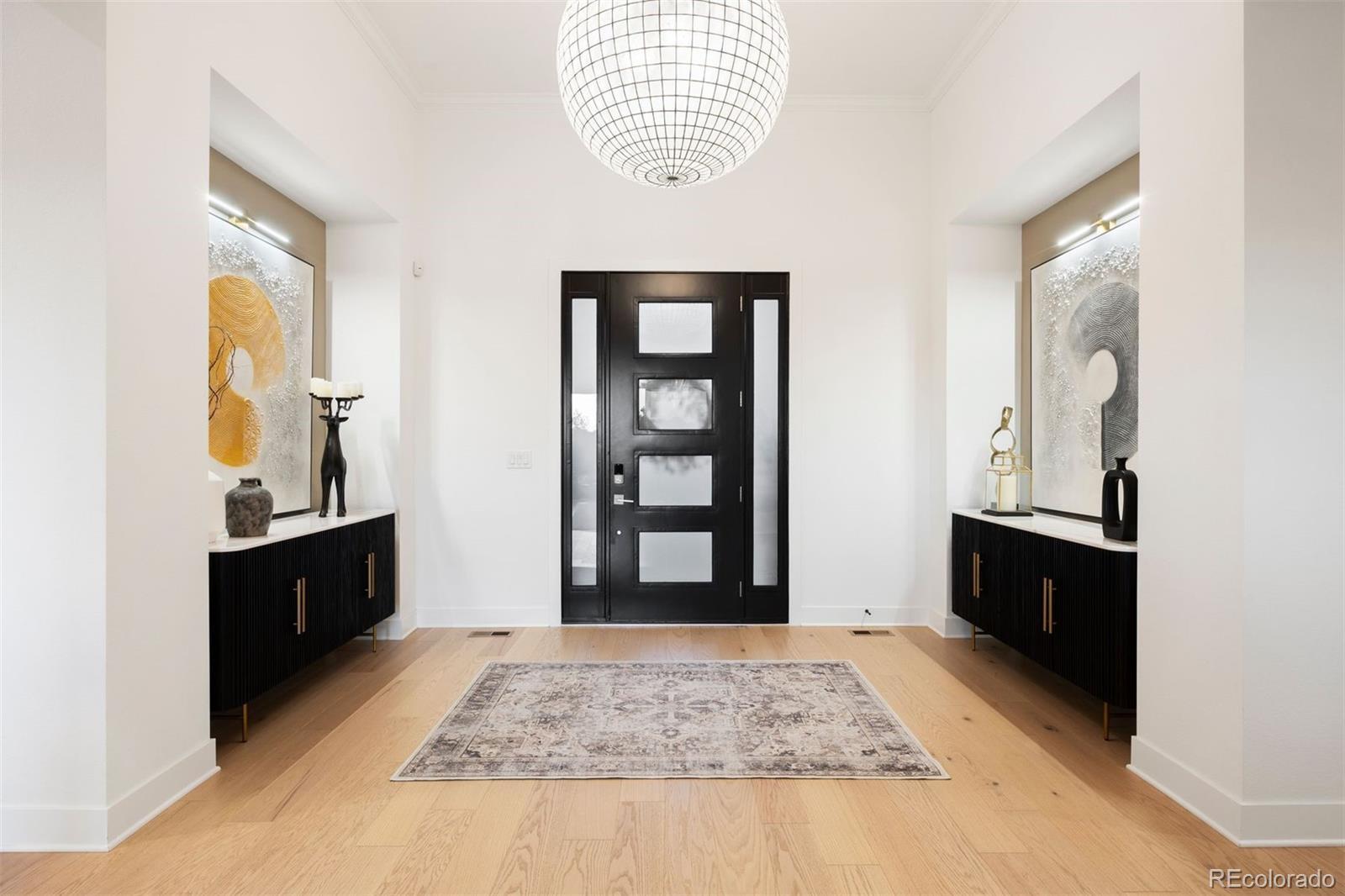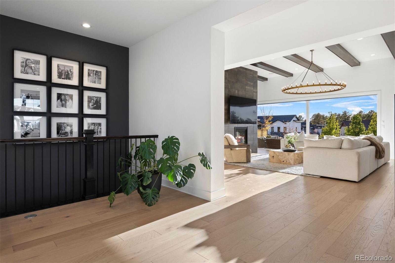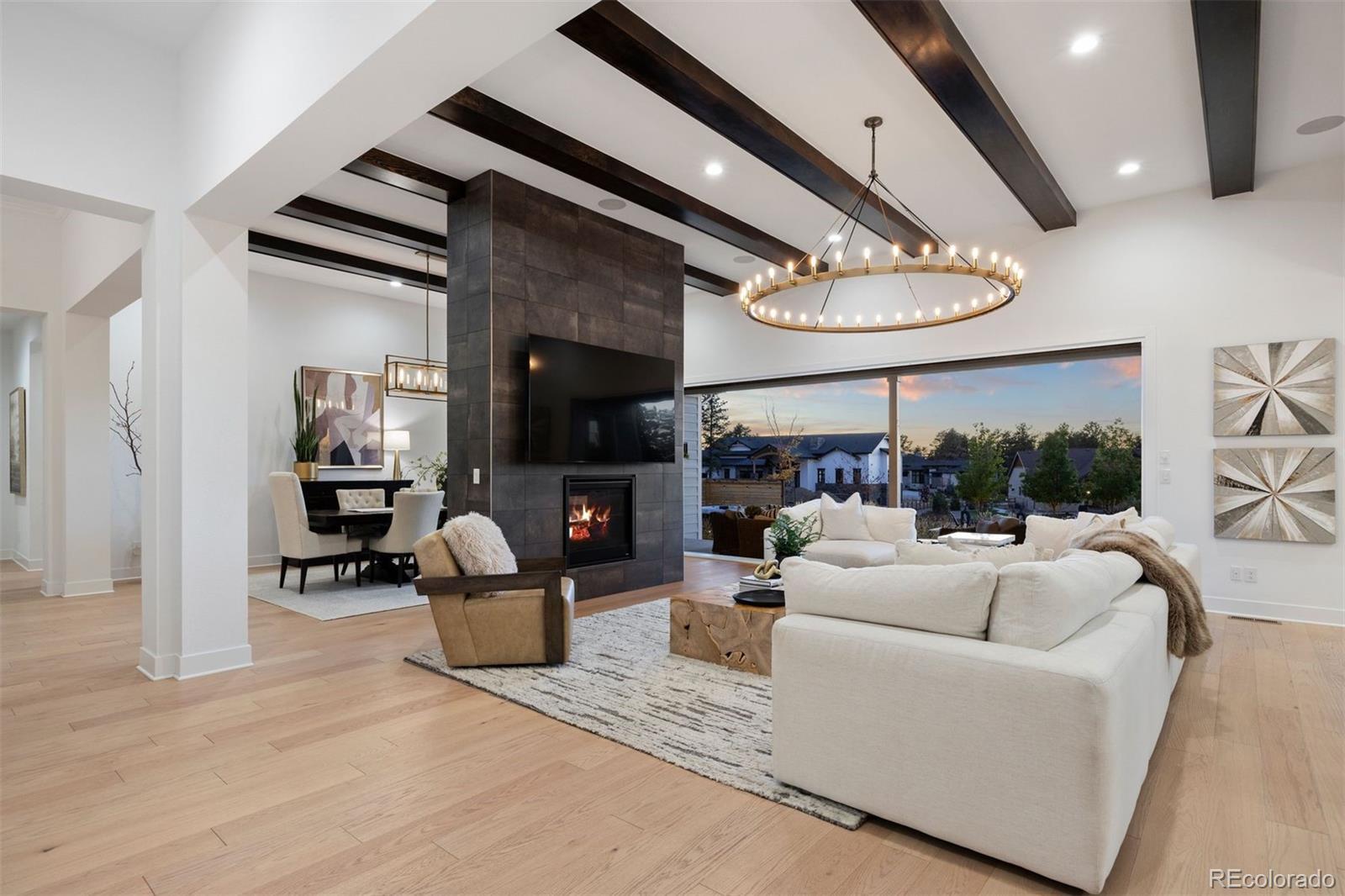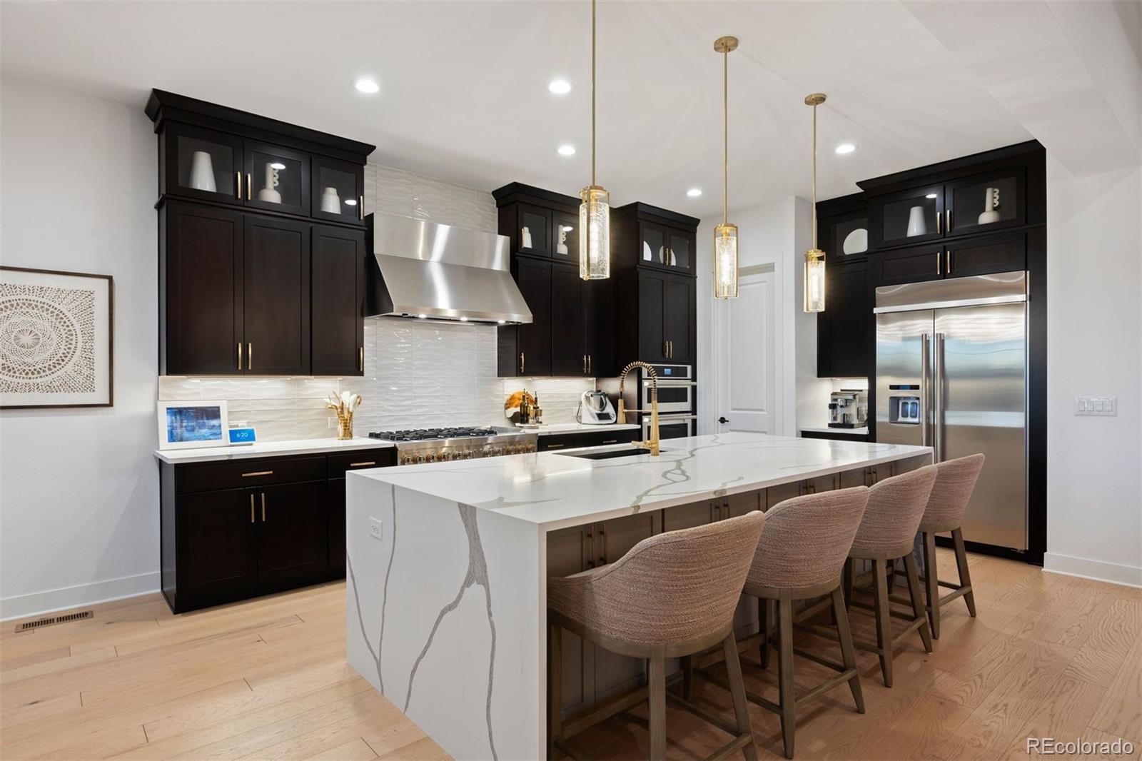 Nestled on a premier private homesite in the coveted Timbers at the Pinery, this exceptional ranch-style home offers refined Colorado living at its finest. Featuring four bedrooms and five bathrooms, the residence is filled with natural light, soaring ceilings, and exquisite craftsmanship throughout. The welcoming entry opens to 12-foot beamed ceilings and an open floor plan that seamlessly connects the dining area, custom two-sided fireplace, and spacious living room. Expansive 24-foot stacked sliding patio doors create effortless indoor-outdoor living. The gourmet kitchen overlooks the living space and showcases a 10-foot waterfall island, custom cabinetry to the ceiling, four ovens, a 48-inch professional range, built-in 42-inch refrigerator, designated eating area and a large walk-in pantry. The backyard is a private entertainer’s retreat with an expansive patio, stunning western sunset and mountain views, built-in fire pit, hot tub, built in grill and wet bar area, and ample grassy space. Inside, Restoration Hardware lighting, 8-inch white oak floors, and timeless finishes reflect thoughtful attention to detail. The main-floor primary suite overlooks the backyard and features a spa-like five-piece bath and custom walk-in closet. Two additional ensuite bedrooms, a main-floor office with glass French doors, and a functional mudroom and laundry complete the main level. The remodeled lower level is designed for entertaining with a large recreation room, game room, fully equipped wet bar, surround sound, and Control4 system throughout the home and outdoor spaces. A guest bedroom, exercise room or optional fifth bedroom, and generous storage complete the lower level. Residents of the Timbers have the option to join the Pinery Country Club or the Golf Club at Pradera, offering world-class golf, fitness, swimming, and social amenities. This is more than a home—it’s a true reflection of the Colorado lifestyle.