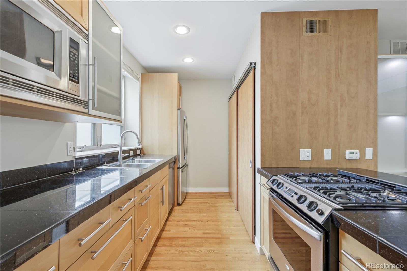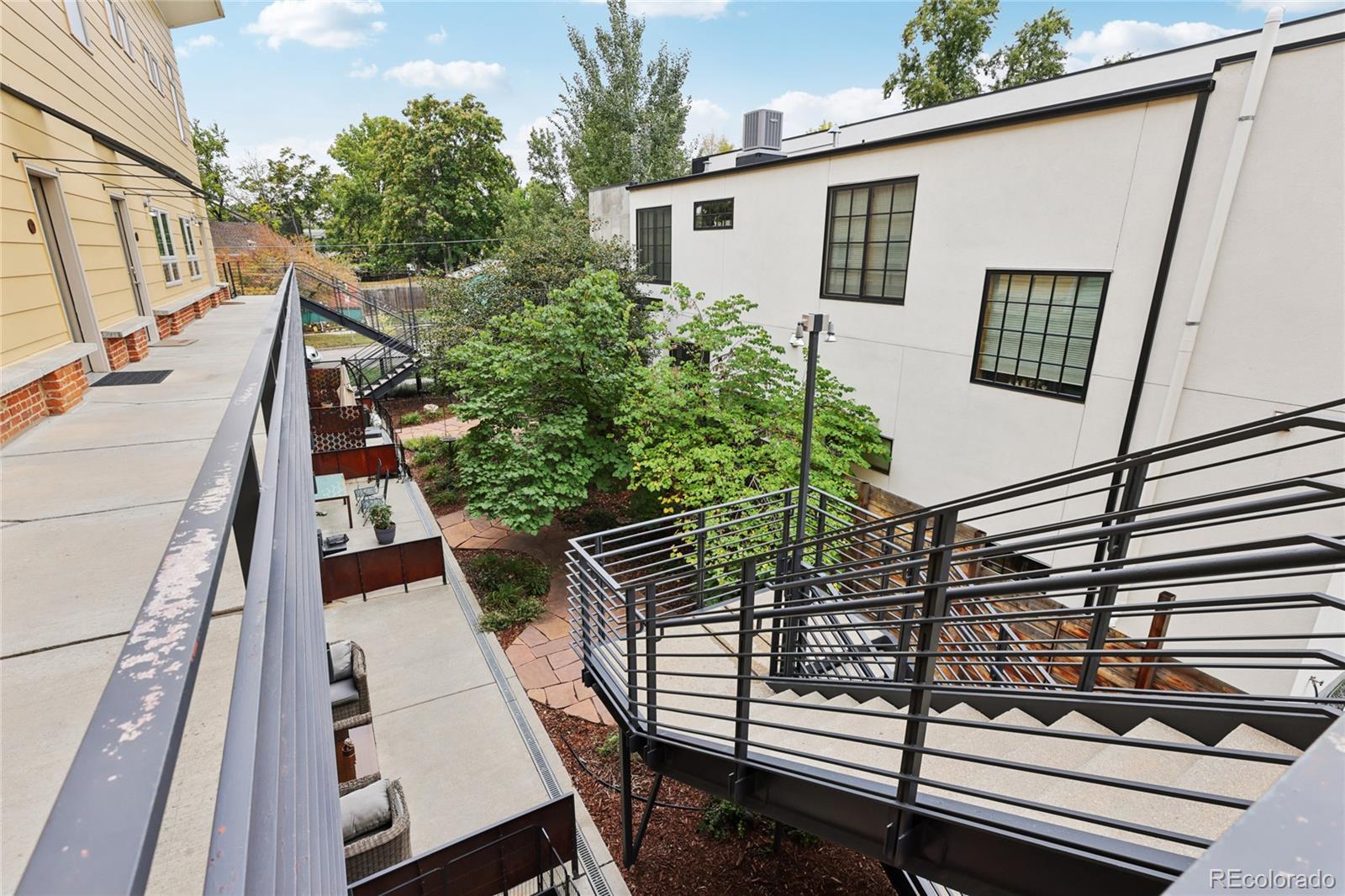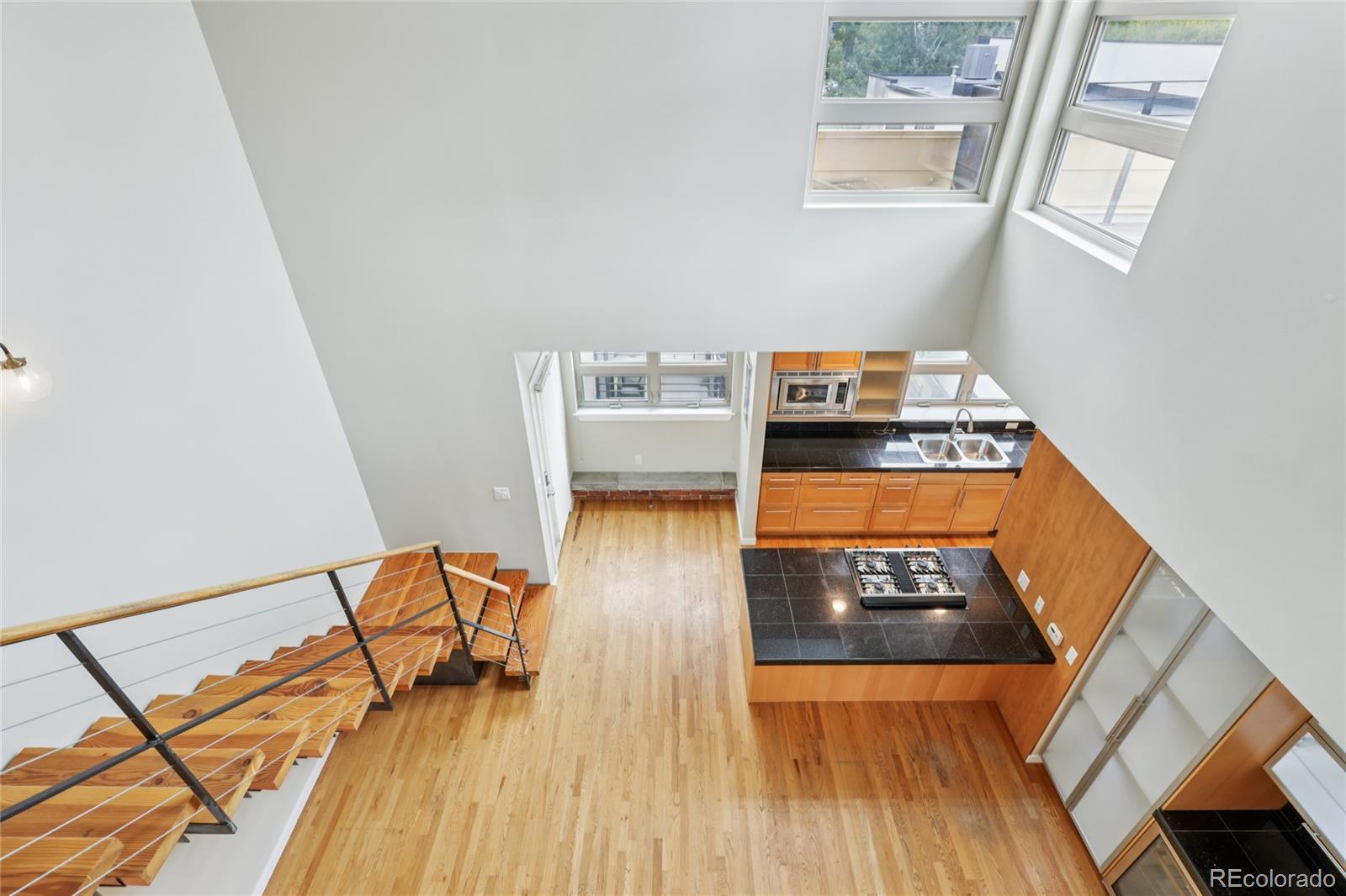 Welcome to this stunning two-level townhome-style condo in the heart of the Highlands neighborhood! Set in a unique, historic building that once served as a school and now houses just a dozen residences, this home blends urban character with modern comfort. Step inside to discover an impressive open living space with soaring ceilings and abundant natural light. The modern kitchen features stainless steel appliances, custom cabinetry, a breakfast bar, and a wine bar with fridge—perfect for entertaining. The dining area flows seamlessly into the spacious living room, creating a warm and inviting atmosphere. The main-level primary suite offers convenient en-suite access to the full bathroom and ample closet space. Upstairs, find a second bedroom with an en-suite bathroom, a large walk-in closet, and sliding glass doors opens to a private deck, great for relaxing or enjoying Colorado's 300 days of sunshine. Additional highlights include stacked in-unit laundry and a detached two-car garage. Enjoy the unbeatable location—just minutes from Sloan’s Lake, LoHi, Jefferson Park, and all the trendy cafés, restaurants, and shops that make this one of Denver’s most sought-after neighborhoods. Urban style, historic charm, and unbeatable location—this home truly has it all!